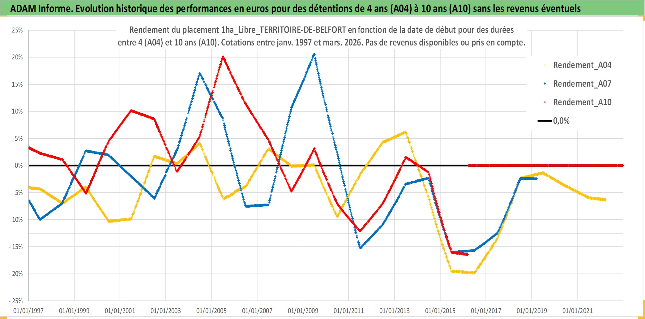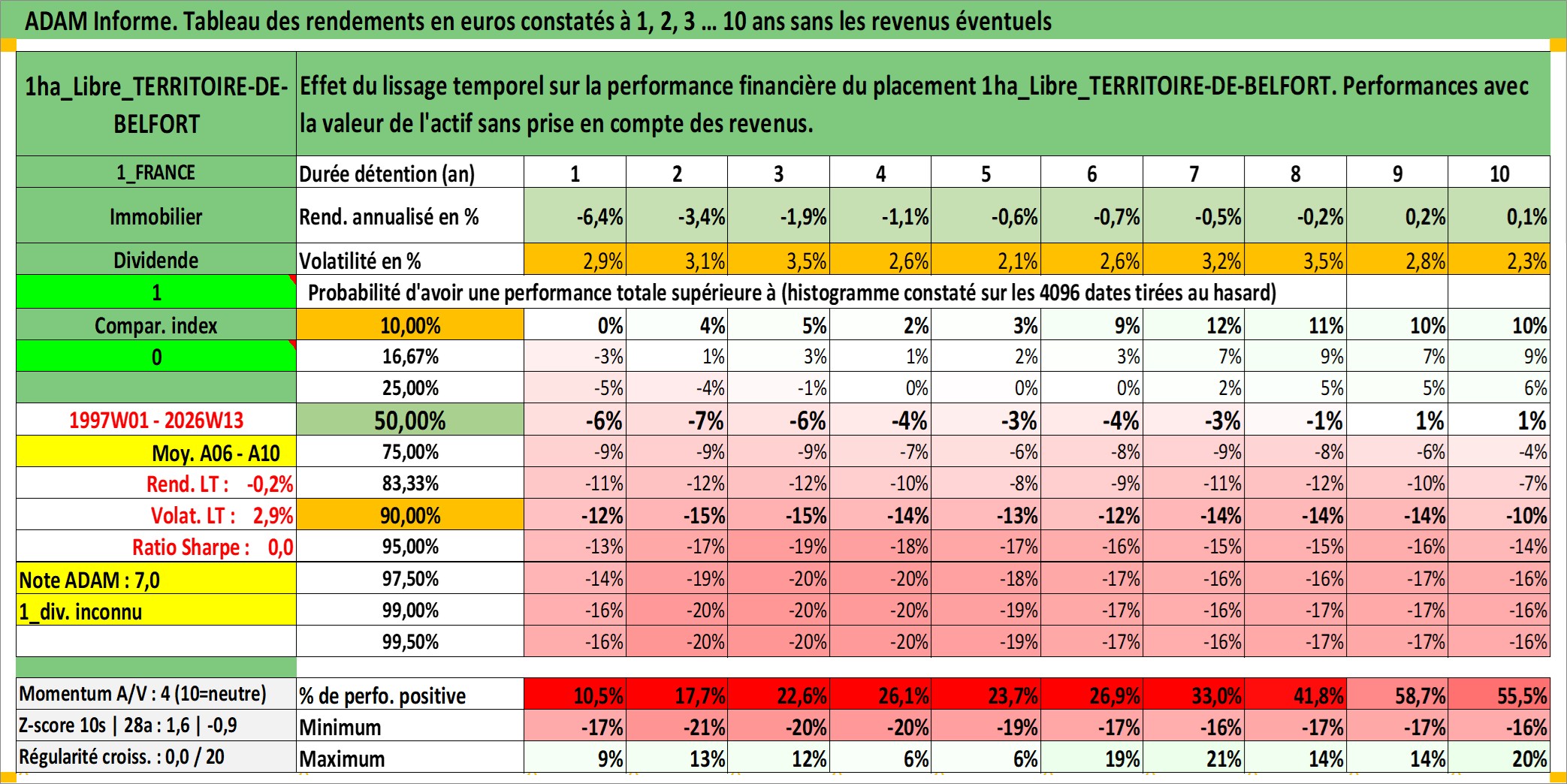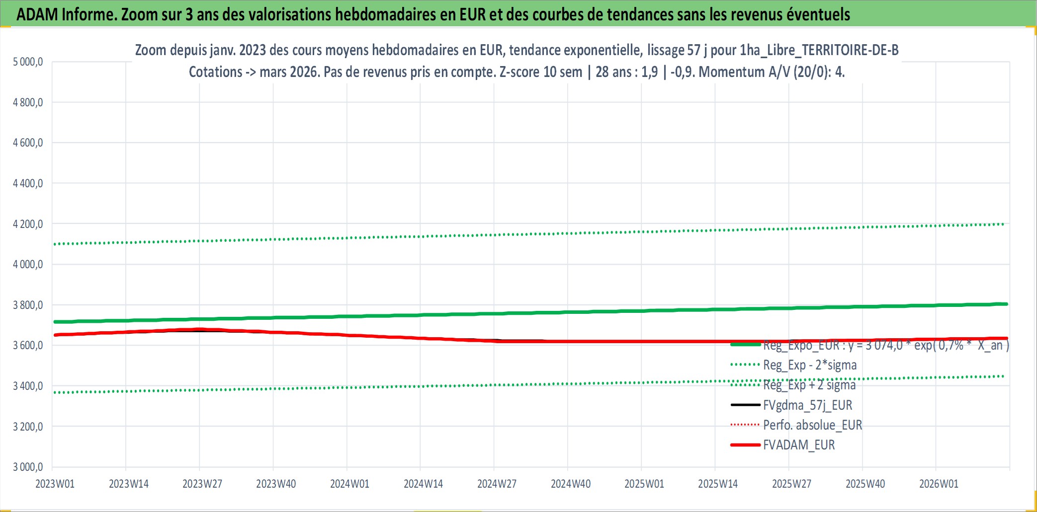 Site dédié aux investisseursPage dédiée sur site financeAnalyse des valorisations hebdomadaires de l'actif 1ha_Libre_TERRITOIRE-DE-BELFORT. Cet actif est cote en EUR. Les valorisations couvrent les semaines 1997W01 a 2026W13. Les fermages de ce bien foncier sont pris egaux a 2,5% annuels de la valeur venale du bien.