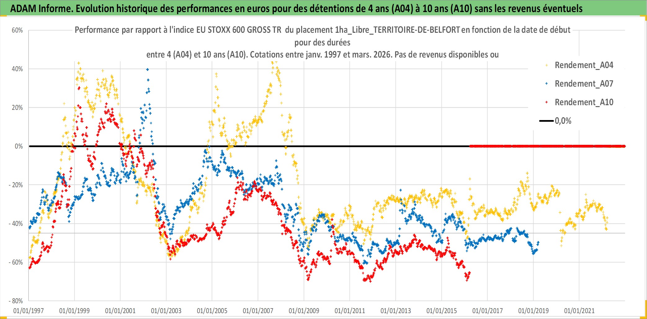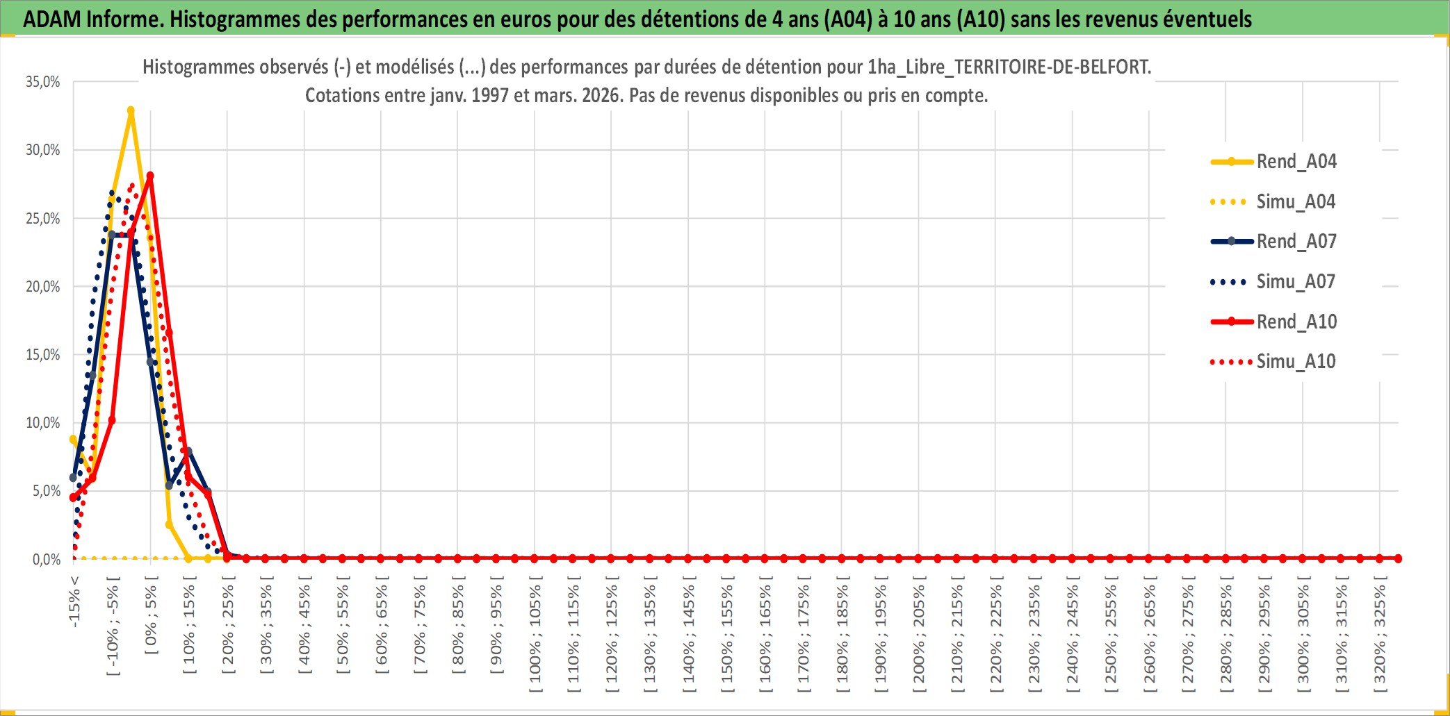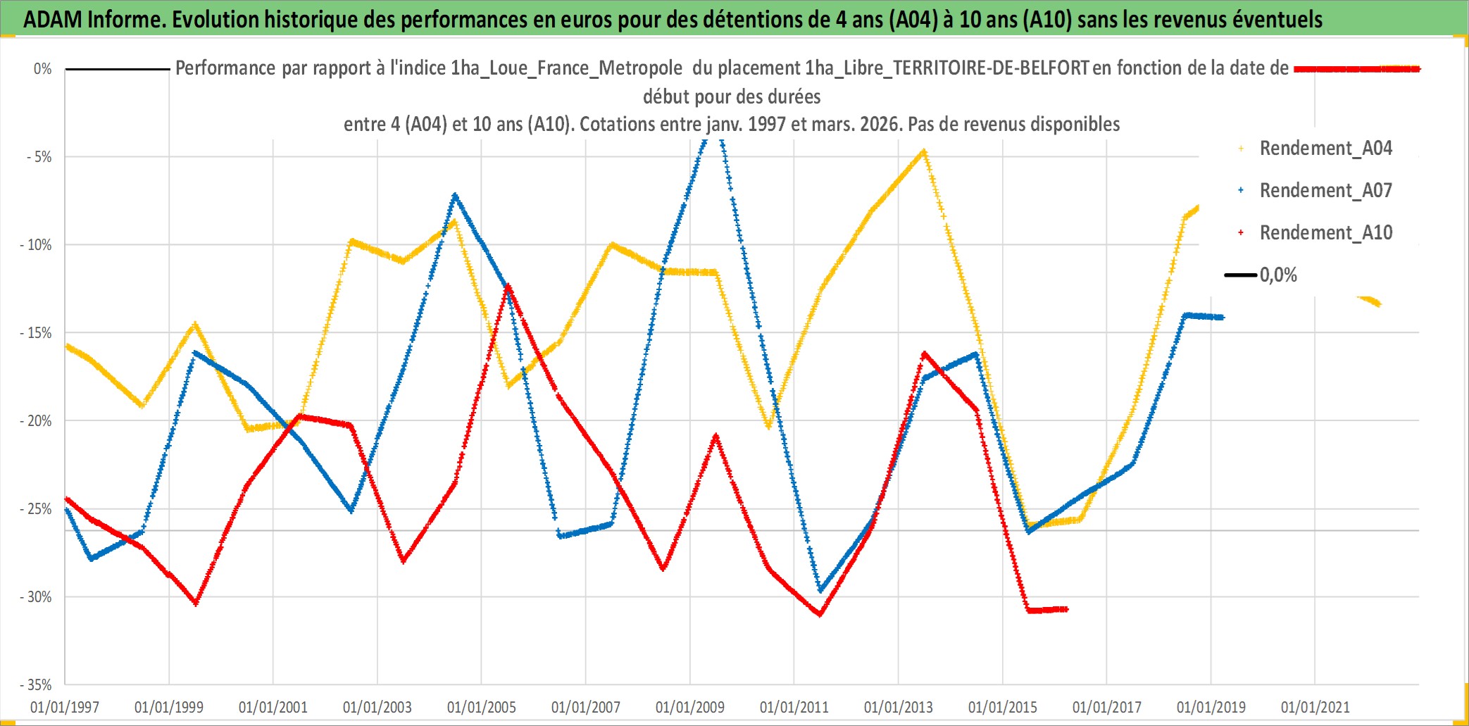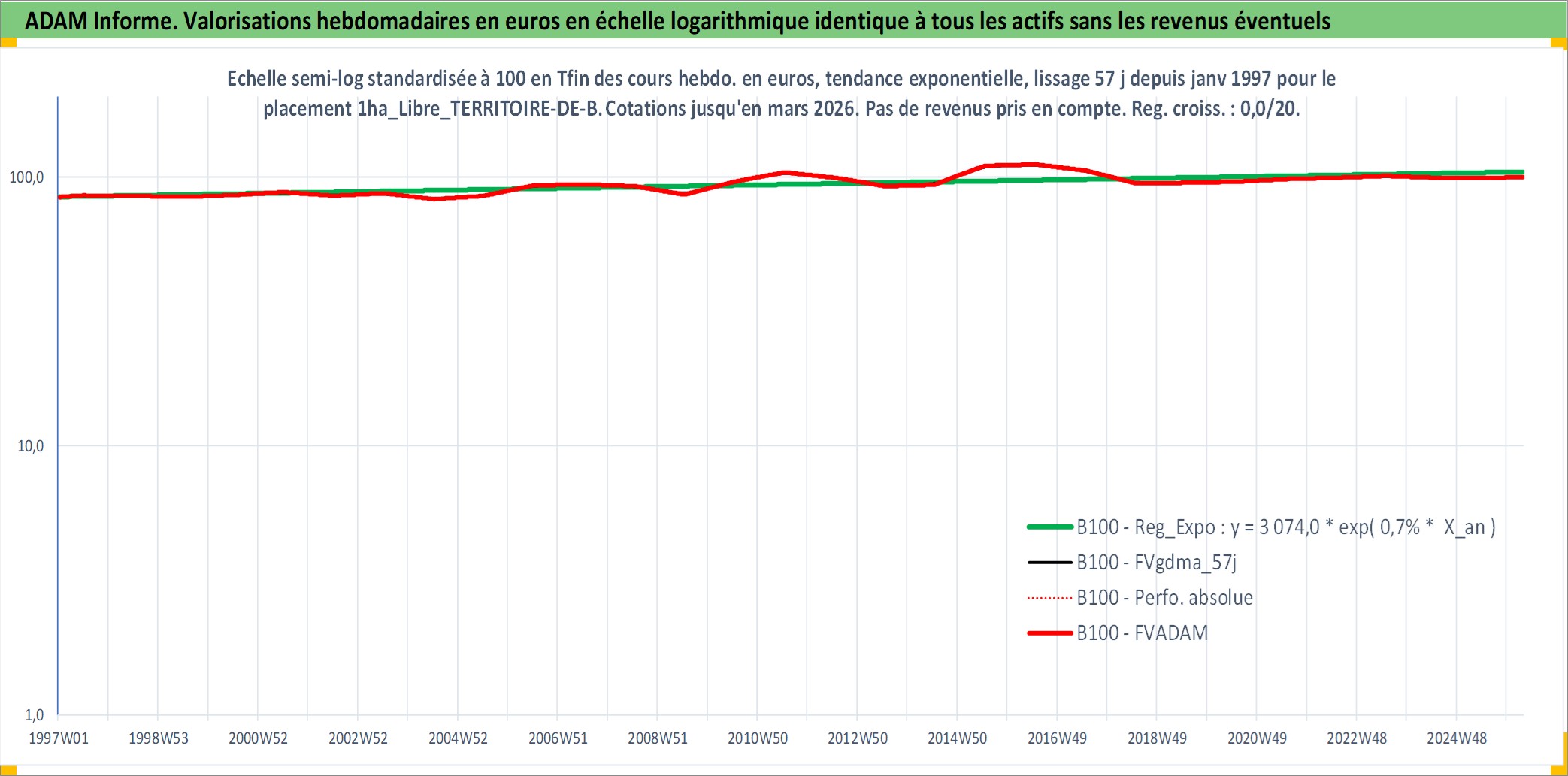 Site dédié aux investisseursPage dédiée sur site financeAnalyse des valorisations hebdomadaires de l'actif 1ha_Libre_TERRITOIRE-DE-BELFORT. Cet actif est cote en EUR. Les valorisations couvrent les semaines 1997W01 a 2026W13. Les fermages de ce bien foncier sont pris egaux a 2,5% annuels de la valeur venale du bien.