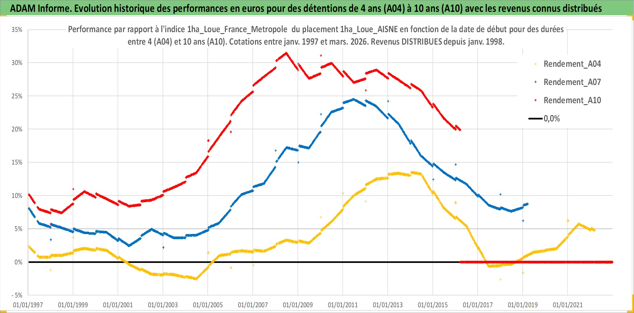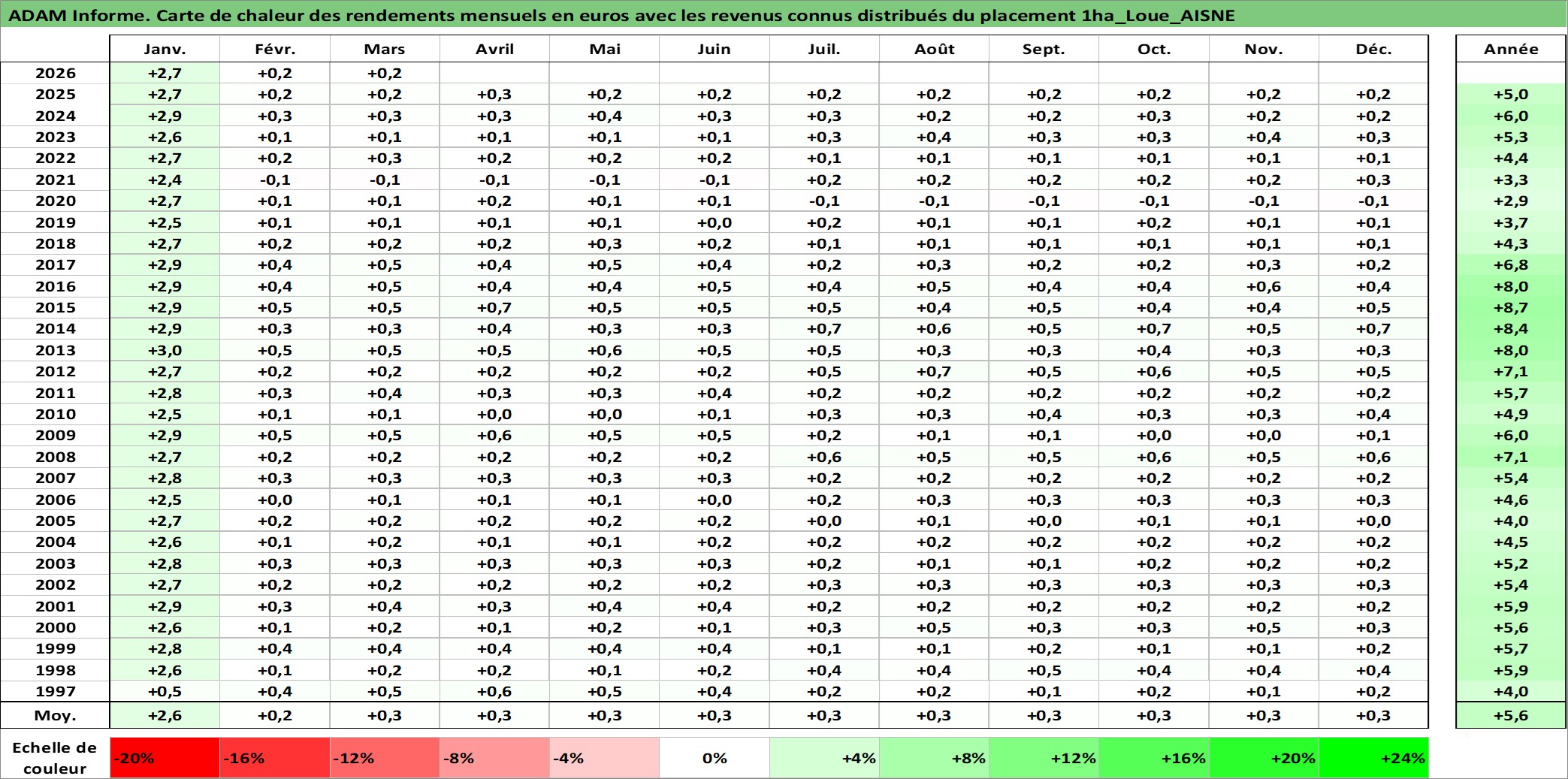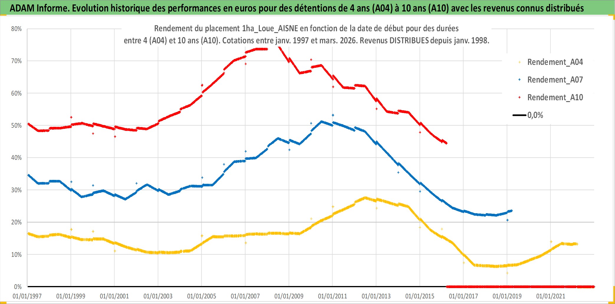 Site dédié aux investisseursPage dédiée sur site financeAnalyse des valorisations hebdomadaires de l'actif 1ha_Loue_AISNE. Cet actif est cote en EUR. Les valorisations couvrent les semaines 1997W01 a 2026W13. Les fermages de ce bien foncier sont pris egaux a 2,5% annuels de la valeur venale du bien.
