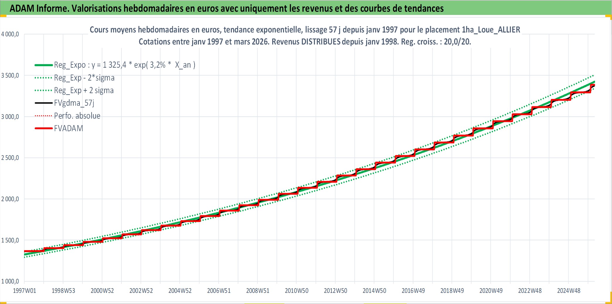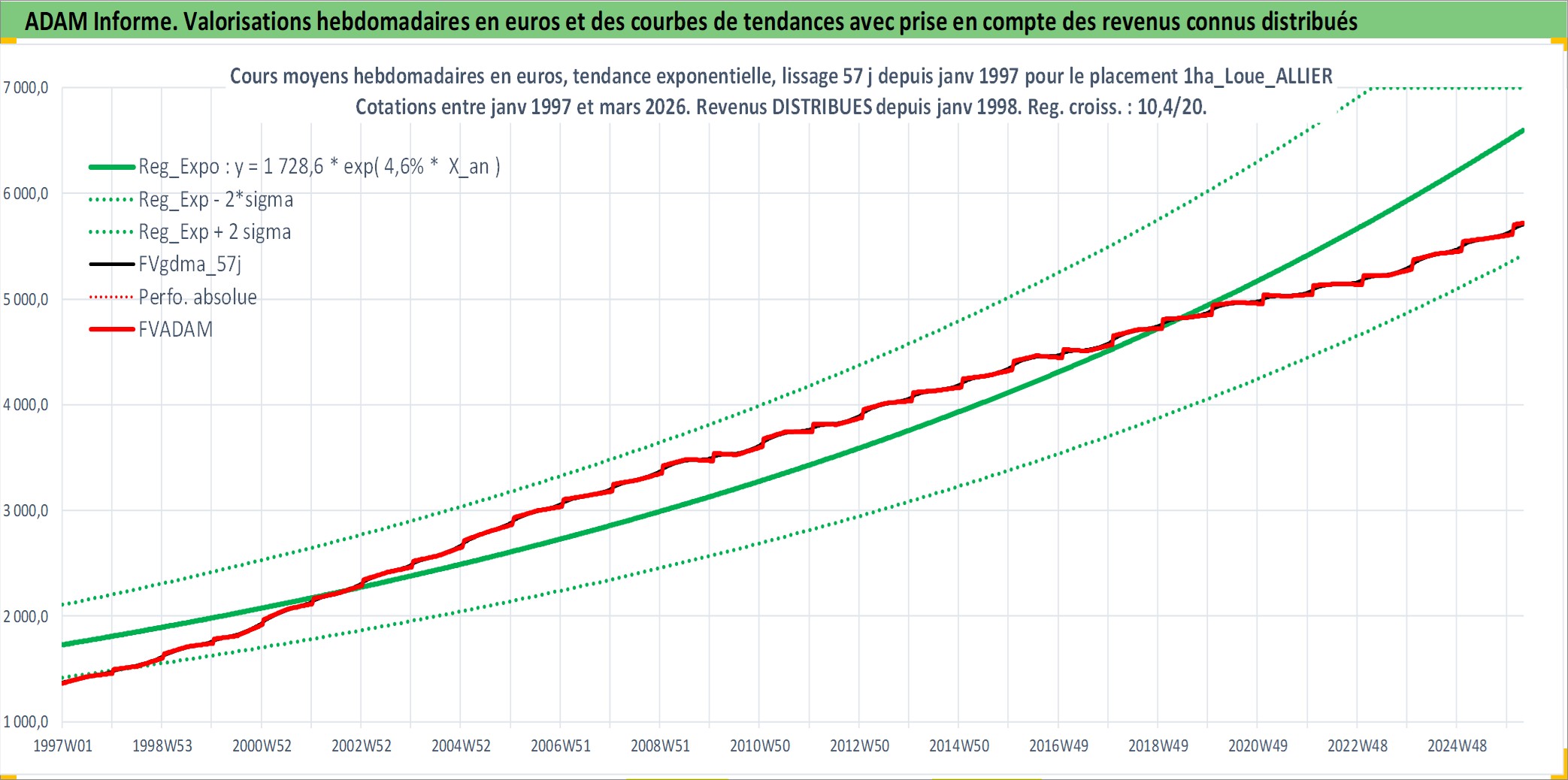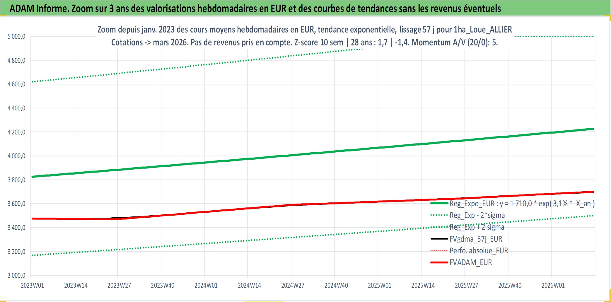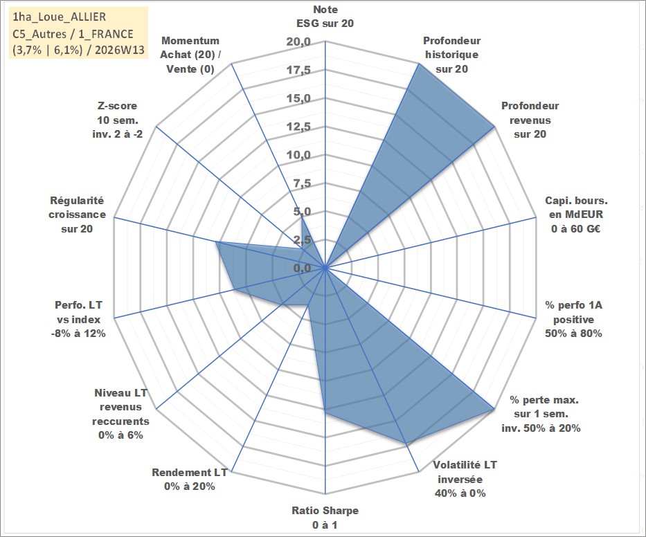 Site dédié aux investisseursPage dédiée sur site financeAnalyse des valorisations hebdomadaires de l'actif 1ha_Loue_ALLIER. Cet actif est cote en EUR. Les valorisations couvrent les semaines 1997W01 a 2026W13. Les fermages de ce bien foncier sont pris egaux a 2,5% annuels de la valeur venale du bien.