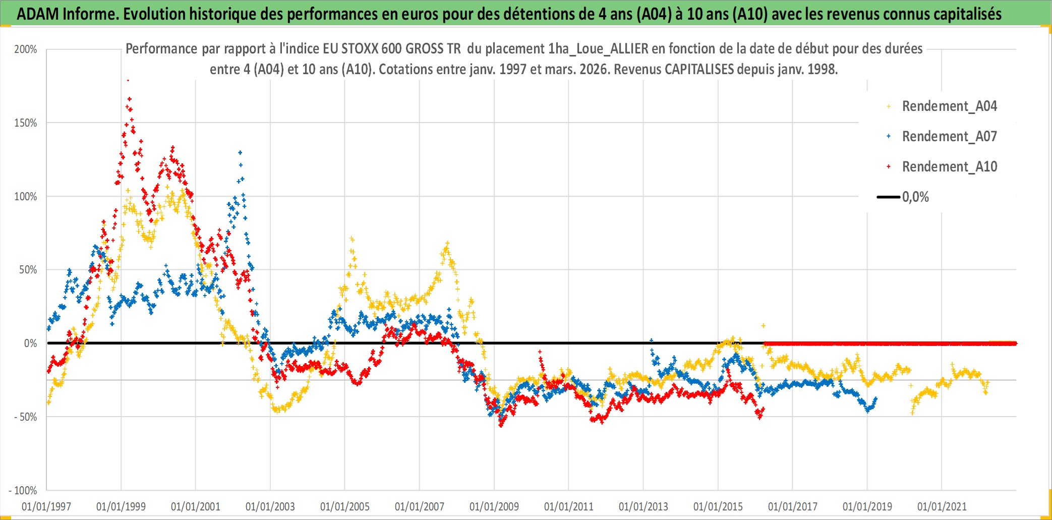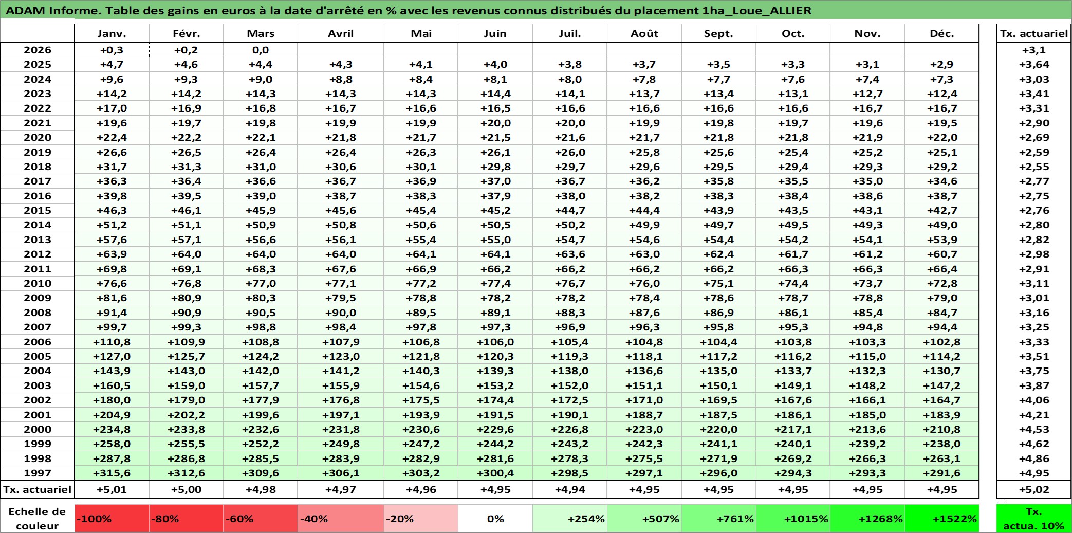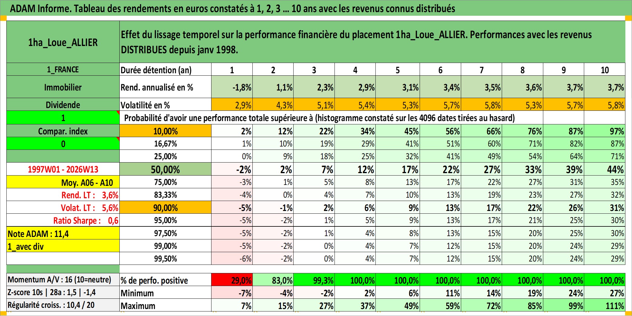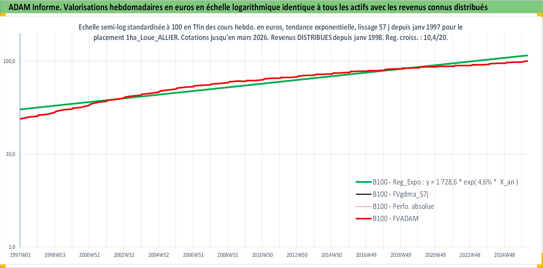 Site dédié aux investisseursPage dédiée sur site financeAnalyse des valorisations hebdomadaires de l'actif 1ha_Loue_ALLIER. Cet actif est cote en EUR. Les valorisations couvrent les semaines 1997W01 a 2026W13. Les fermages de ce bien foncier sont pris egaux a 2,5% annuels de la valeur venale du bien.