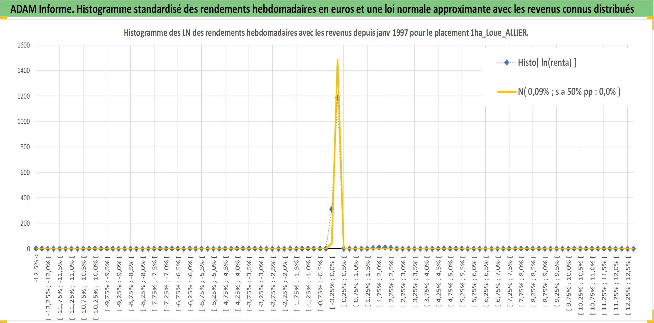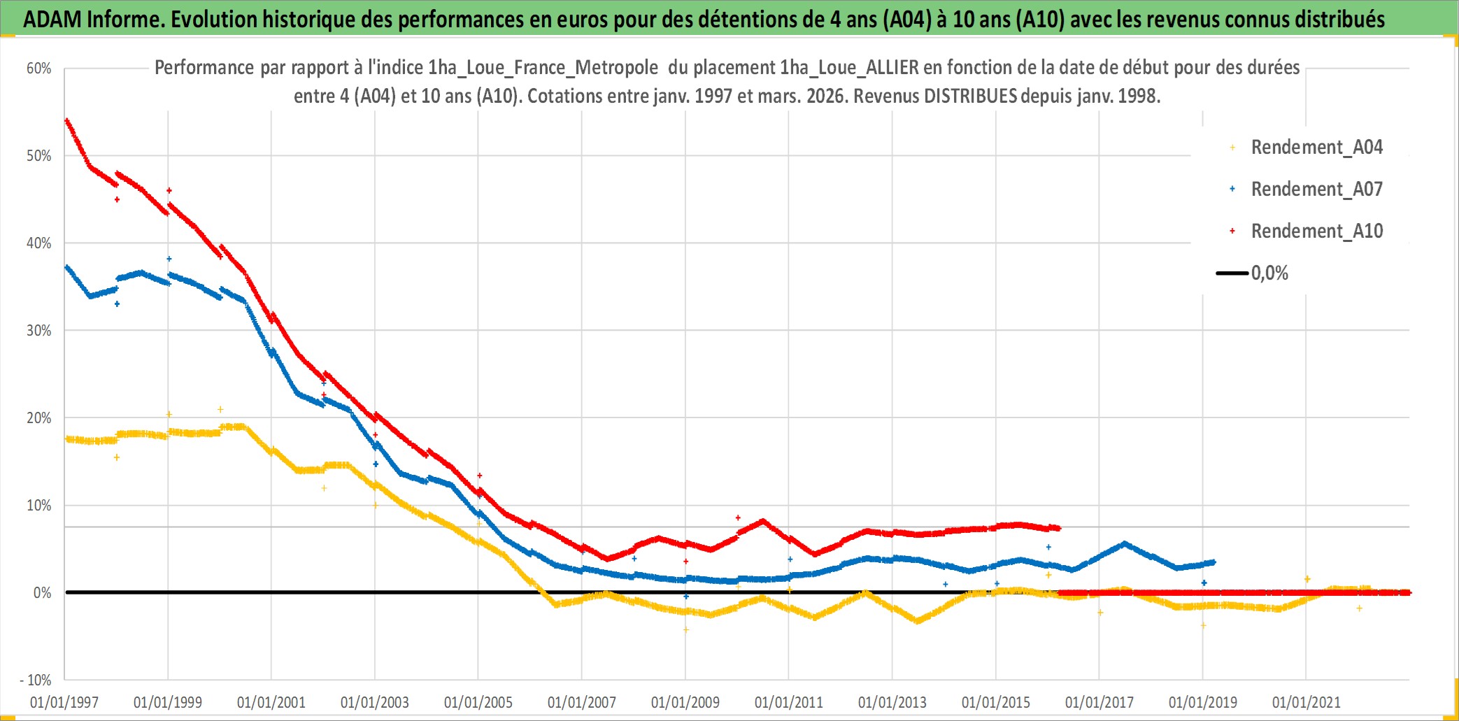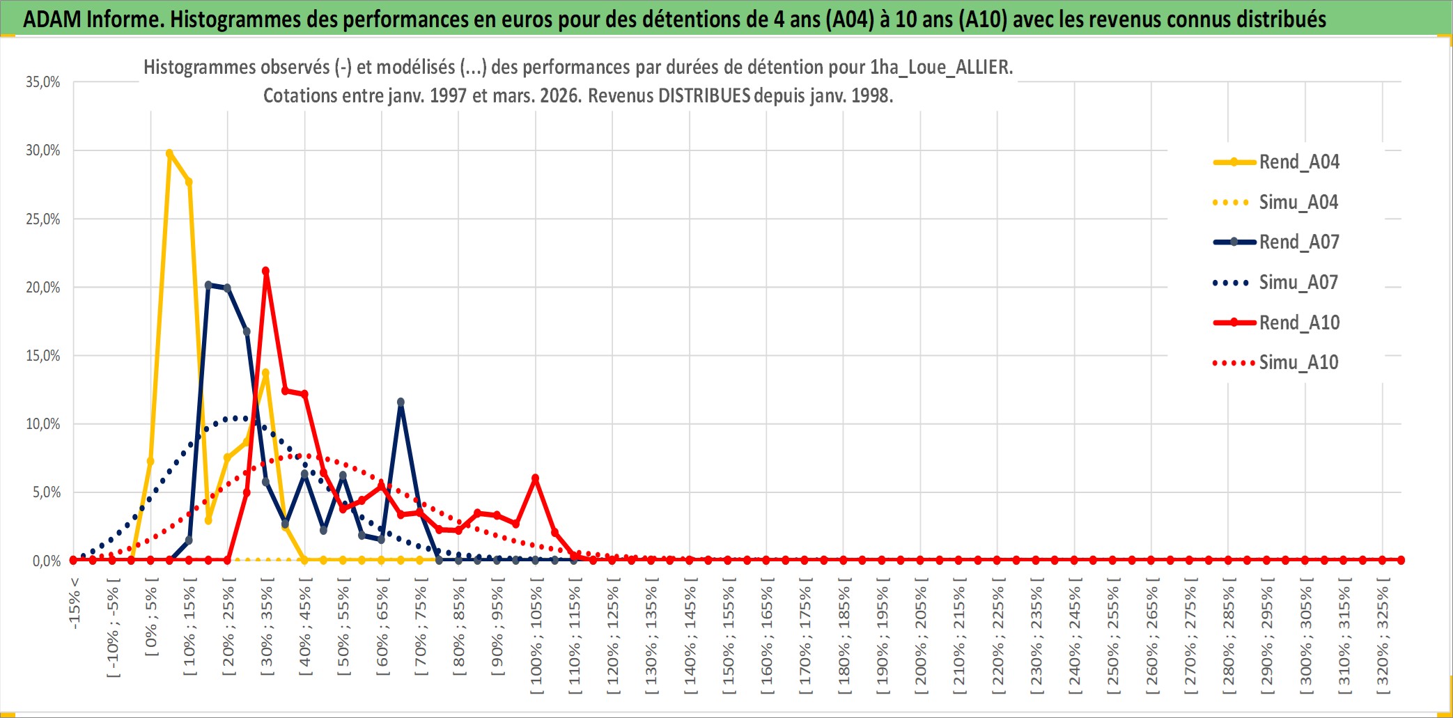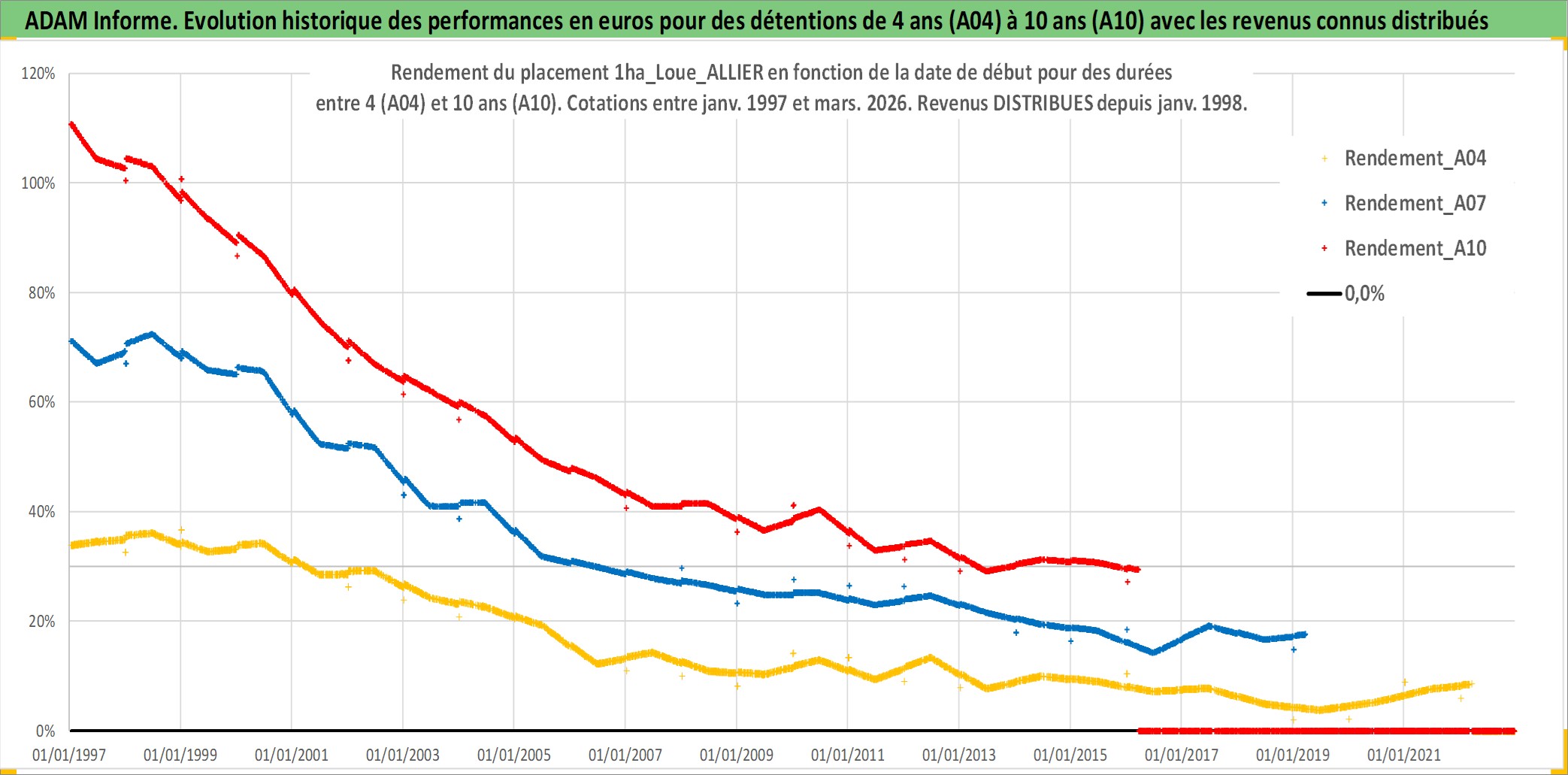 Site dédié aux investisseursPage dédiée sur site financeAnalyse des valorisations hebdomadaires de l'actif 1ha_Loue_ALLIER. Cet actif est cote en EUR. Les valorisations couvrent les semaines 1997W01 a 2026W13. Les fermages de ce bien foncier sont pris egaux a 2,5% annuels de la valeur venale du bien.