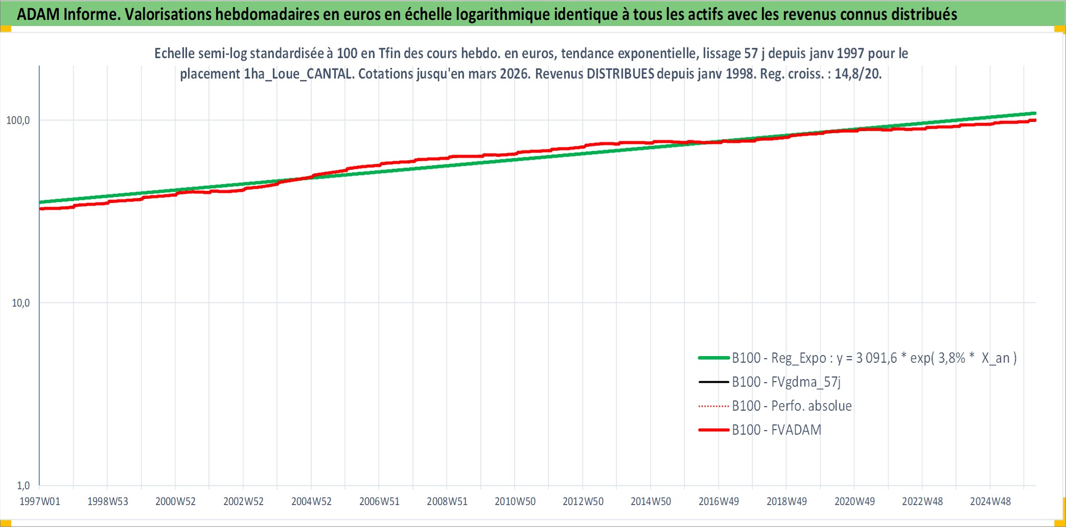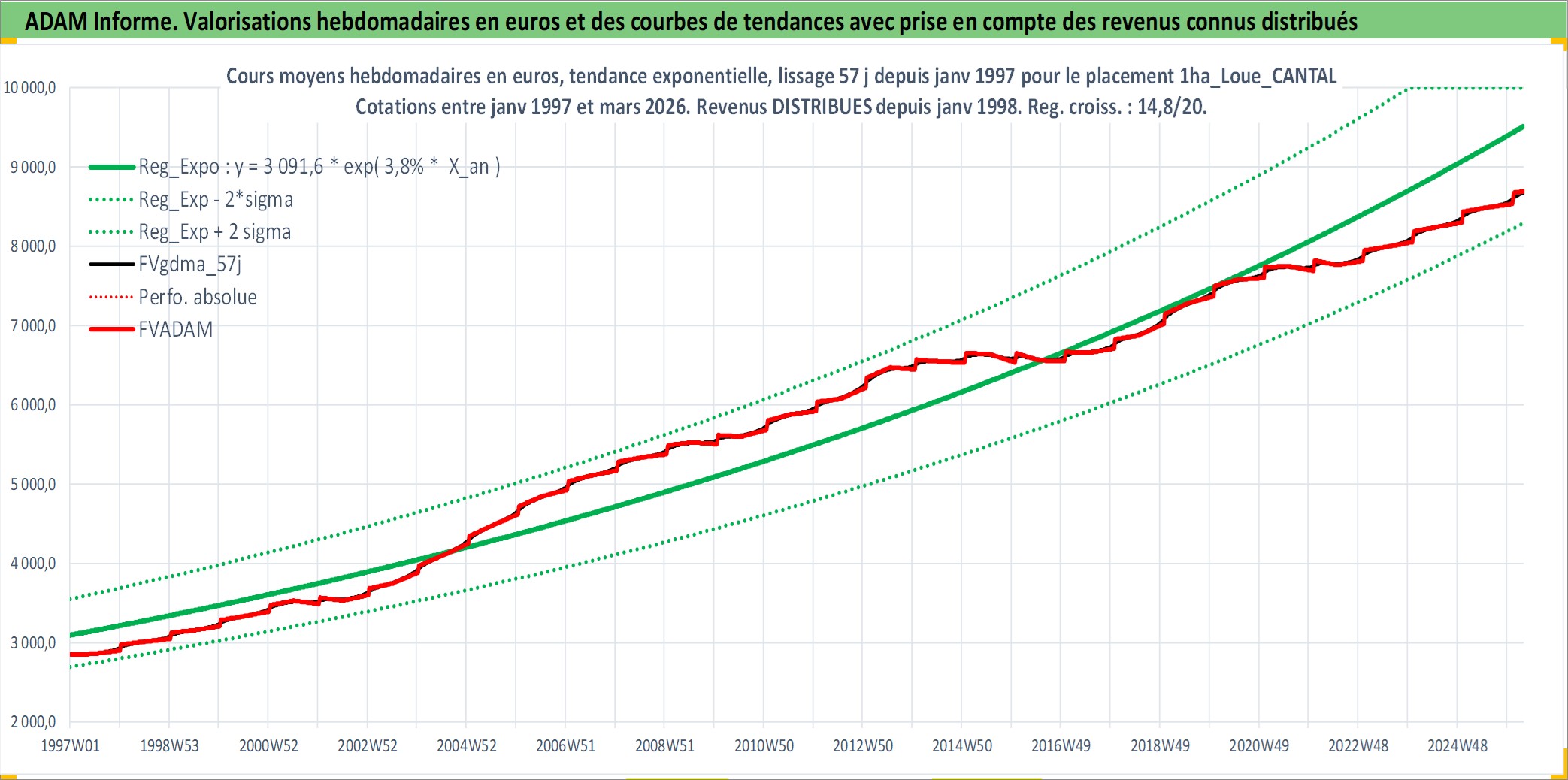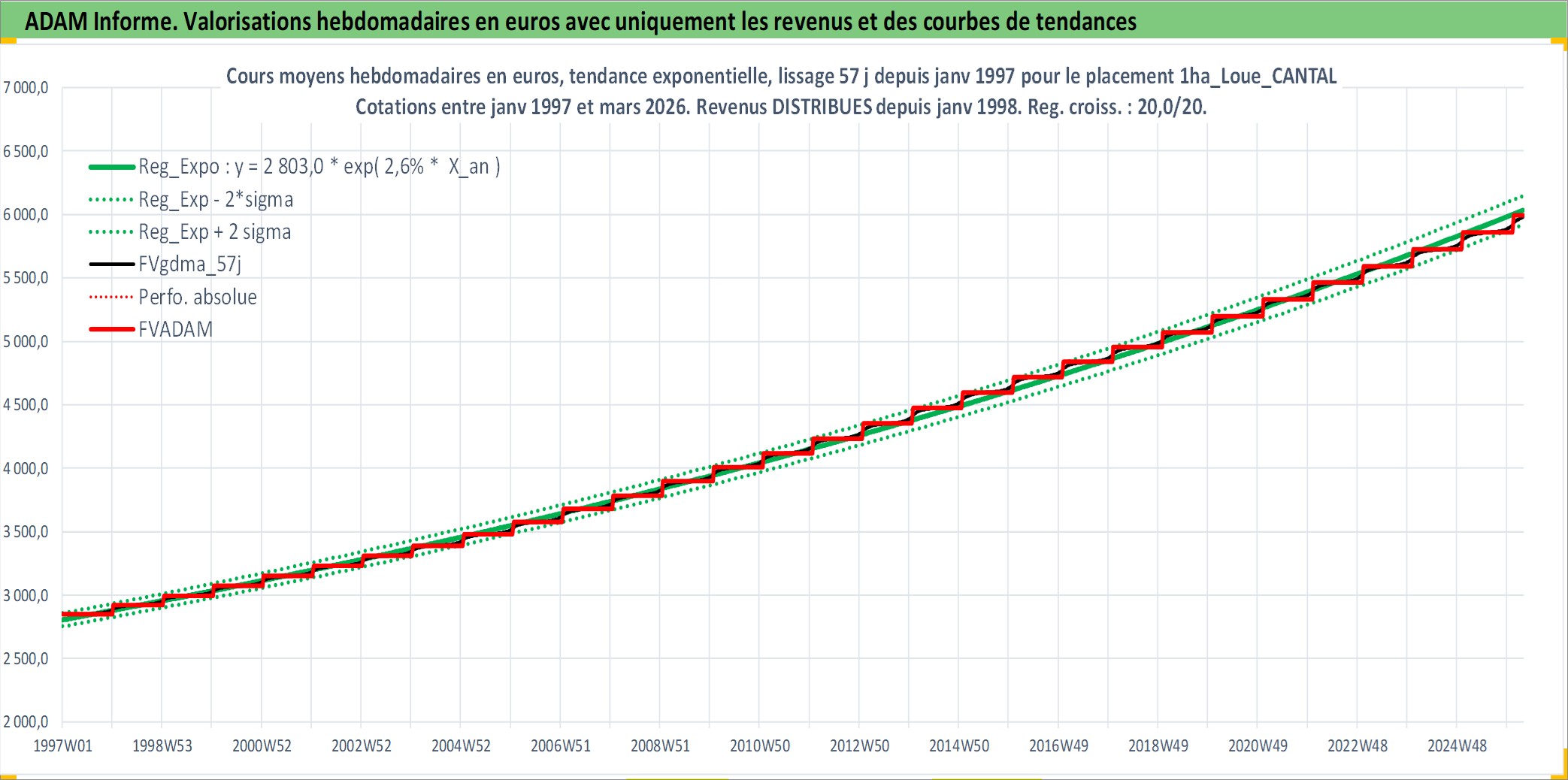 Site dédié aux investisseursPage dédiée sur site financeAnalyse des valorisations hebdomadaires de l'actif 1ha_Loue_CANTAL. Cet actif est cote en EUR. Les valorisations couvrent les semaines 1997W01 a 2026W13. Les fermages de ce bien foncier sont pris egaux a 2,5% annuels de la valeur venale du bien.