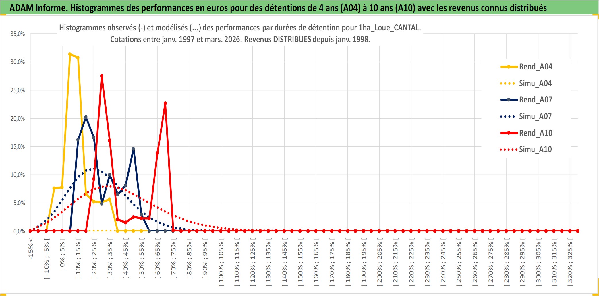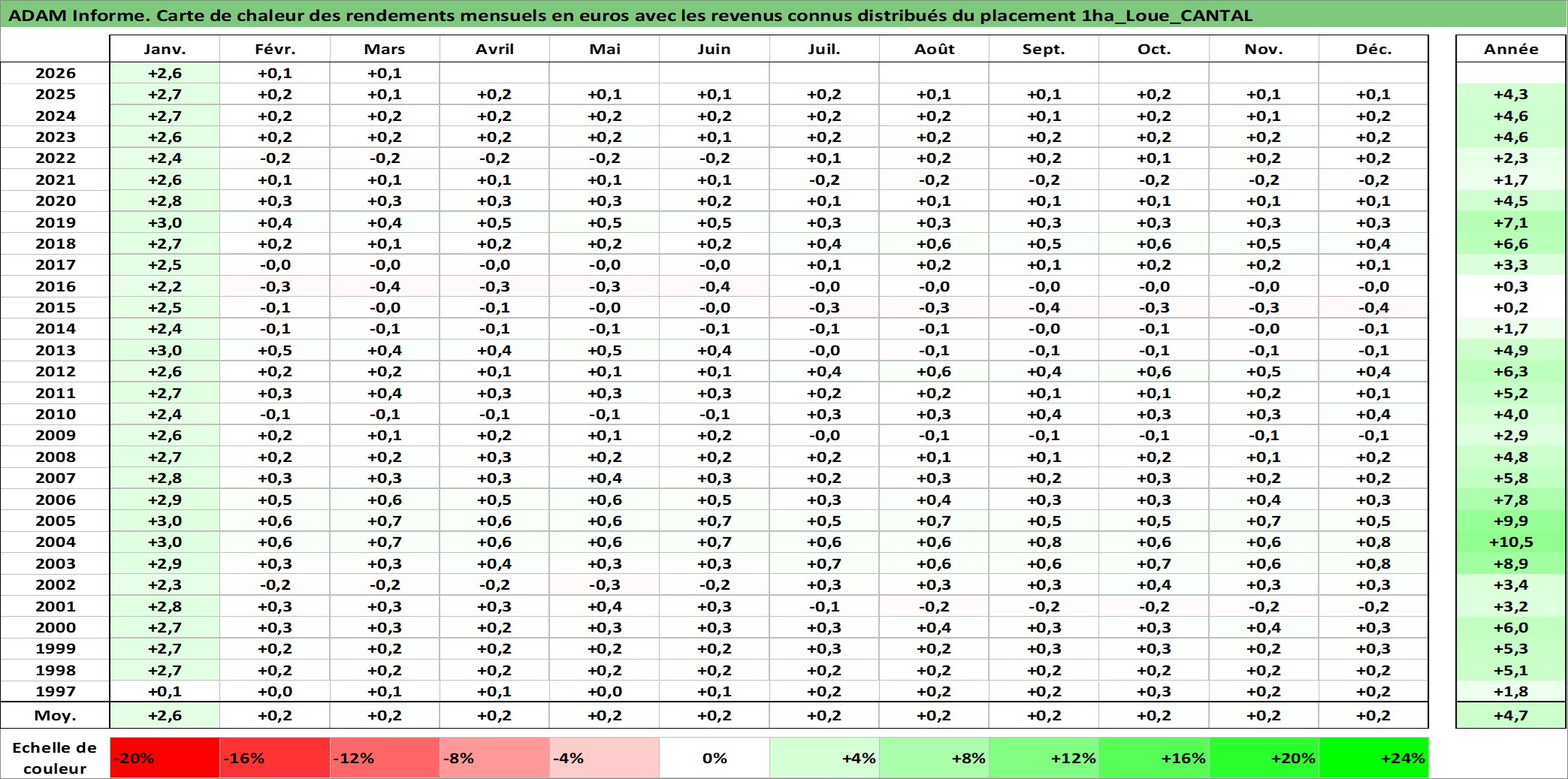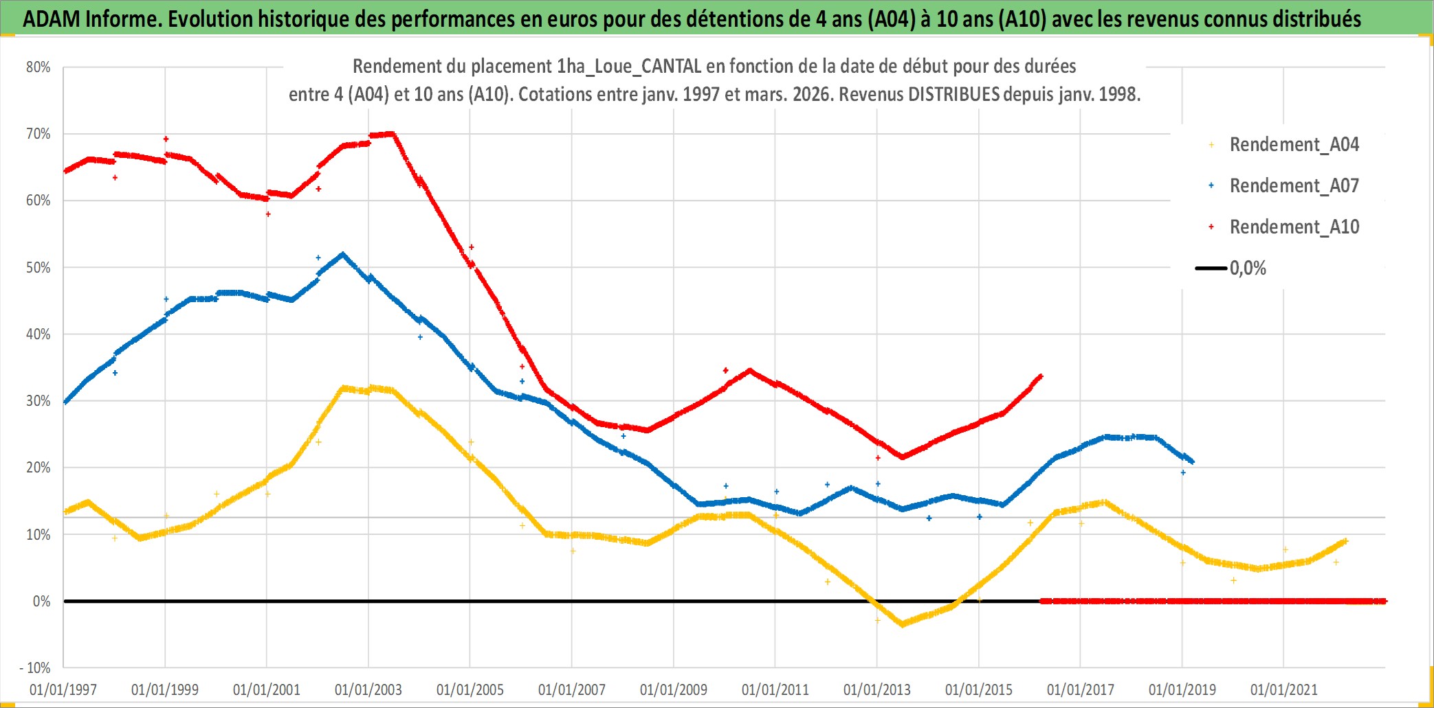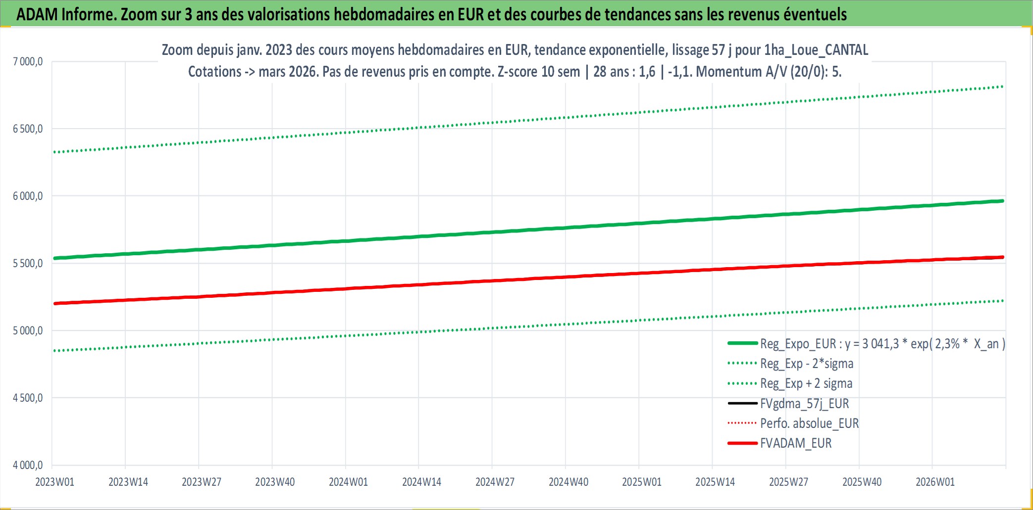 Site dédié aux investisseursPage dédiée sur site financeAnalyse des valorisations hebdomadaires de l'actif 1ha_Loue_CANTAL. Cet actif est cote en EUR. Les valorisations couvrent les semaines 1997W01 a 2026W13. Les fermages de ce bien foncier sont pris egaux a 2,5% annuels de la valeur venale du bien.