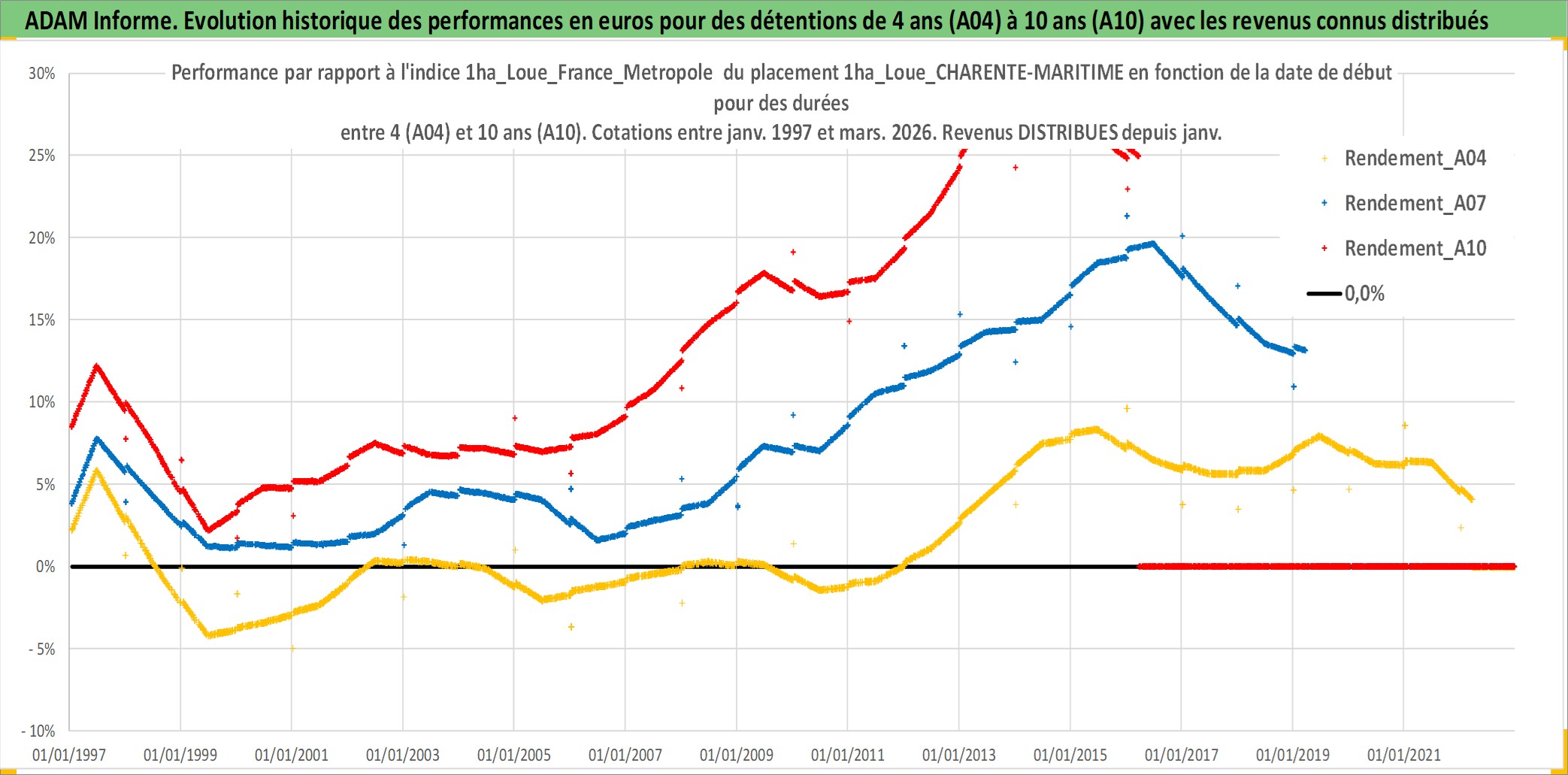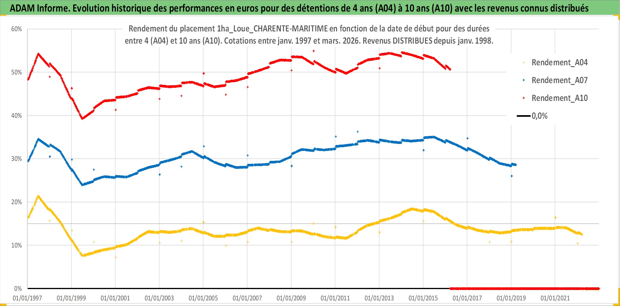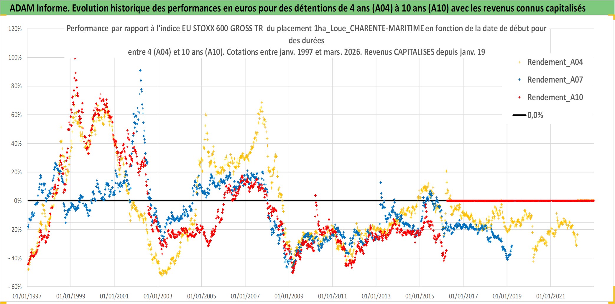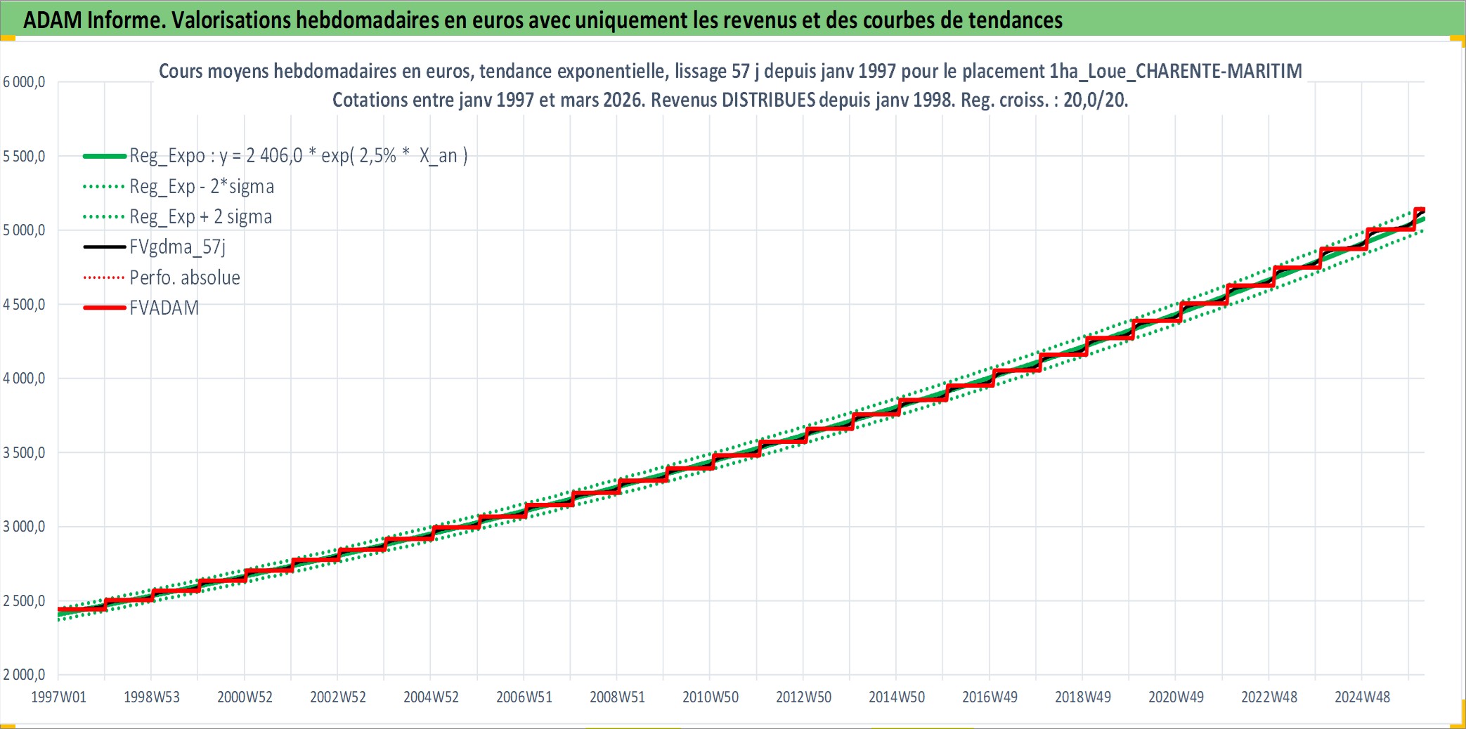Site dédié aux investisseursPage dédiée sur site financeAnalyse des valorisations hebdomadaires de l'actif 1ha_Loue_CHARENTE-MARITIME. Cet actif est cote en EUR. Les valorisations couvrent les semaines 1997W01 a 2026W13. Les fermages de ce bien foncier sont pris egaux a 2,5% annuels de la valeur venale du bien.