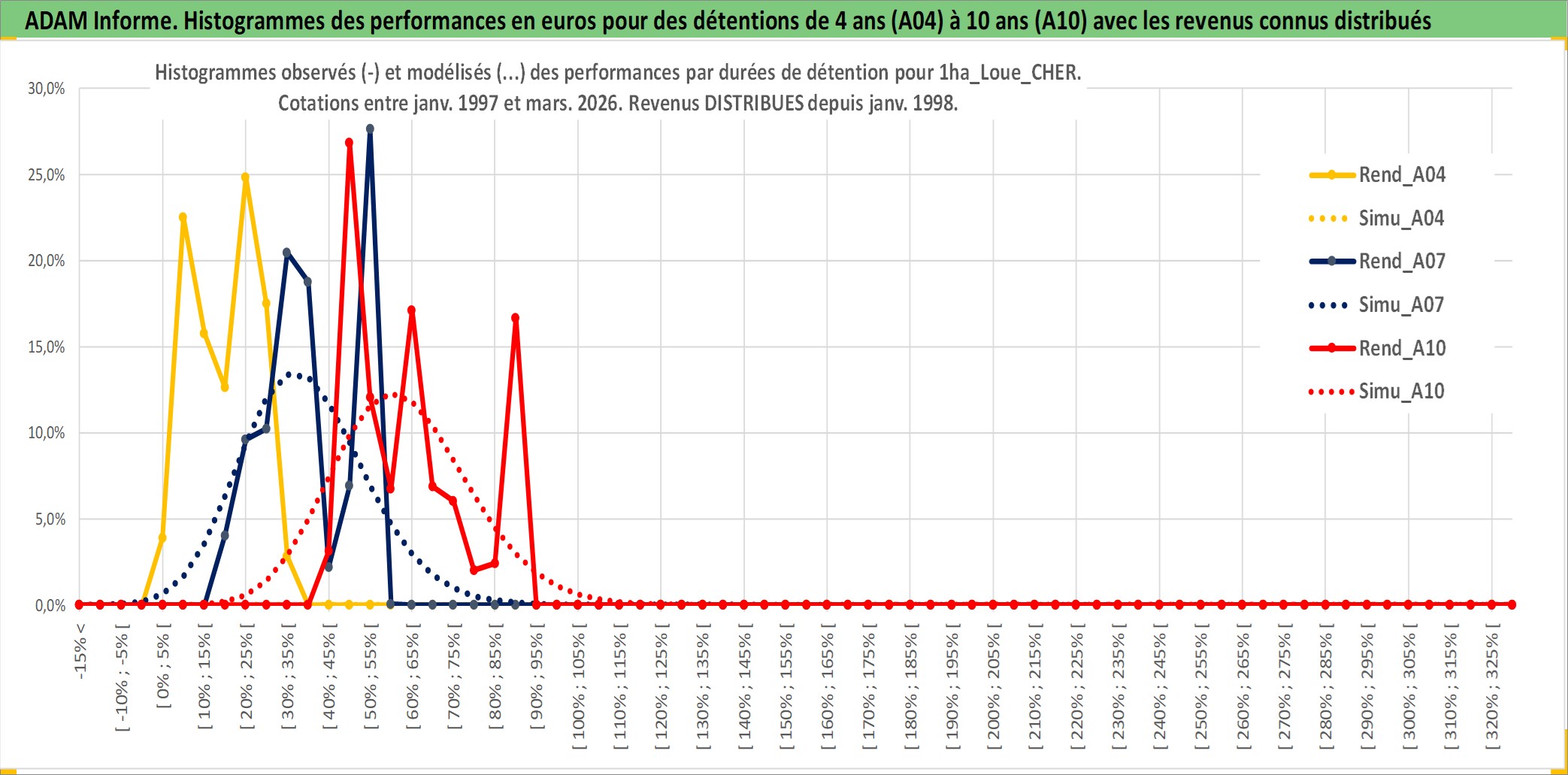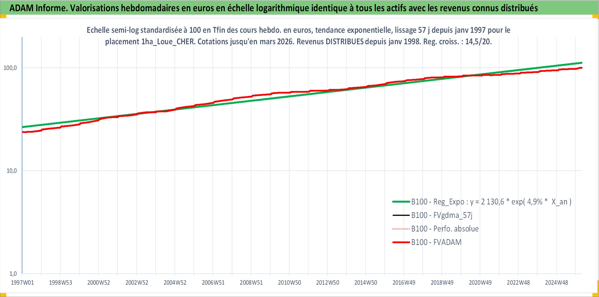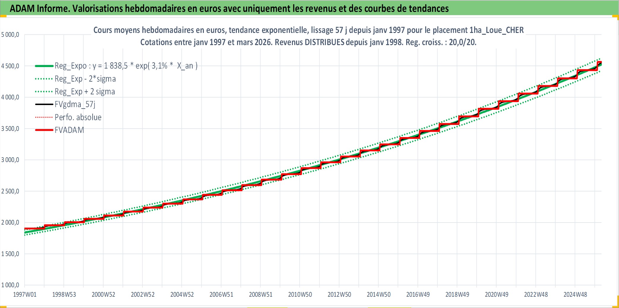 Site dédié aux investisseursPage dédiée sur site financeAnalyse des valorisations hebdomadaires de l'actif 1ha_Loue_CHER. Cet actif est cote en EUR. Les valorisations couvrent les semaines 1997W01 a 2026W13. Les fermages de ce bien foncier sont pris egaux a 2,5% annuels de la valeur venale du bien.