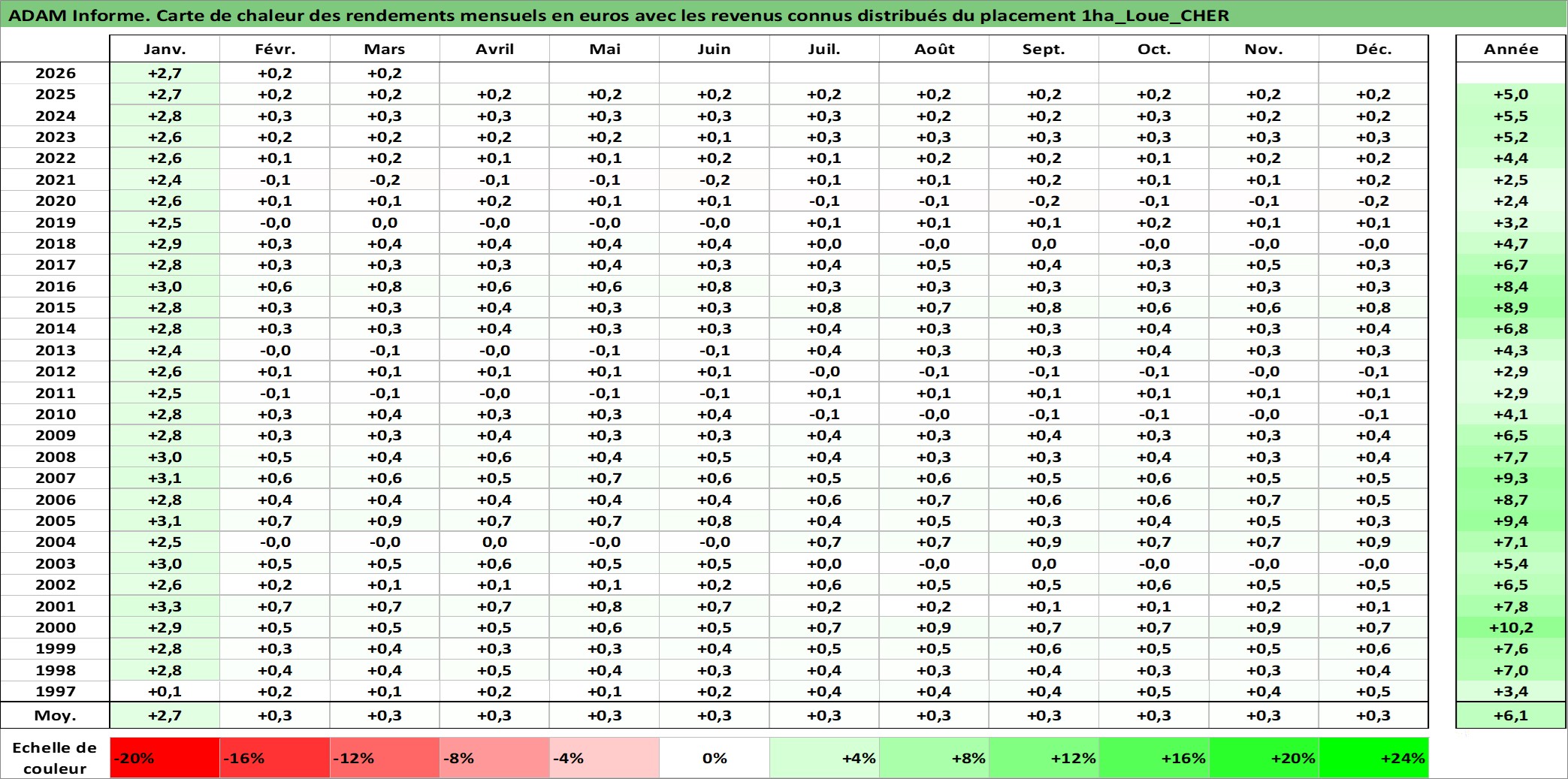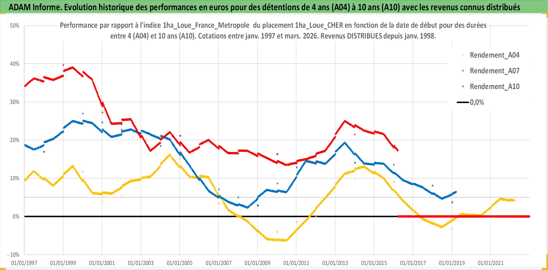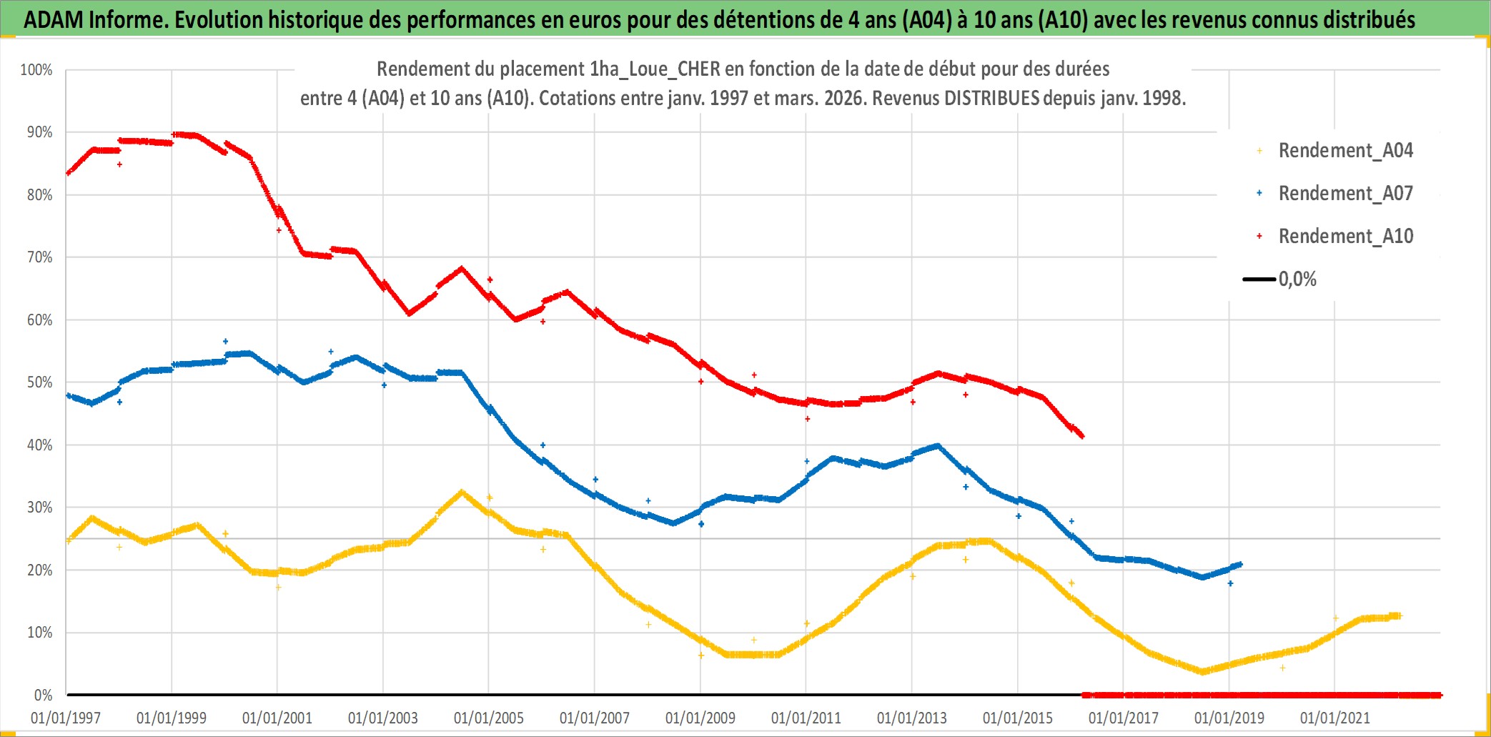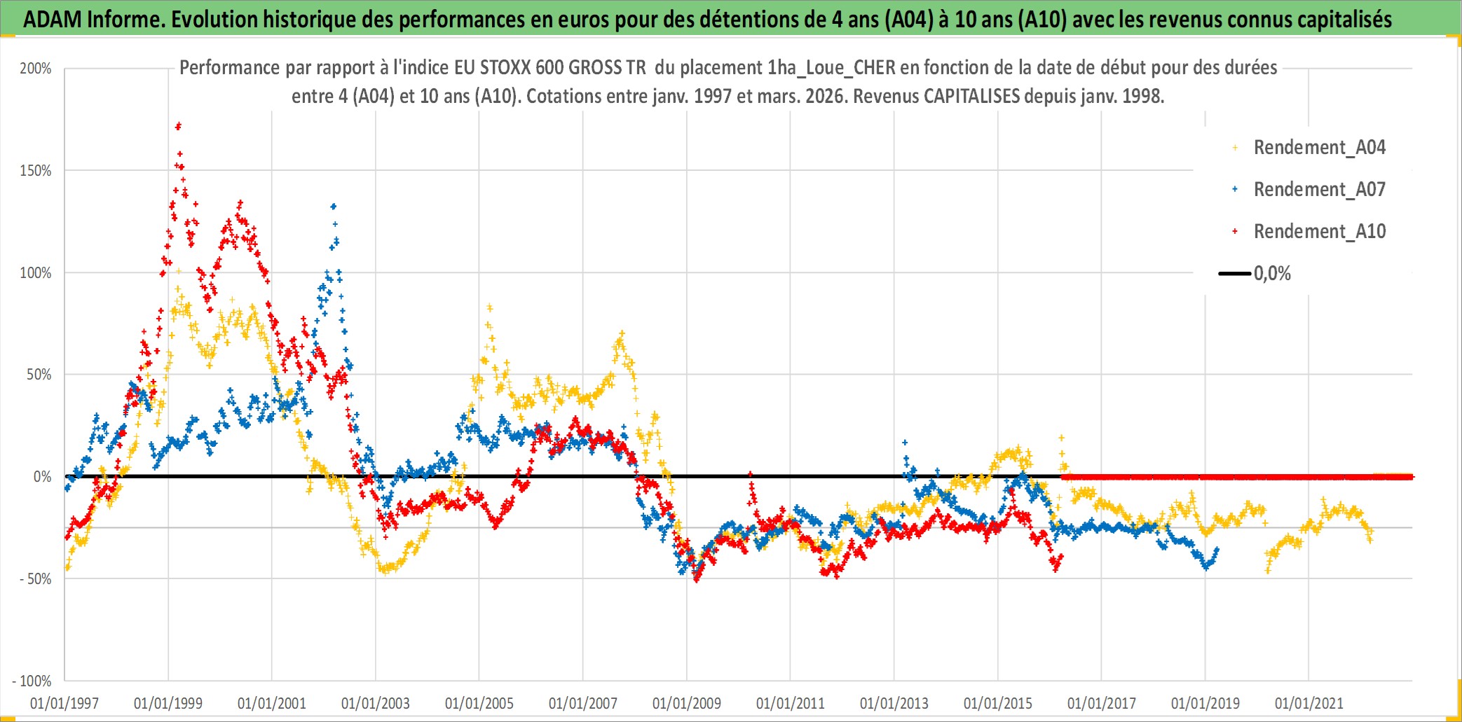 Site dédié aux investisseursPage dédiée sur site financeAnalyse des valorisations hebdomadaires de l'actif 1ha_Loue_CHER. Cet actif est cote en EUR. Les valorisations couvrent les semaines 1997W01 a 2026W13. Les fermages de ce bien foncier sont pris egaux a 2,5% annuels de la valeur venale du bien.