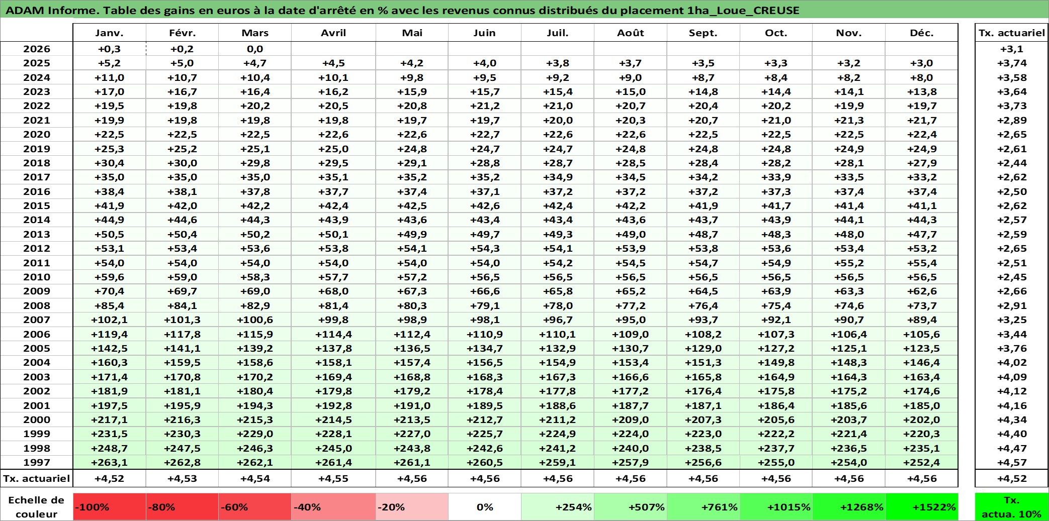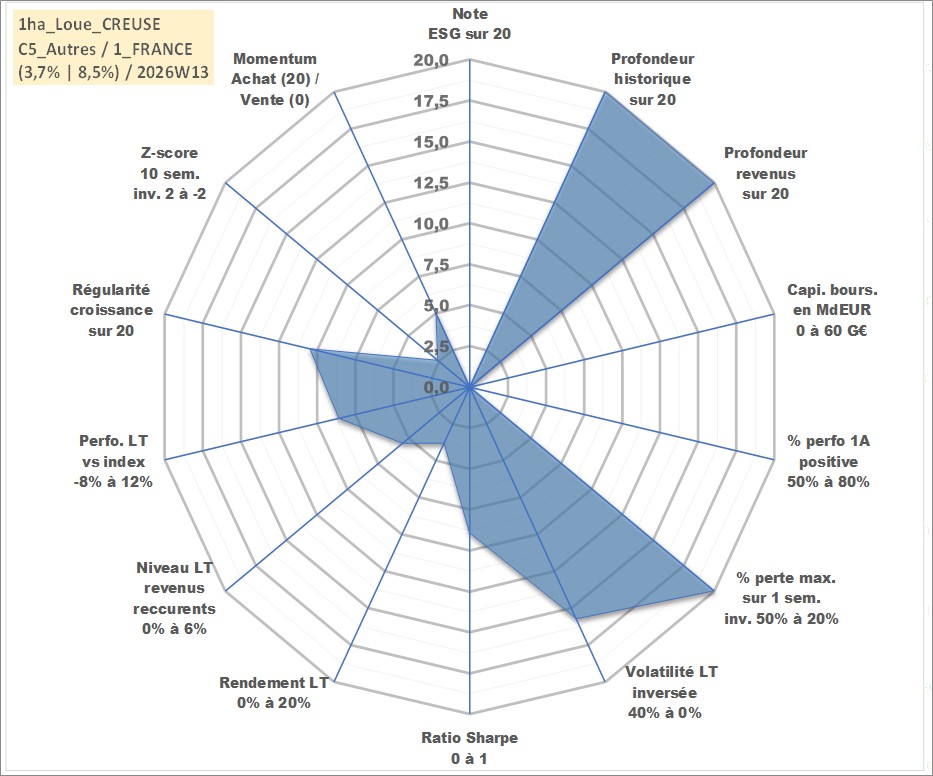 Site dédié aux investisseursPage dédiée sur site financeAnalyse des valorisations hebdomadaires de l'actif 1ha_Loue_CREUSE. Cet actif est cote en EUR. Les valorisations couvrent les semaines 1997W01 a 2026W13. Les fermages de ce bien foncier sont pris egaux a 2,5% annuels de la valeur venale du bien.