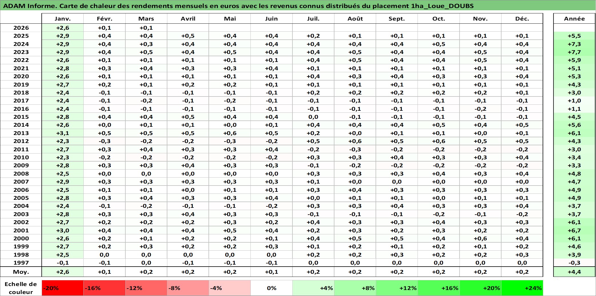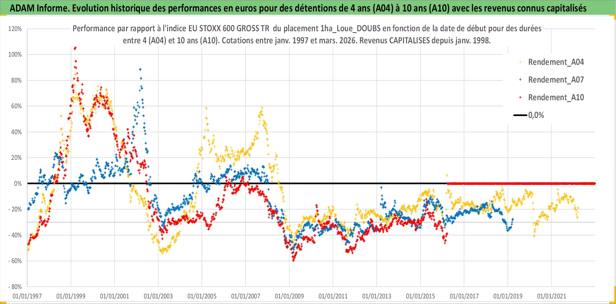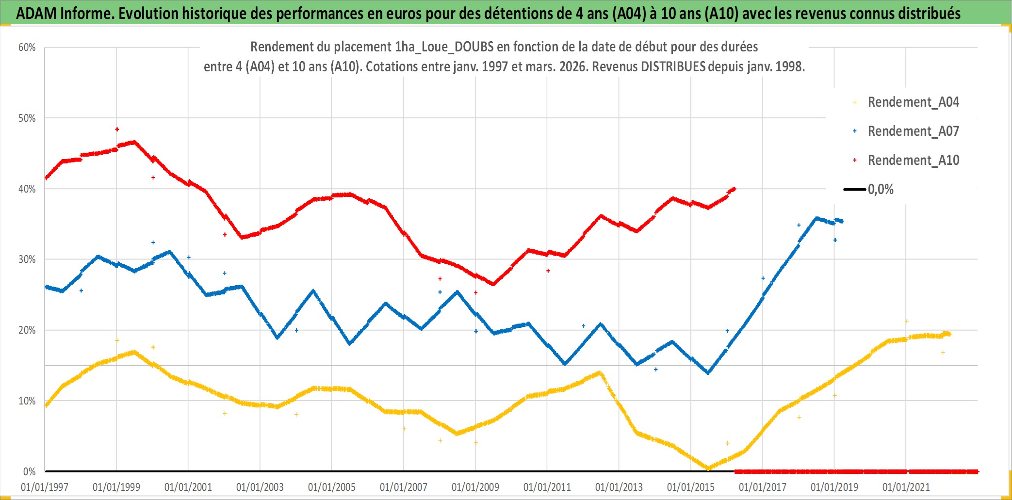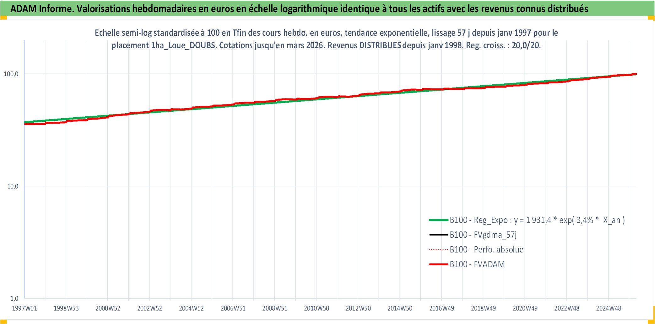 Site dédié aux investisseursPage dédiée sur site financeAnalyse des valorisations hebdomadaires de l'actif 1ha_Loue_DOUBS. Cet actif est cote en EUR. Les valorisations couvrent les semaines 1997W01 a 2026W13. Les fermages de ce bien foncier sont pris egaux a 2,5% annuels de la valeur venale du bien.