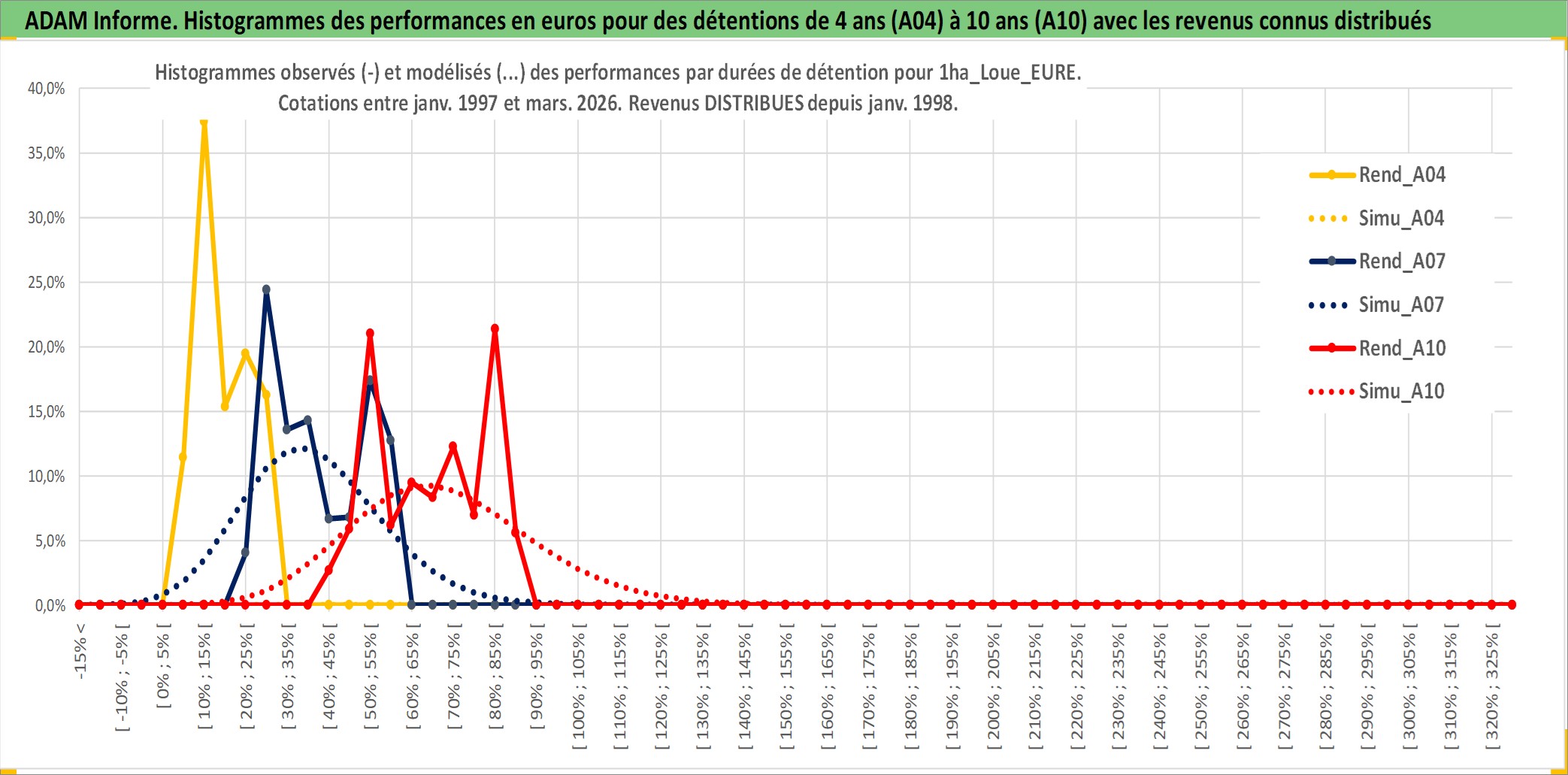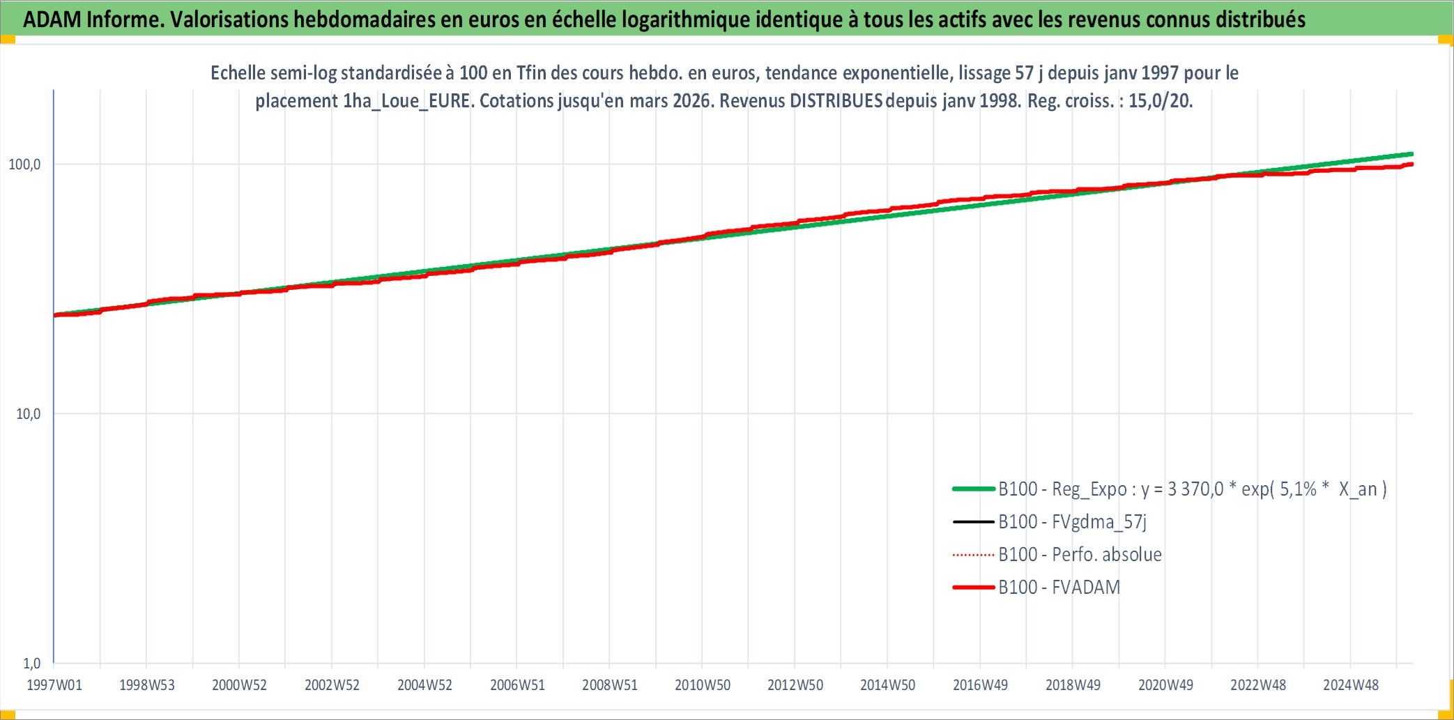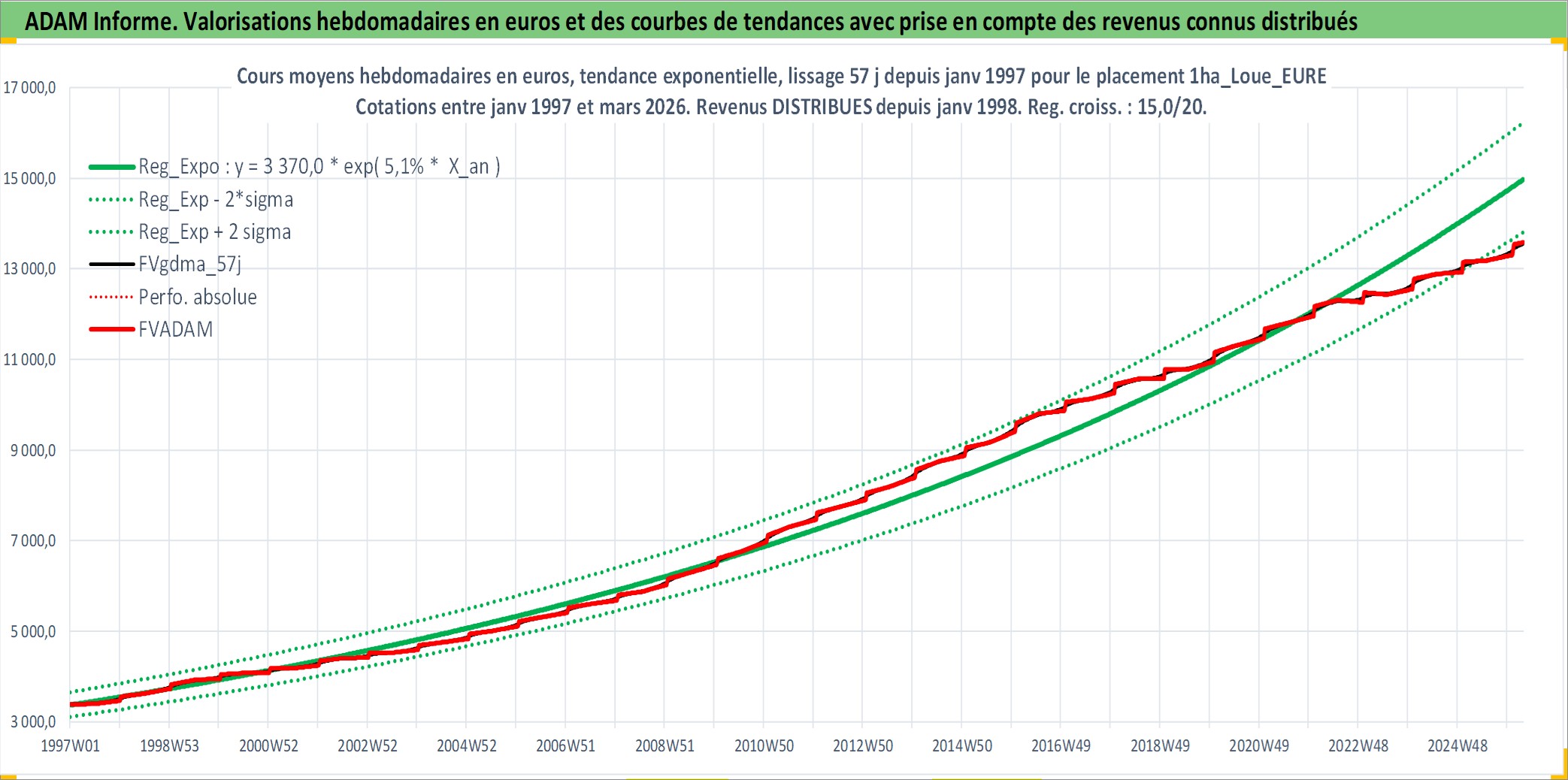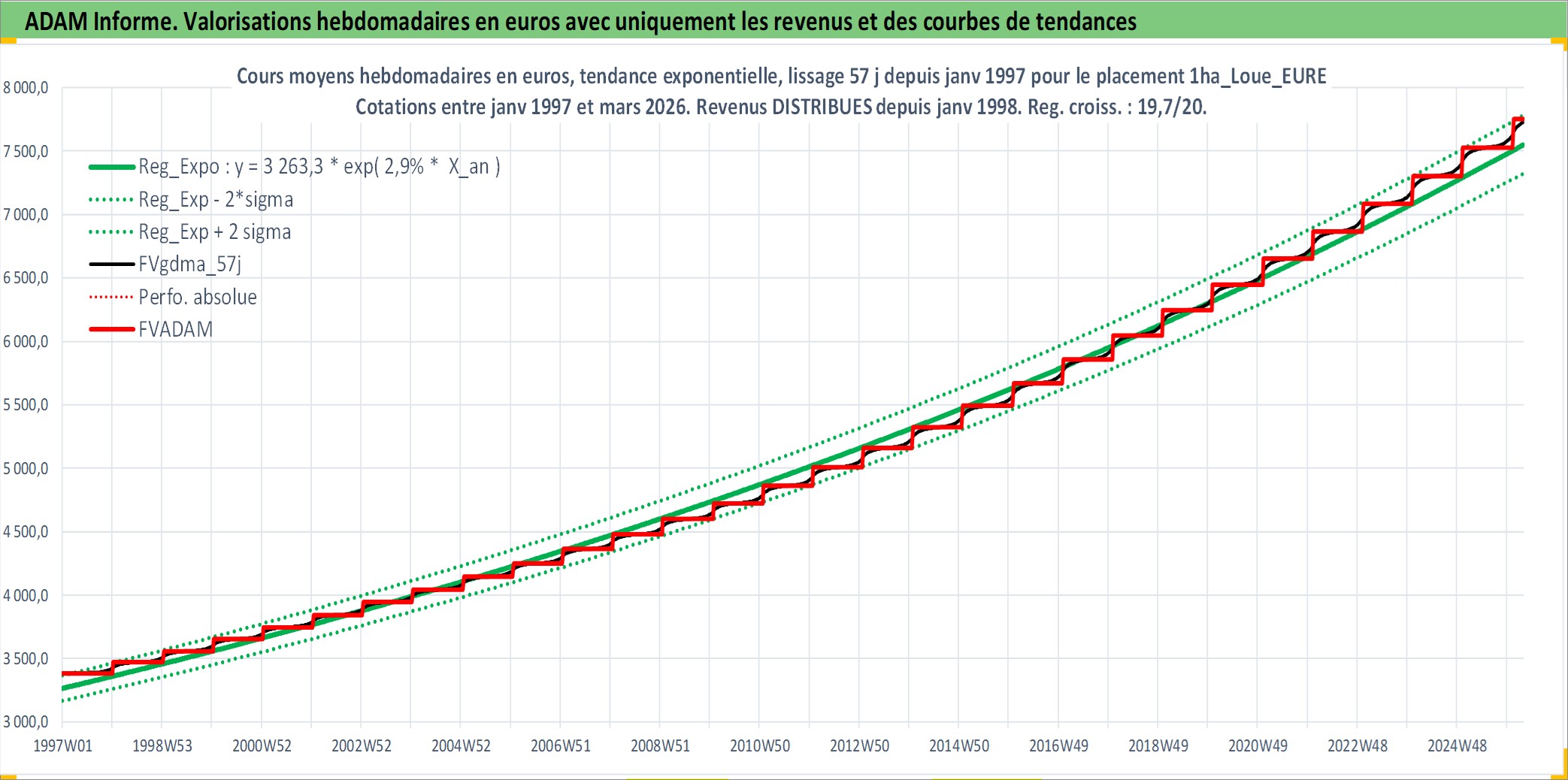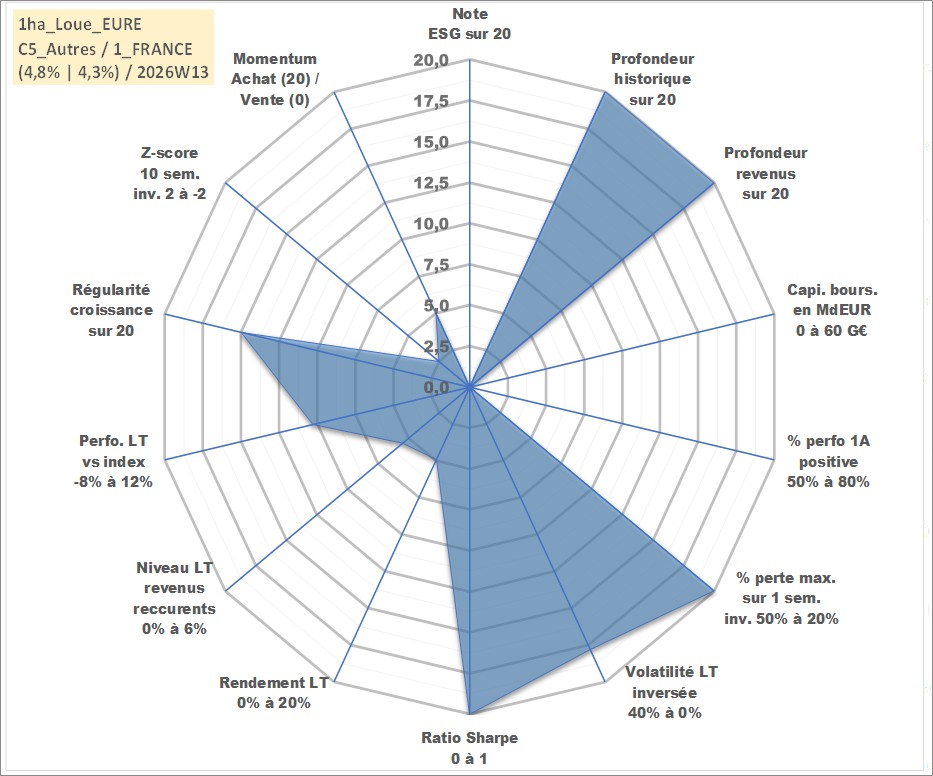 Site dédié aux investisseursPage dédiée sur site financeAnalyse des valorisations hebdomadaires de l'actif 1ha_Loue_EURE. Cet actif est cote en EUR. Les valorisations couvrent les semaines 1997W01 a 2026W13. Les fermages de ce bien foncier sont pris egaux a 2,5% annuels de la valeur venale du bien.