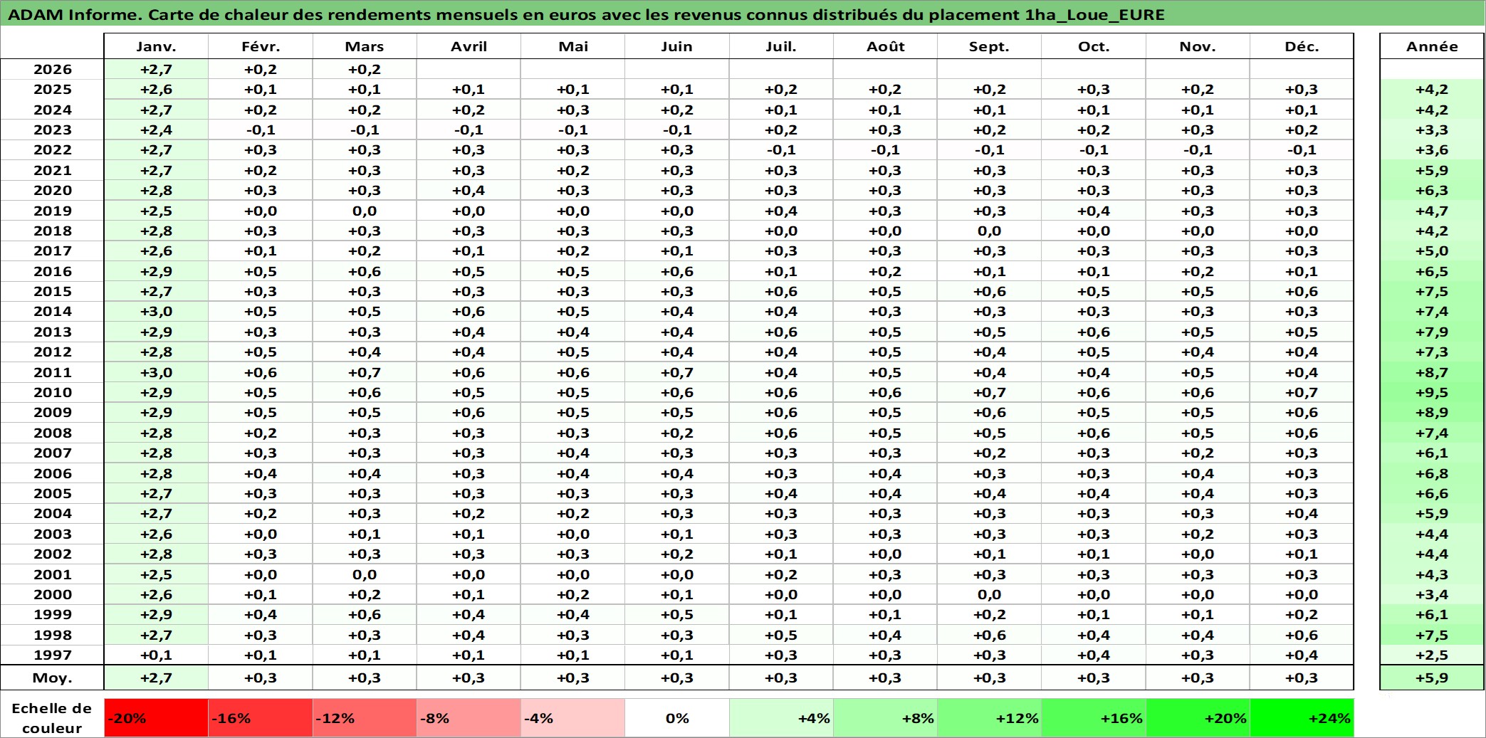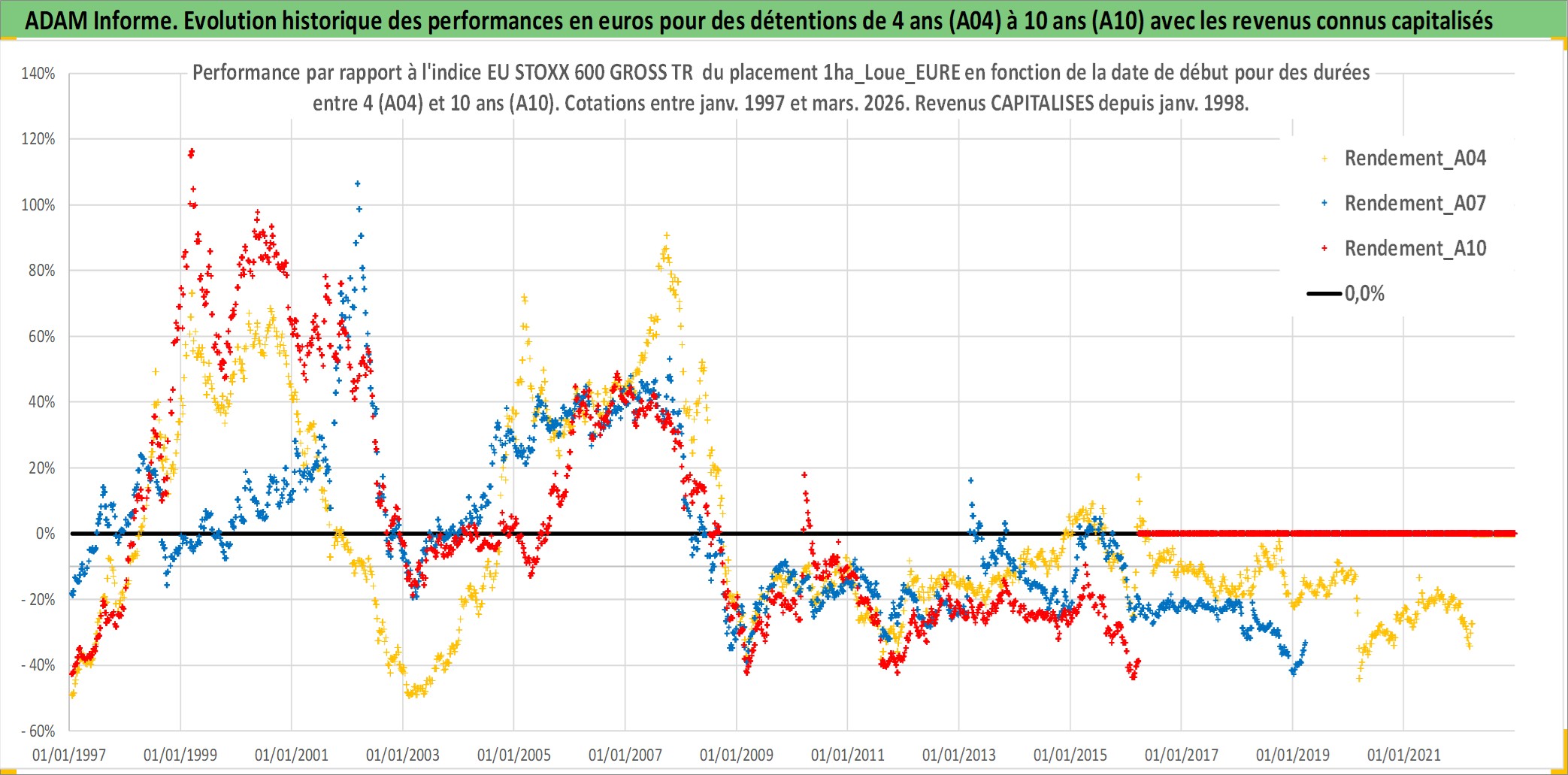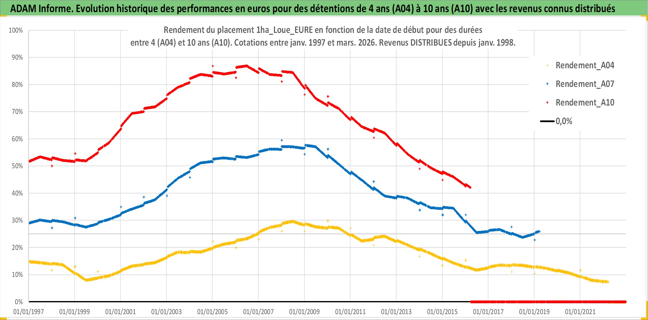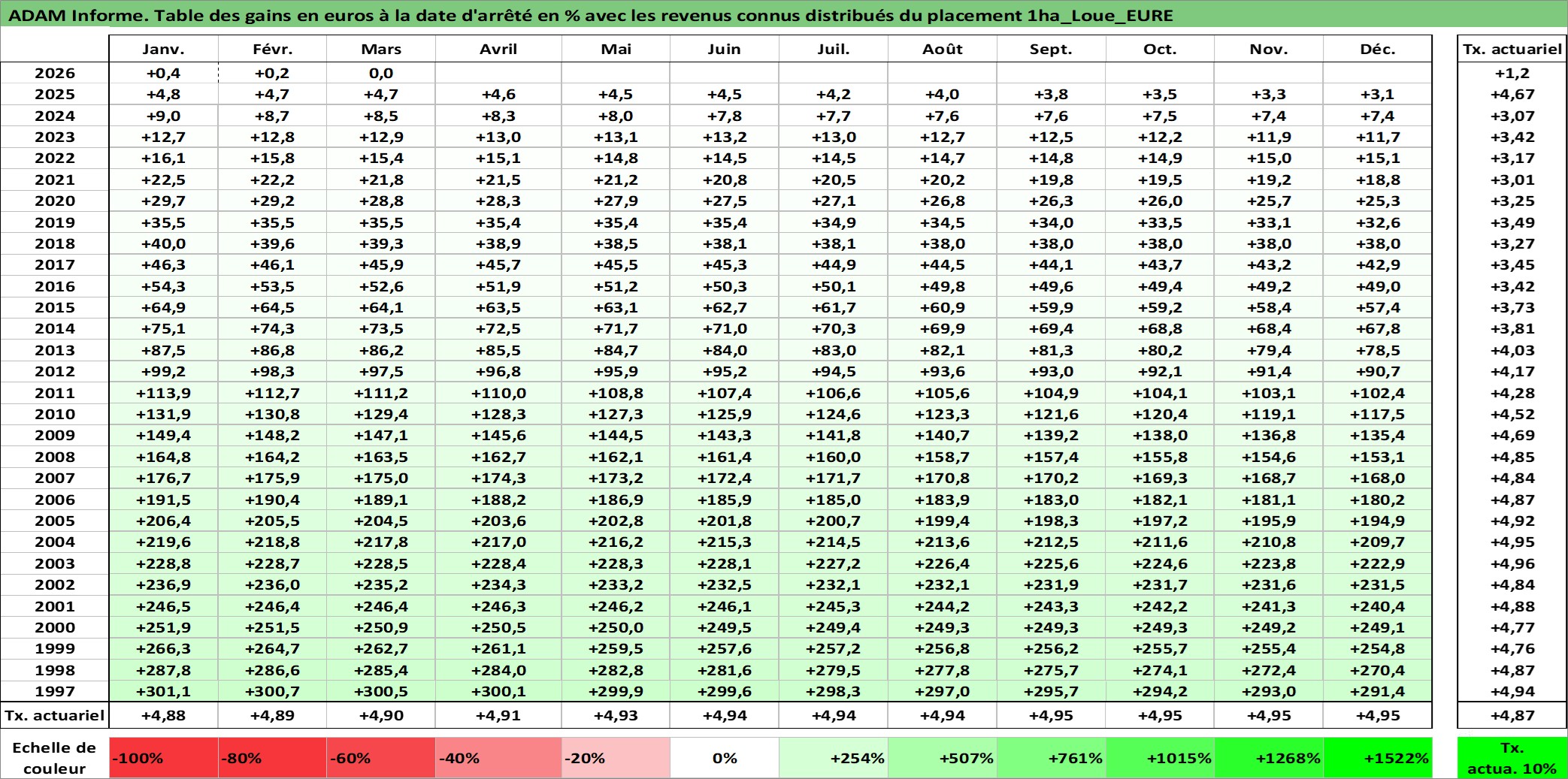 Site dédié aux investisseursPage dédiée sur site financeAnalyse des valorisations hebdomadaires de l'actif 1ha_Loue_EURE. Cet actif est cote en EUR. Les valorisations couvrent les semaines 1997W01 a 2026W13. Les fermages de ce bien foncier sont pris egaux a 2,5% annuels de la valeur venale du bien.
