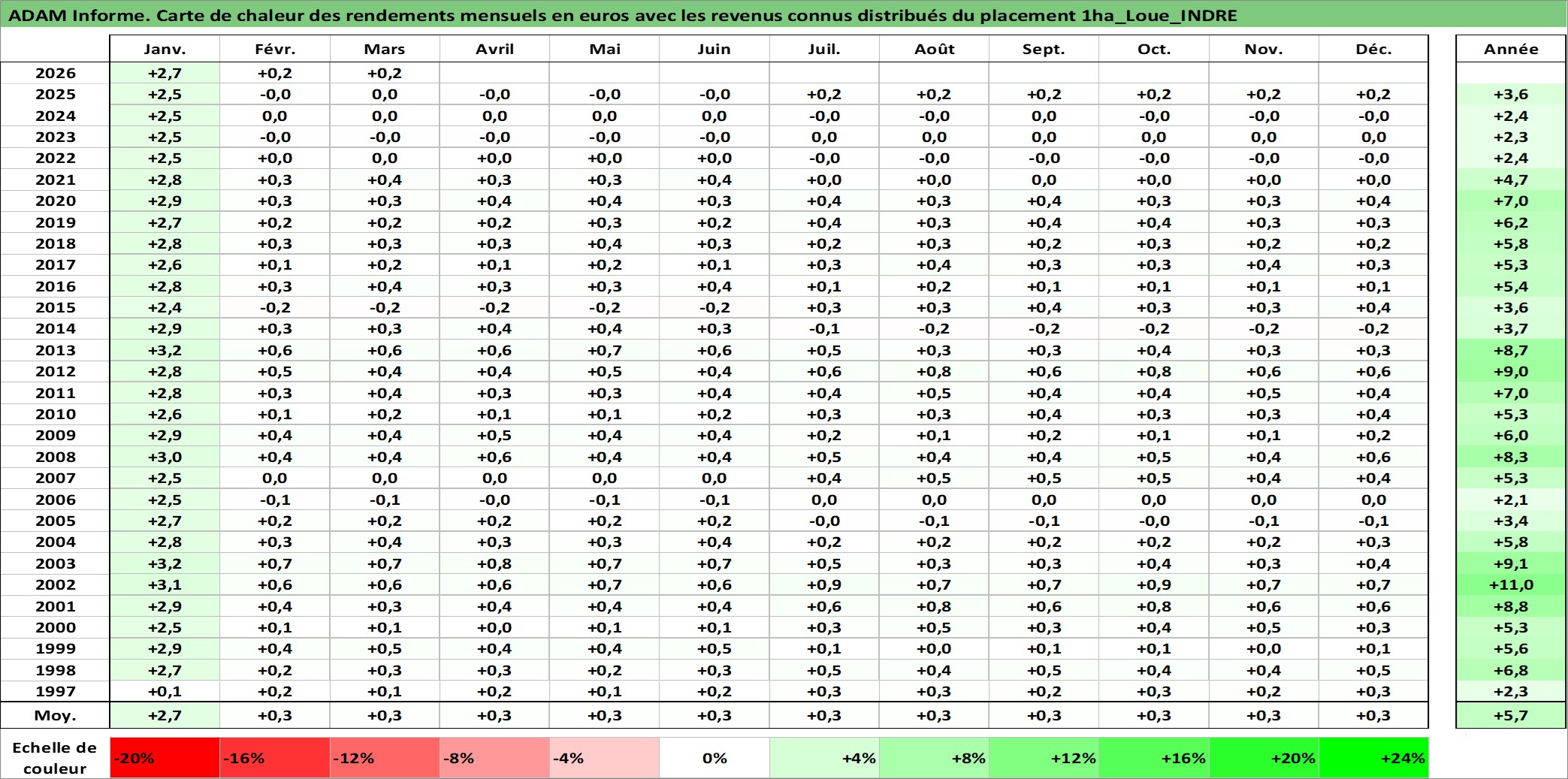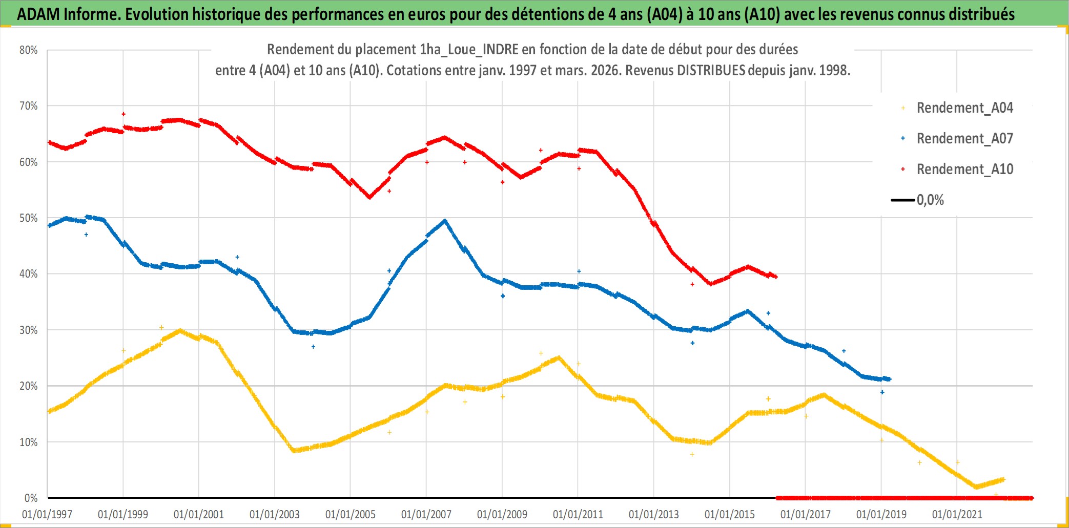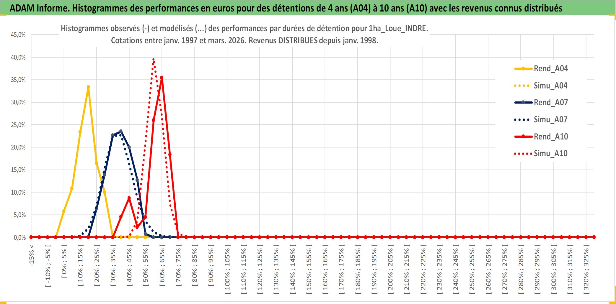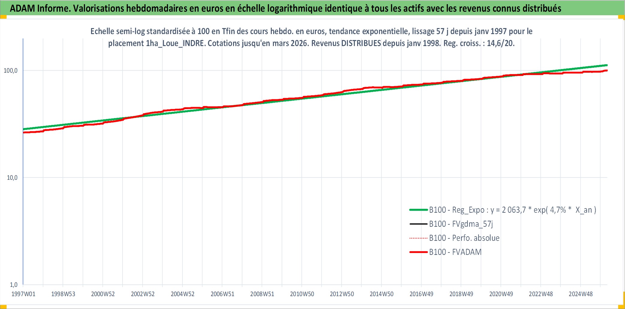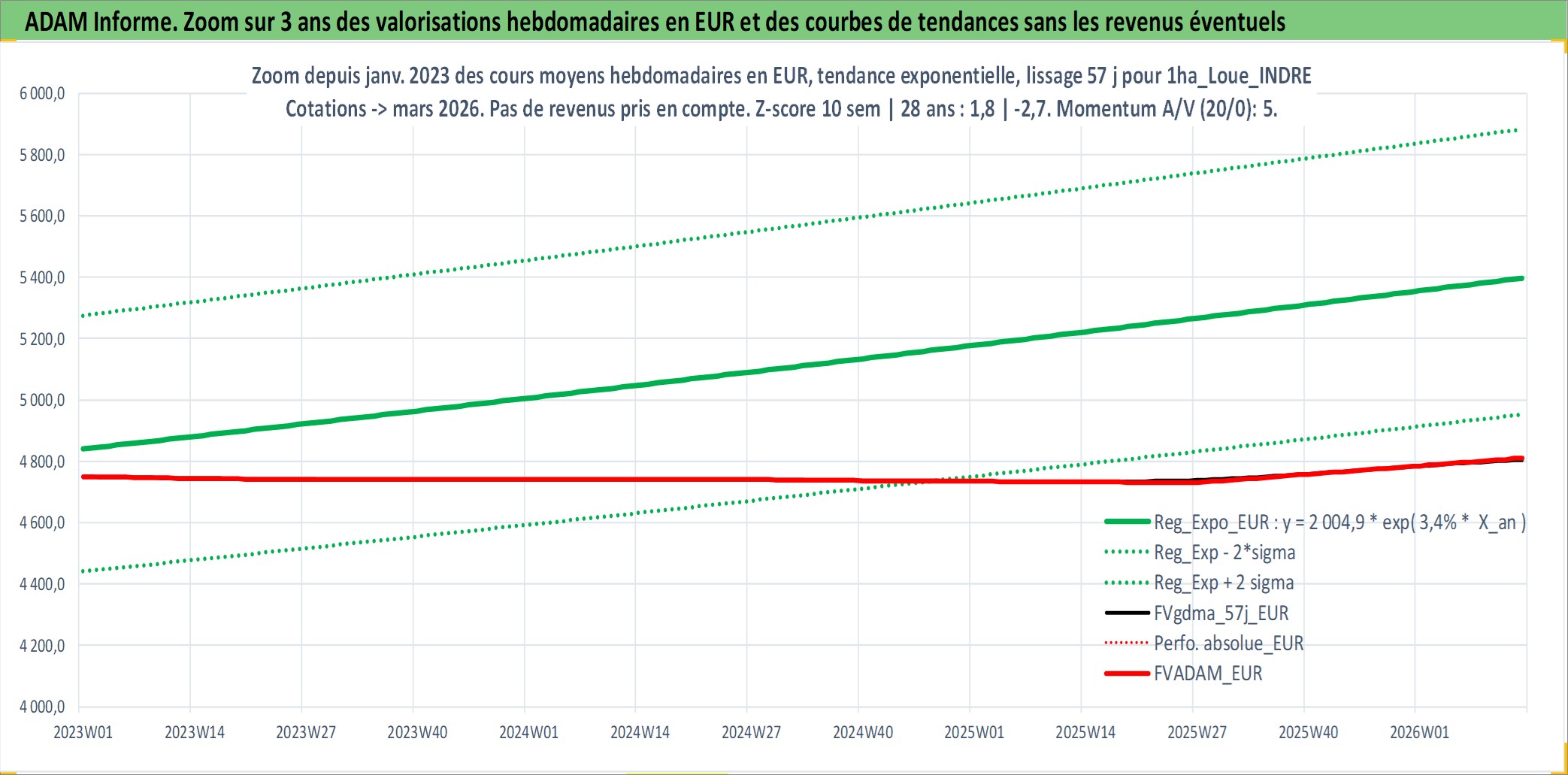 Site dédié aux investisseursPage dédiée sur site financeAnalyse des valorisations hebdomadaires de l'actif 1ha_Loue_INDRE. Cet actif est cote en EUR. Les valorisations couvrent les semaines 1997W01 a 2026W13. Les fermages de ce bien foncier sont pris egaux a 2,5% annuels de la valeur venale du bien.