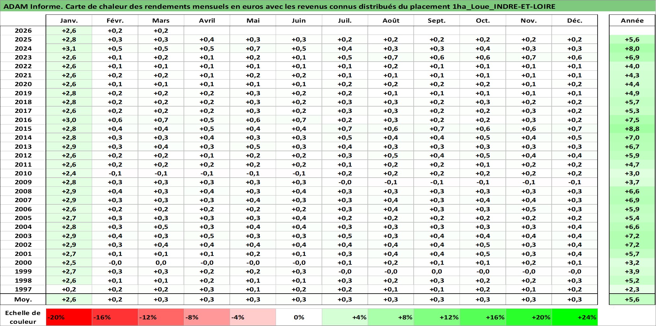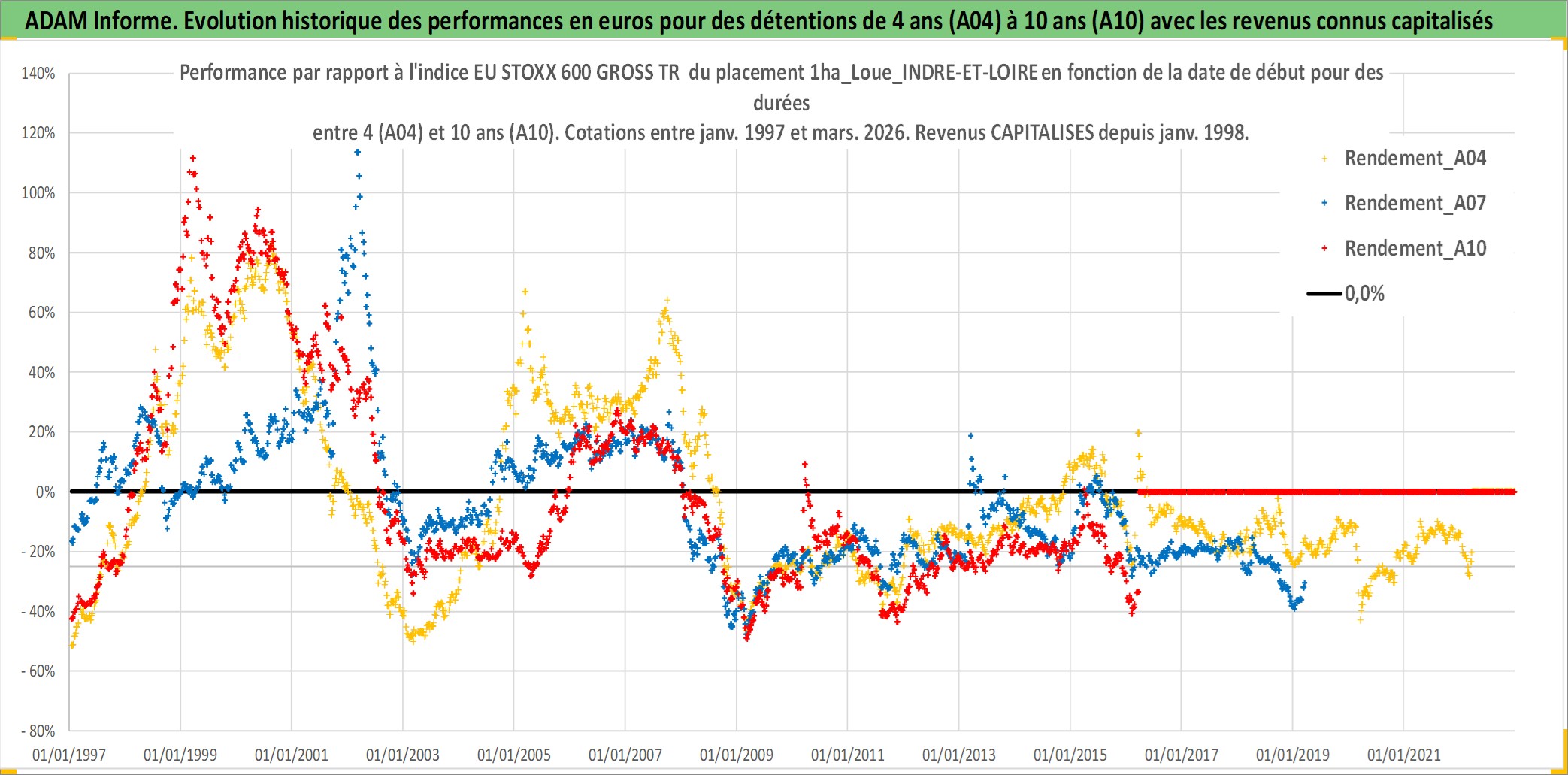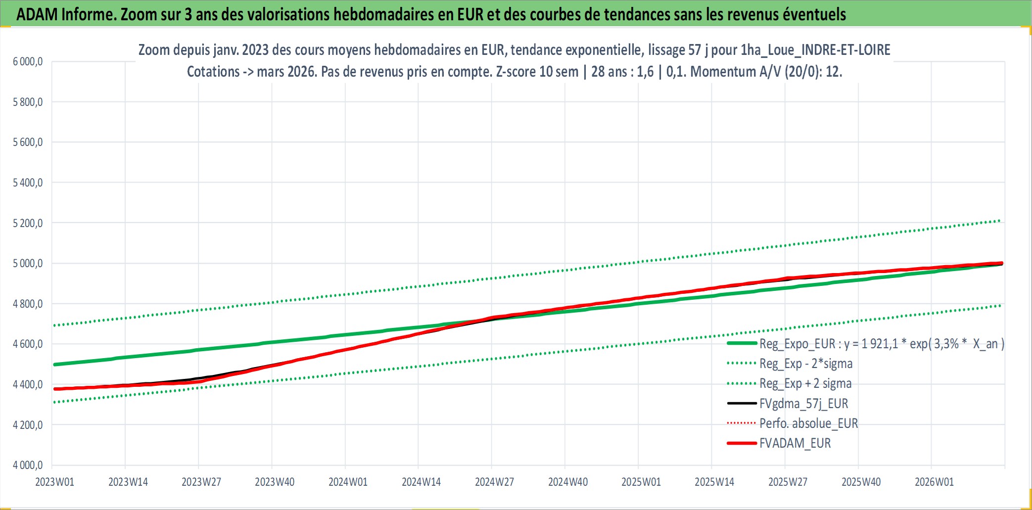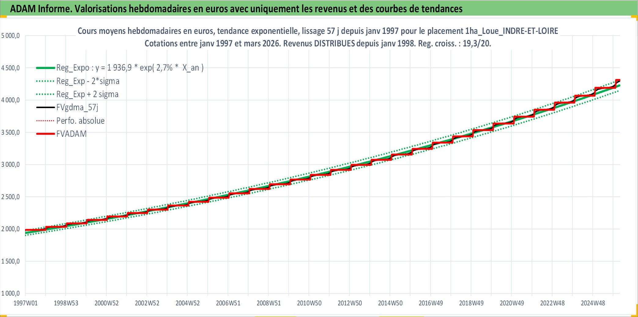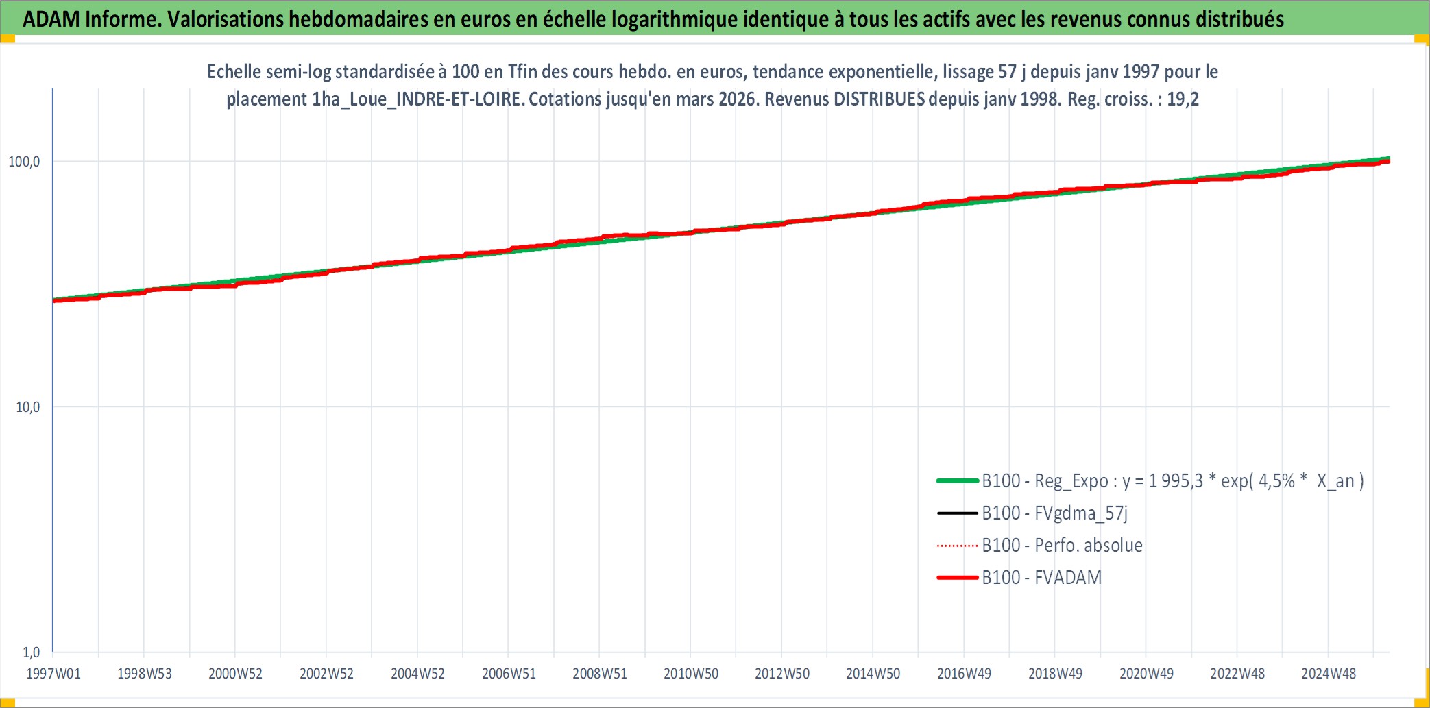 Site dédié aux investisseursPage dédiée sur site financeAnalyse des valorisations hebdomadaires de l'actif 1ha_Loue_INDRE-ET-LOIRE. Cet actif est cote en EUR. Les valorisations couvrent les semaines 1997W01 a 2026W13. Les fermages de ce bien foncier sont pris egaux a 2,5% annuels de la valeur venale du bien.