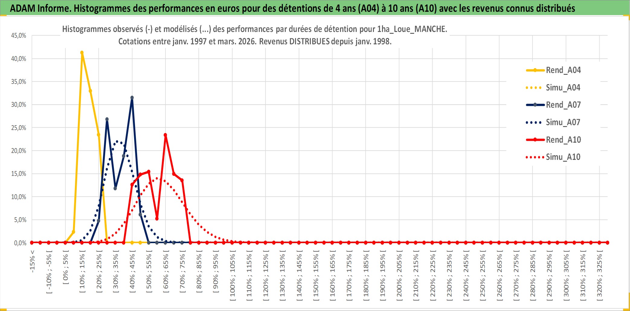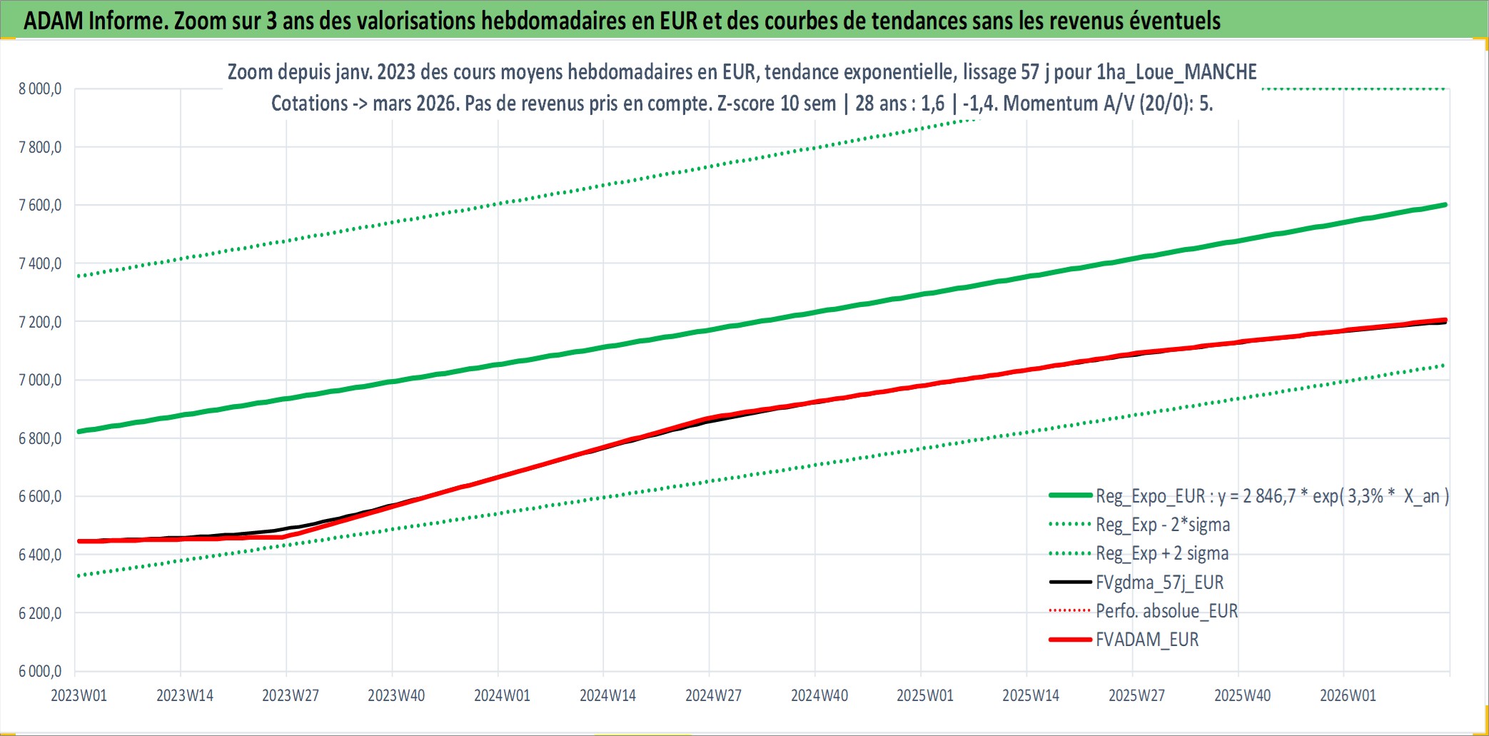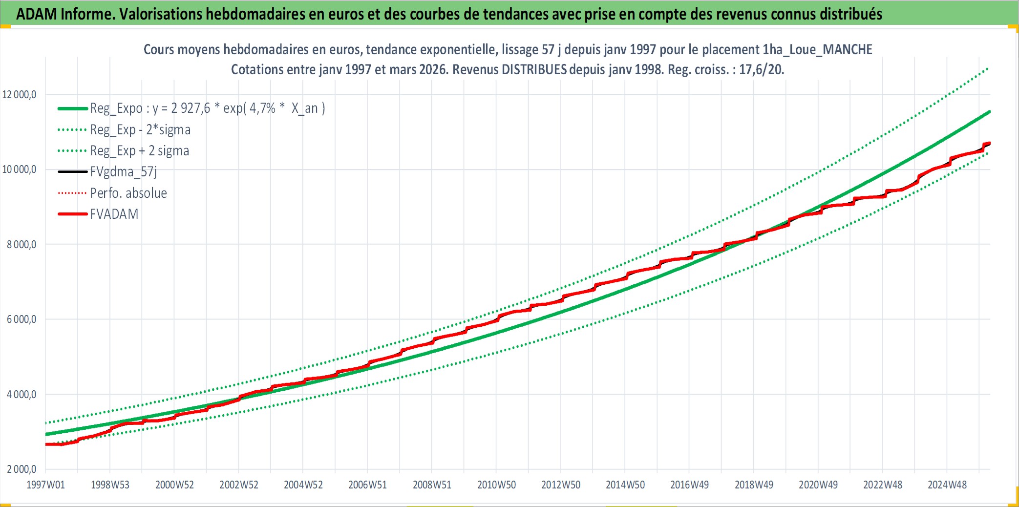 Site dédié aux investisseursPage dédiée sur site financeAnalyse des valorisations hebdomadaires de l'actif 1ha_Loue_MANCHE. Cet actif est cote en EUR. Les valorisations couvrent les semaines 1997W01 a 2026W13. Les fermages de ce bien foncier sont pris egaux a 2,5% annuels de la valeur venale du bien.