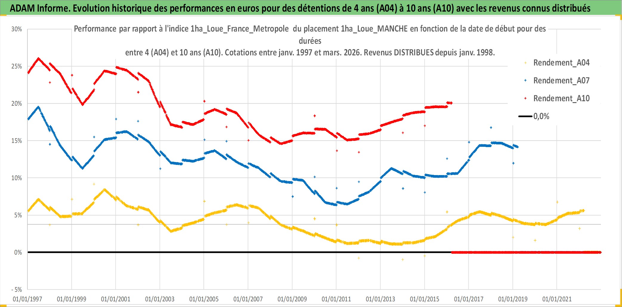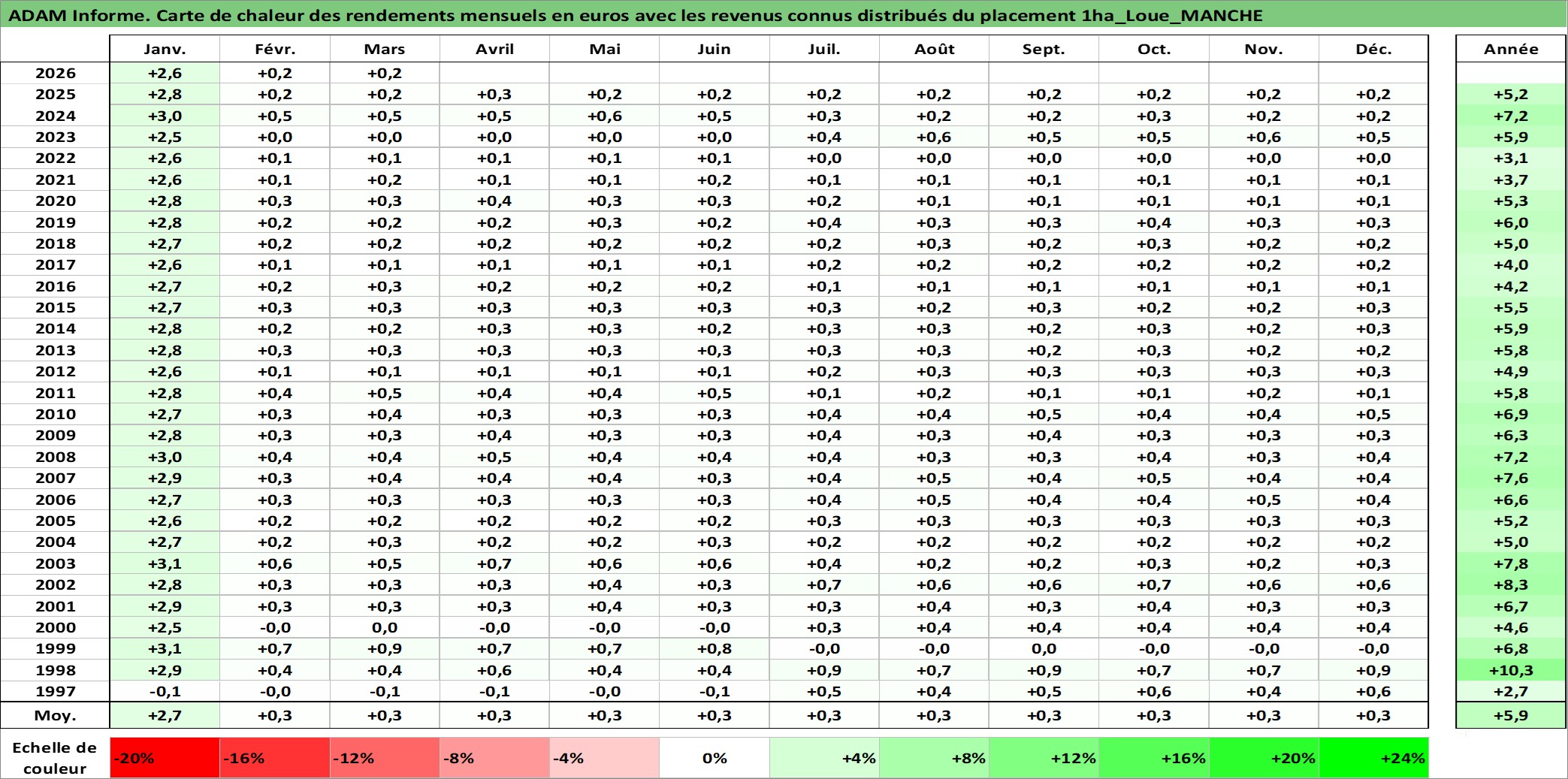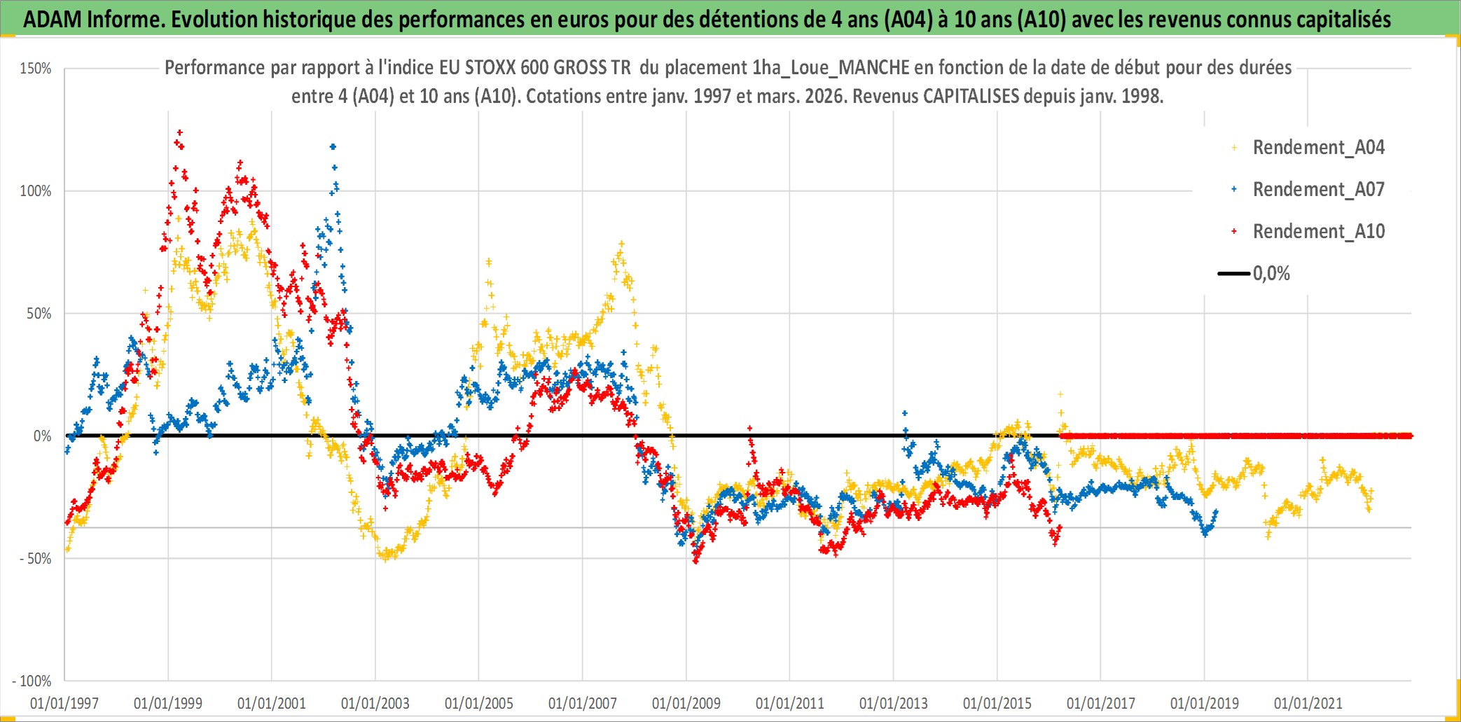 Site dédié aux investisseursPage dédiée sur site financeAnalyse des valorisations hebdomadaires de l'actif 1ha_Loue_MANCHE. Cet actif est cote en EUR. Les valorisations couvrent les semaines 1997W01 a 2026W13. Les fermages de ce bien foncier sont pris egaux a 2,5% annuels de la valeur venale du bien.