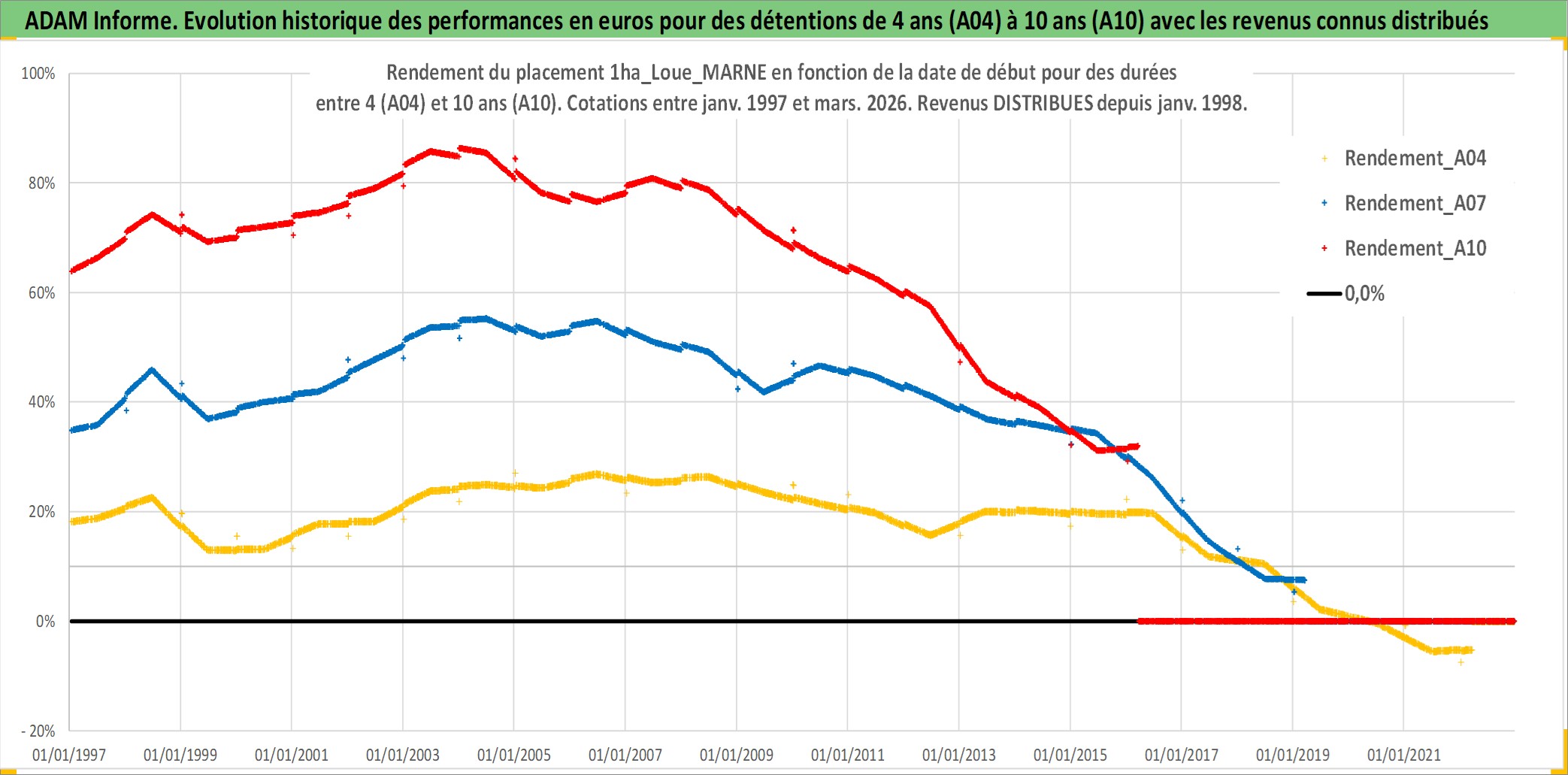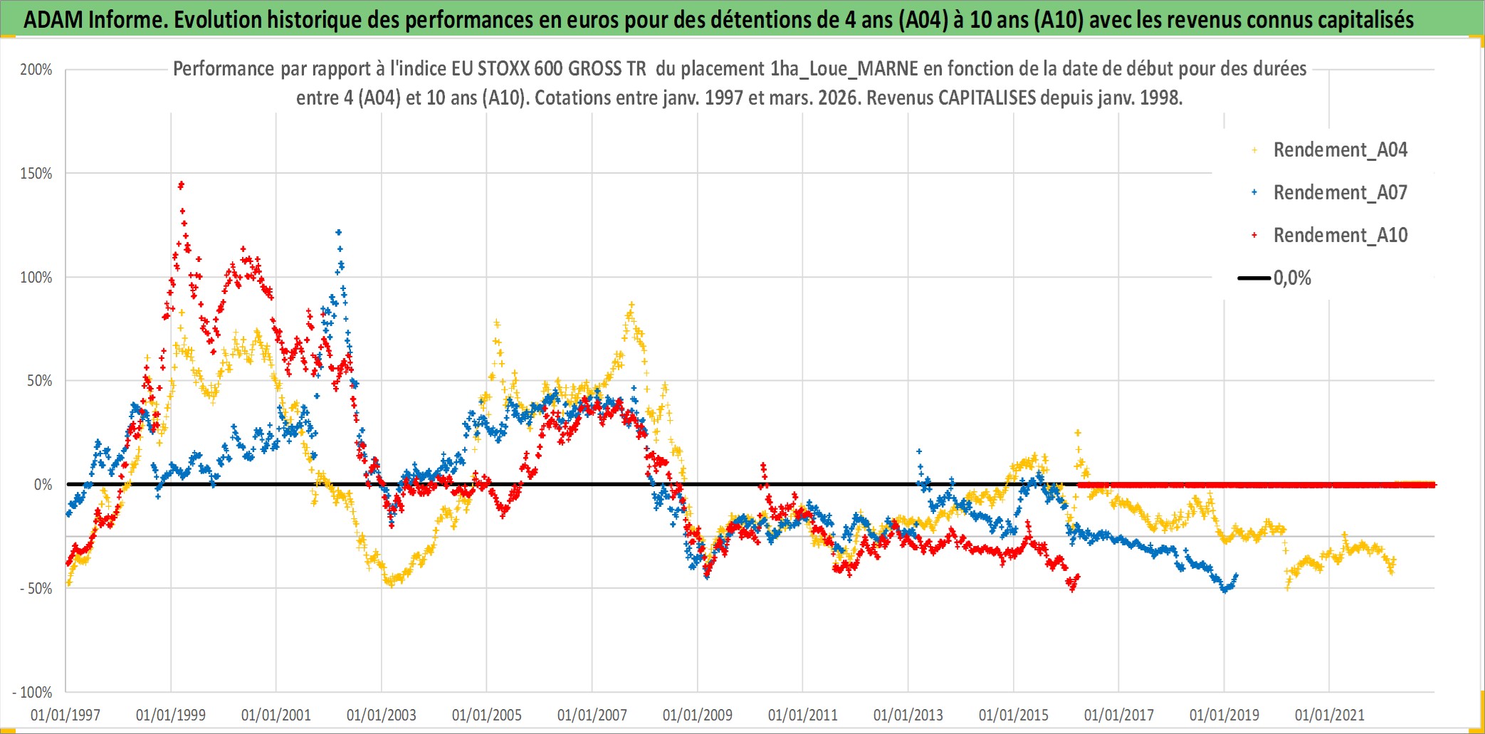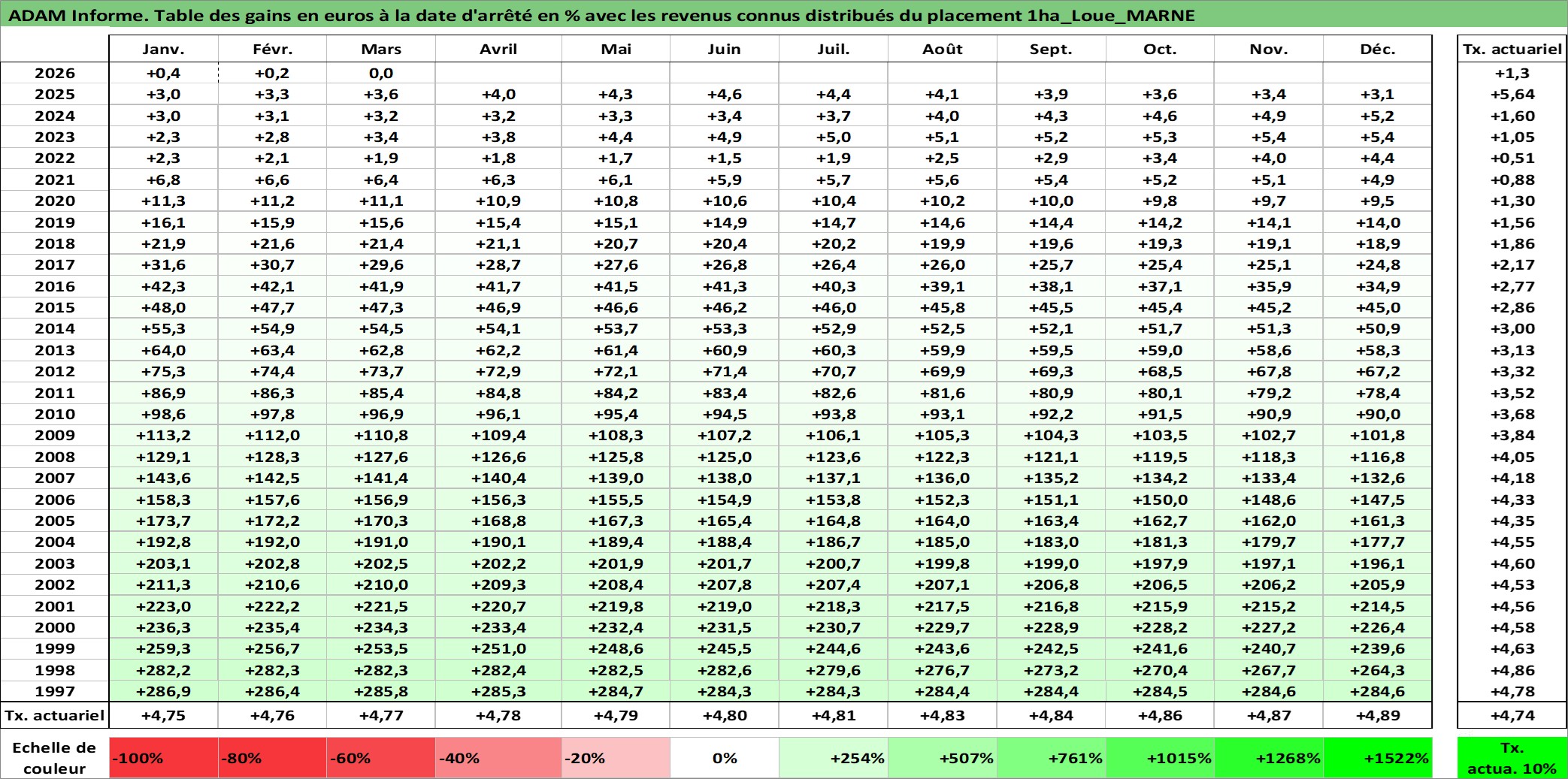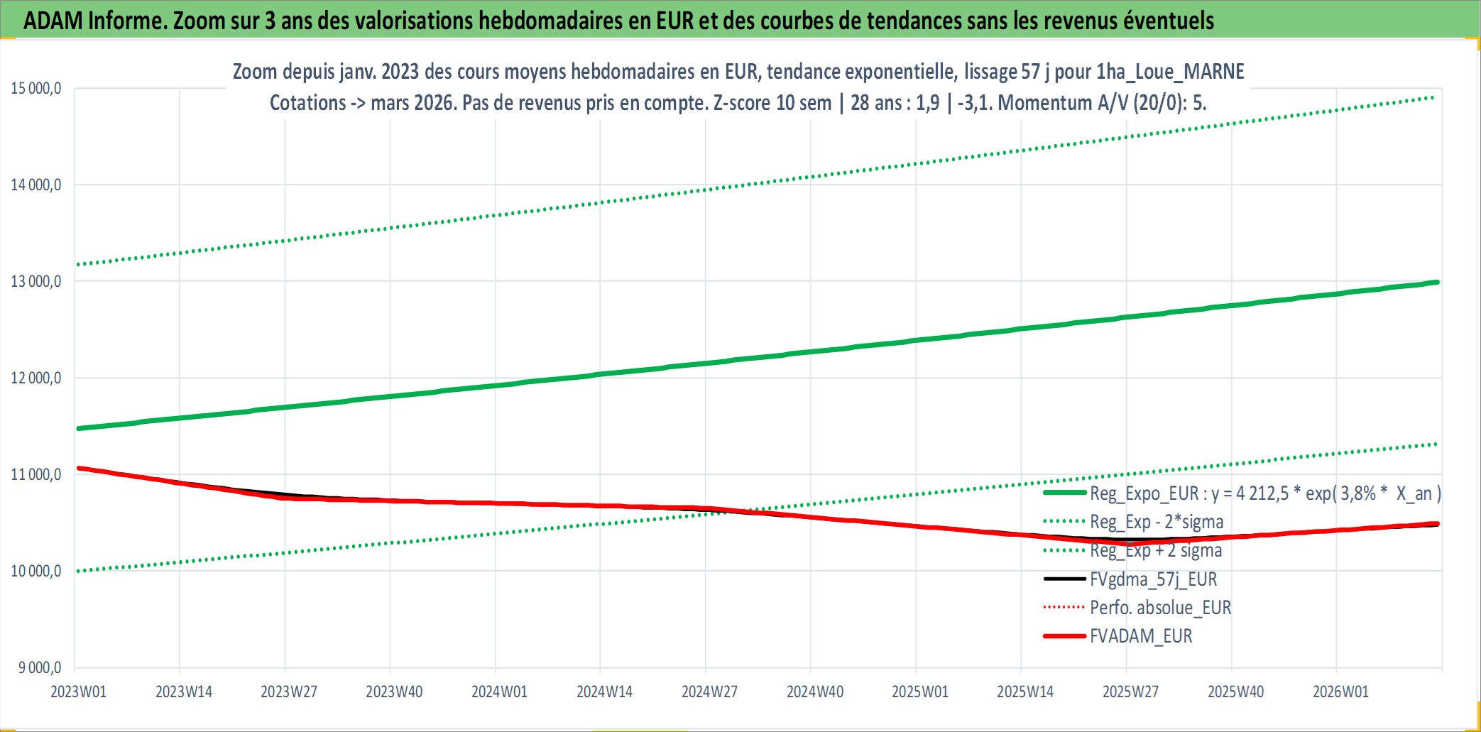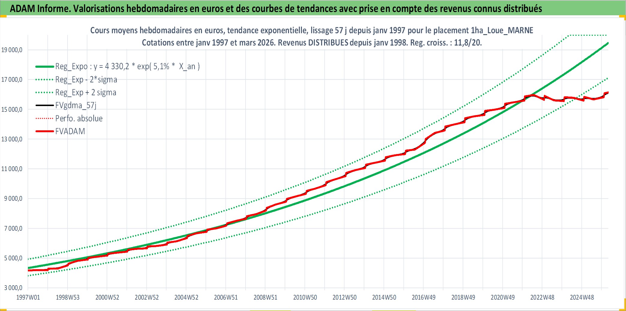Site dédié aux investisseursPage dédiée sur site financeAnalyse des valorisations hebdomadaires de l'actif 1ha_Loue_MARNE. Cet actif est cote en EUR. Les valorisations couvrent les semaines 1997W01 a 2026W13. Les fermages de ce bien foncier sont pris egaux a 2,5% annuels de la valeur venale du bien.