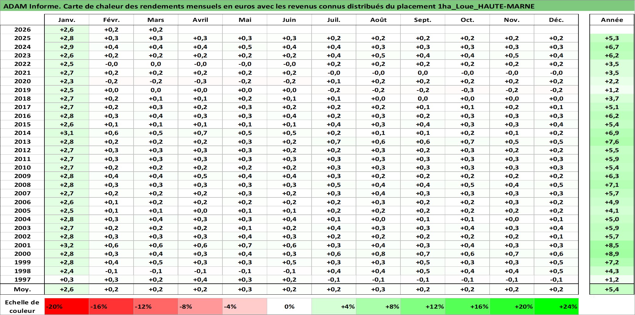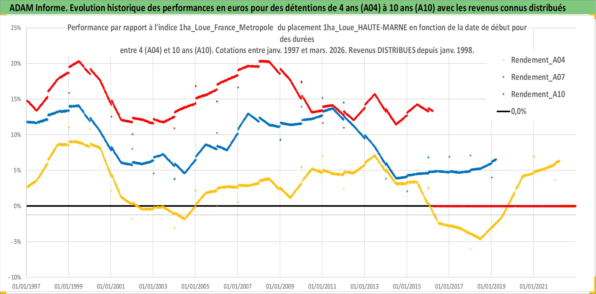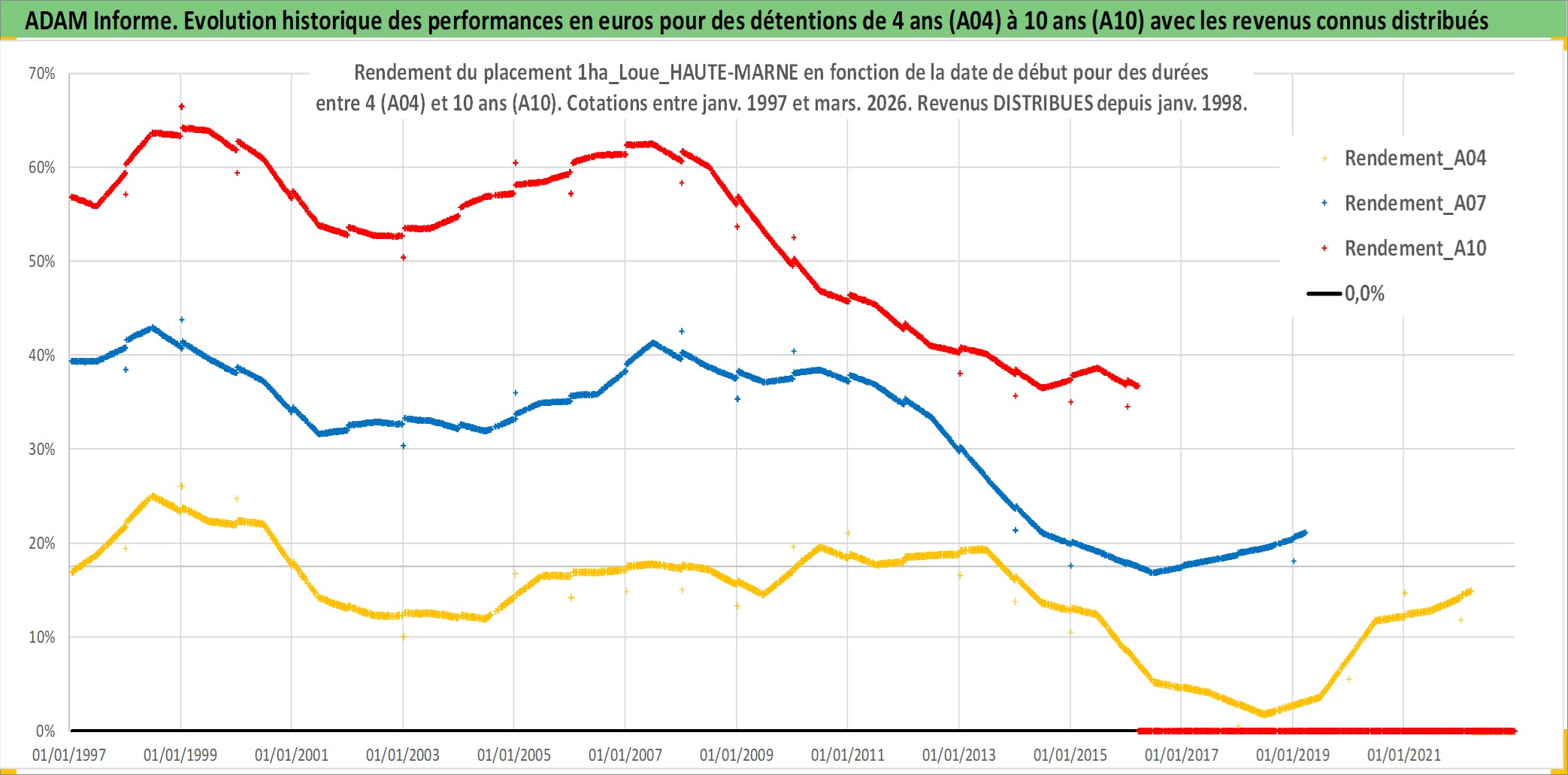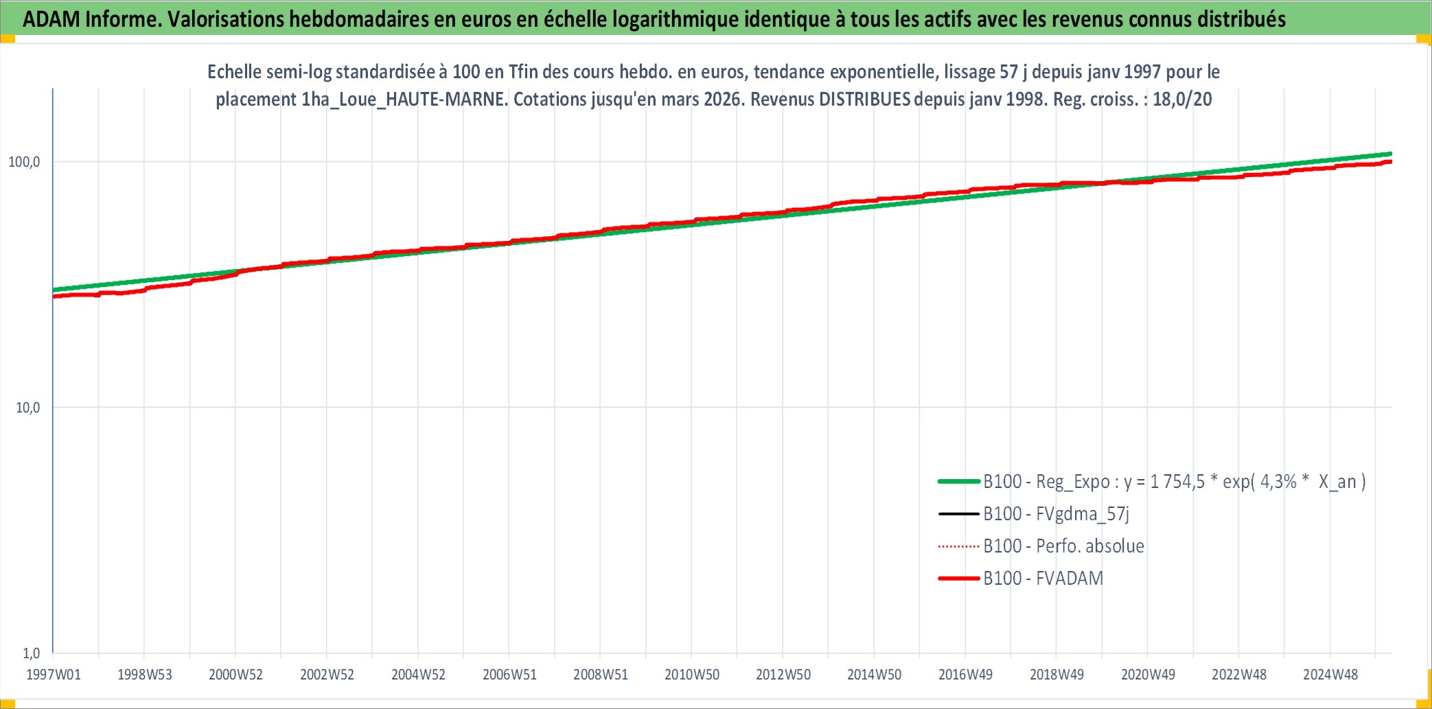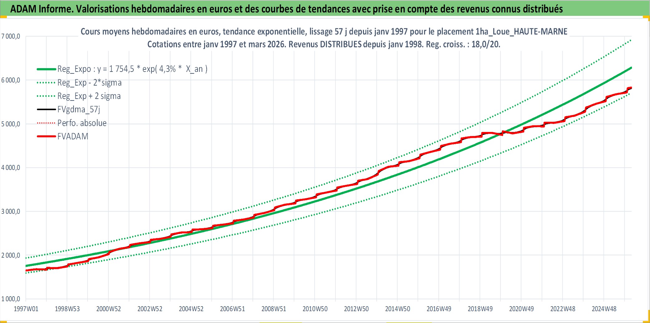 Site dédié aux investisseursPage dédiée sur site financeAnalyse des valorisations hebdomadaires de l'actif 1ha_Loue_HAUTE-MARNE. Cet actif est cote en EUR. Les valorisations couvrent les semaines 1997W01 a 2026W13. Les fermages de ce bien foncier sont pris egaux a 2,5% annuels de la valeur venale du bien.