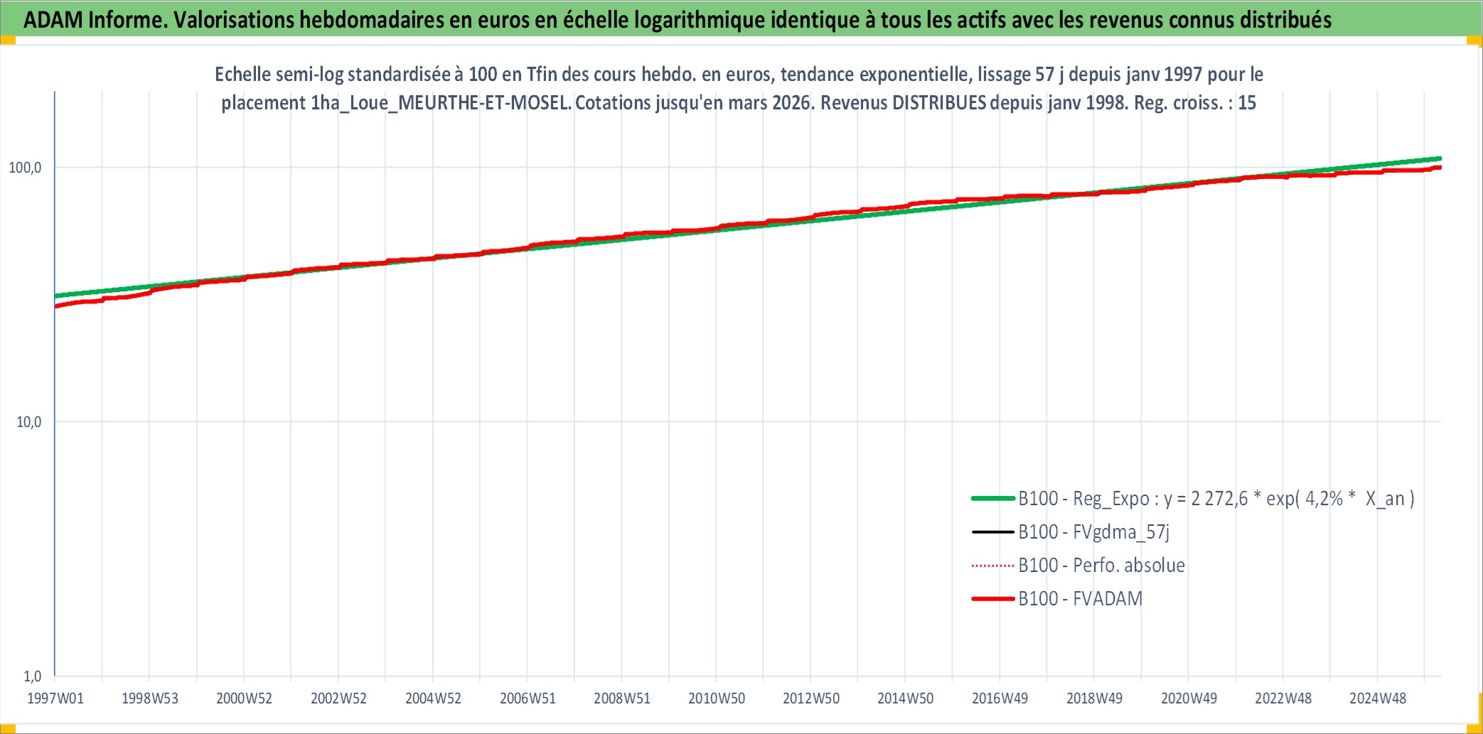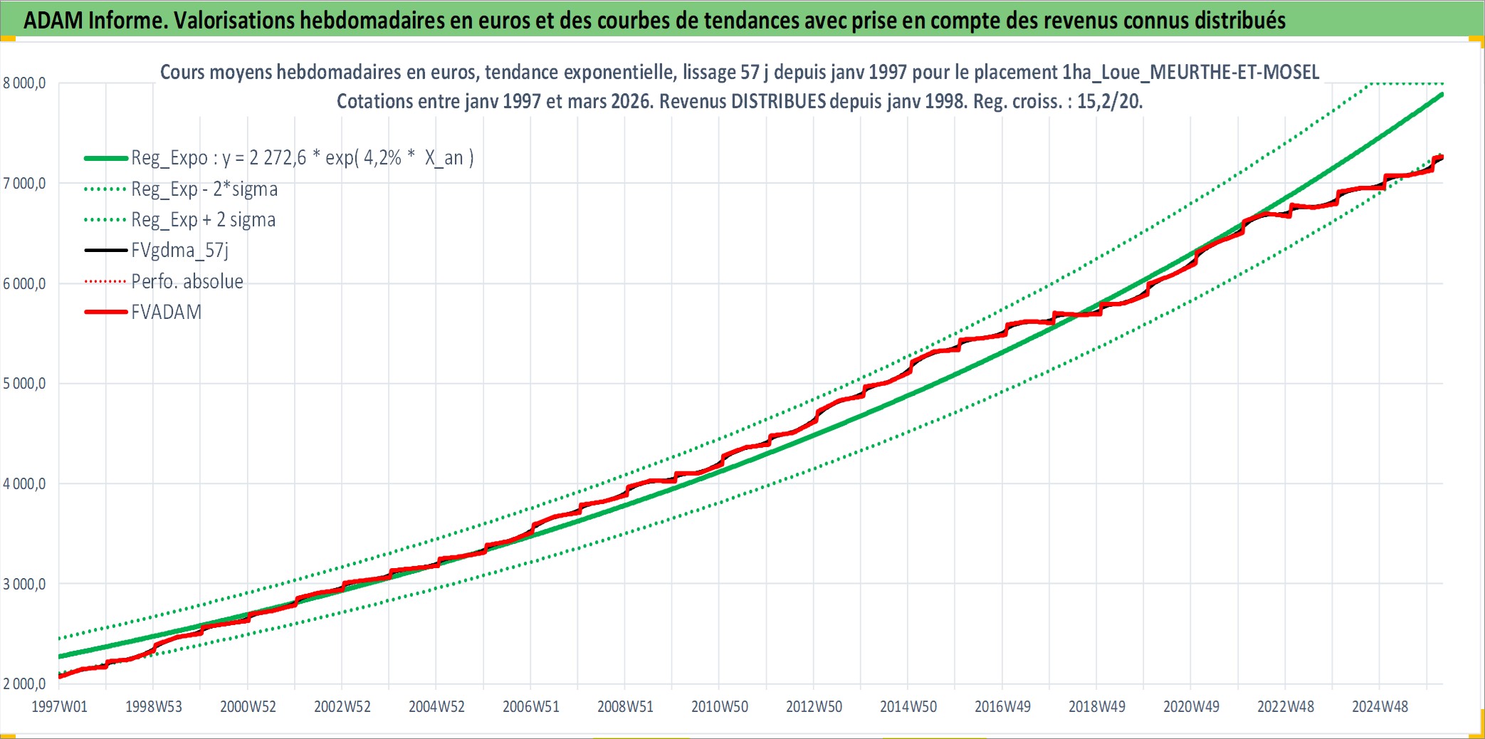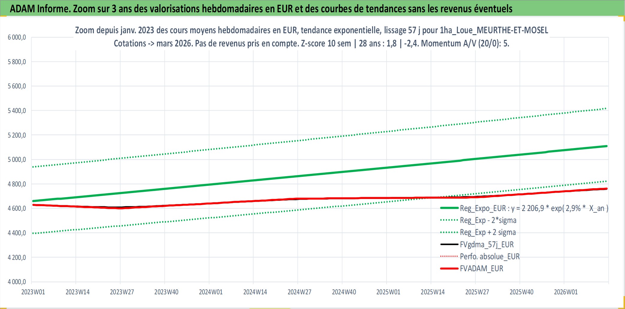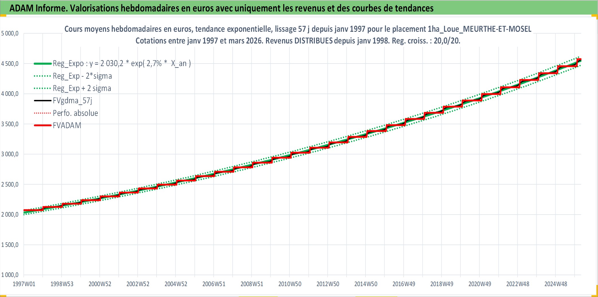 Site dédié aux investisseursPage dédiée sur site financeAnalyse des valorisations hebdomadaires de l'actif 1ha_Loue_MEURTHE-ET-MOSELLE. Cet actif est cote en EUR. Les valorisations couvrent les semaines 1997W01 a 2026W13. Les fermages de ce bien foncier sont pris egaux a 2,5% annuels de la valeur venale du bien.