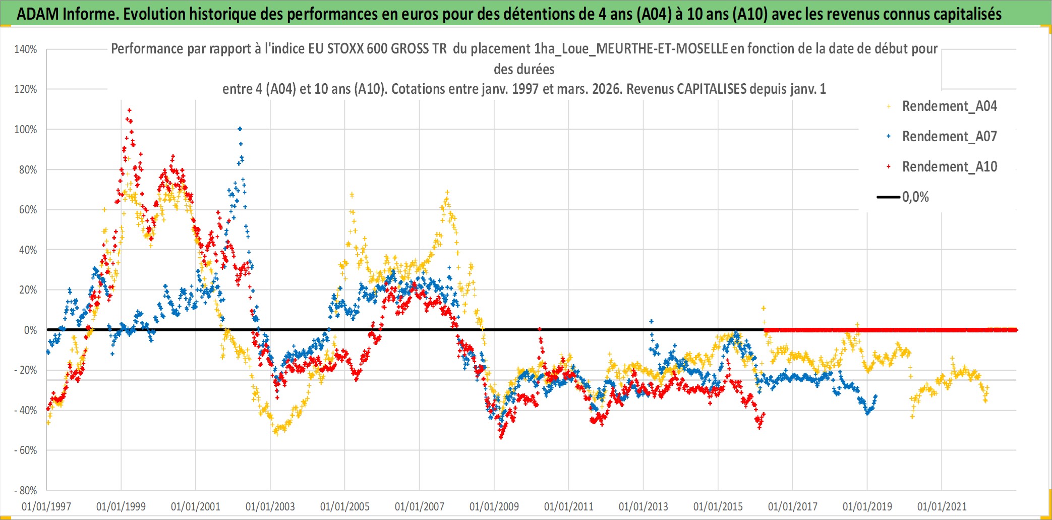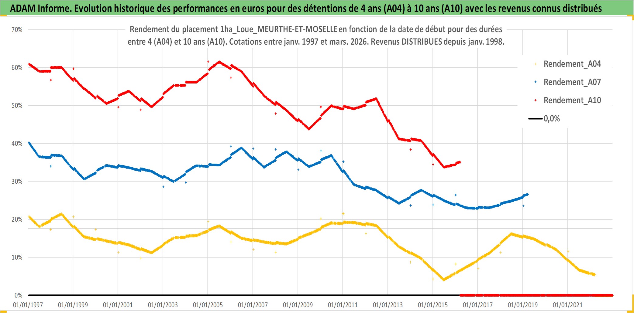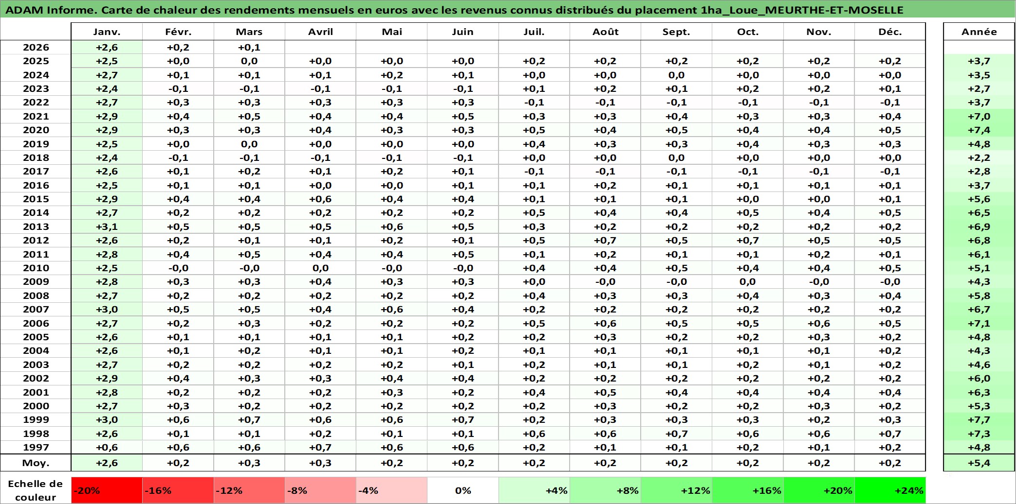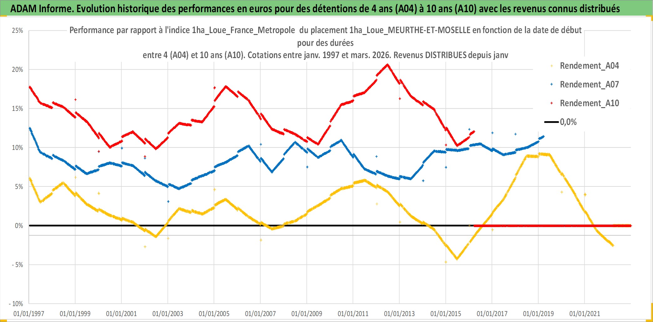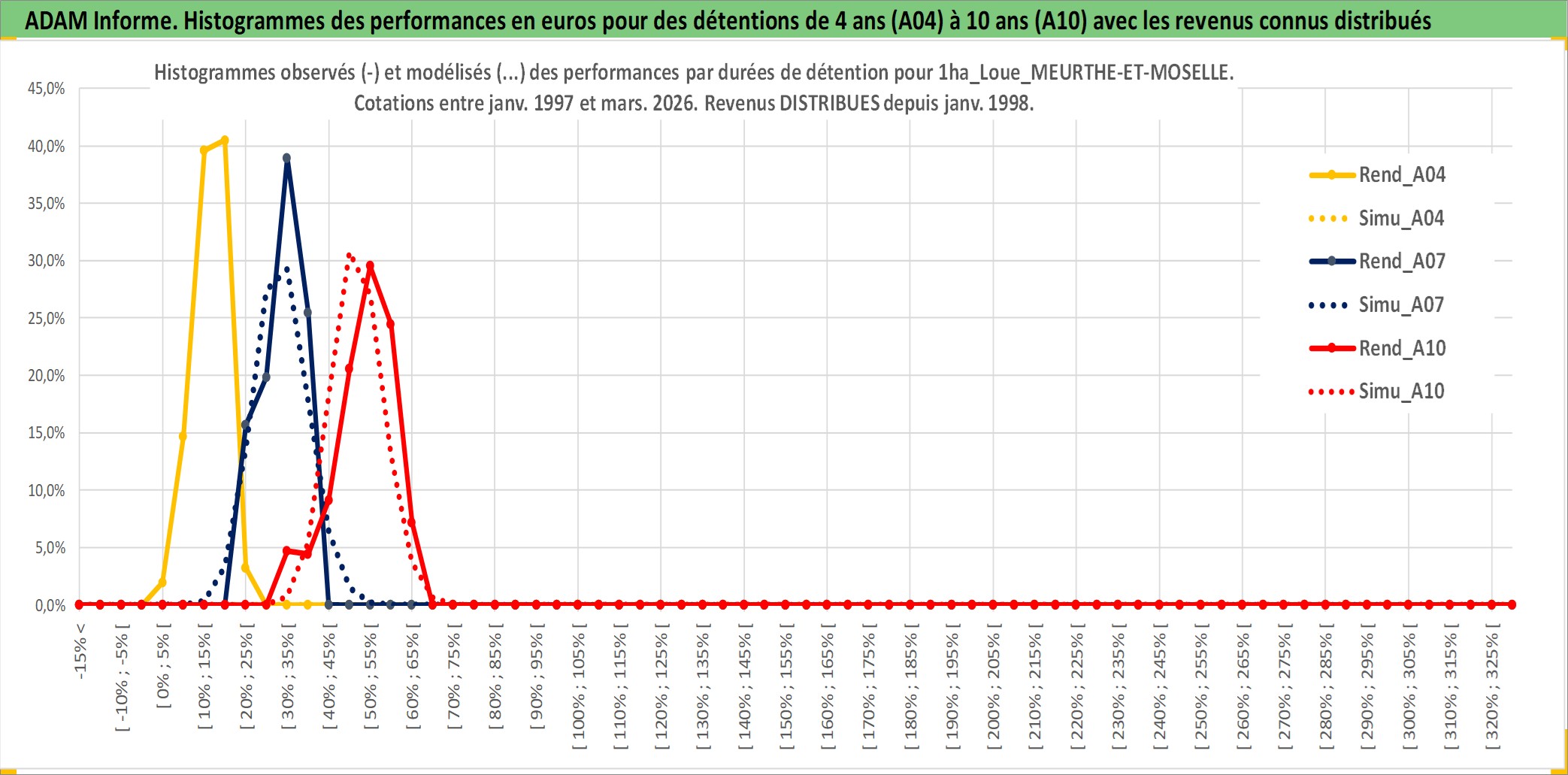 Site dédié aux investisseursPage dédiée sur site financeAnalyse des valorisations hebdomadaires de l'actif 1ha_Loue_MEURTHE-ET-MOSELLE. Cet actif est cote en EUR. Les valorisations couvrent les semaines 1997W01 a 2026W13. Les fermages de ce bien foncier sont pris egaux a 2,5% annuels de la valeur venale du bien.