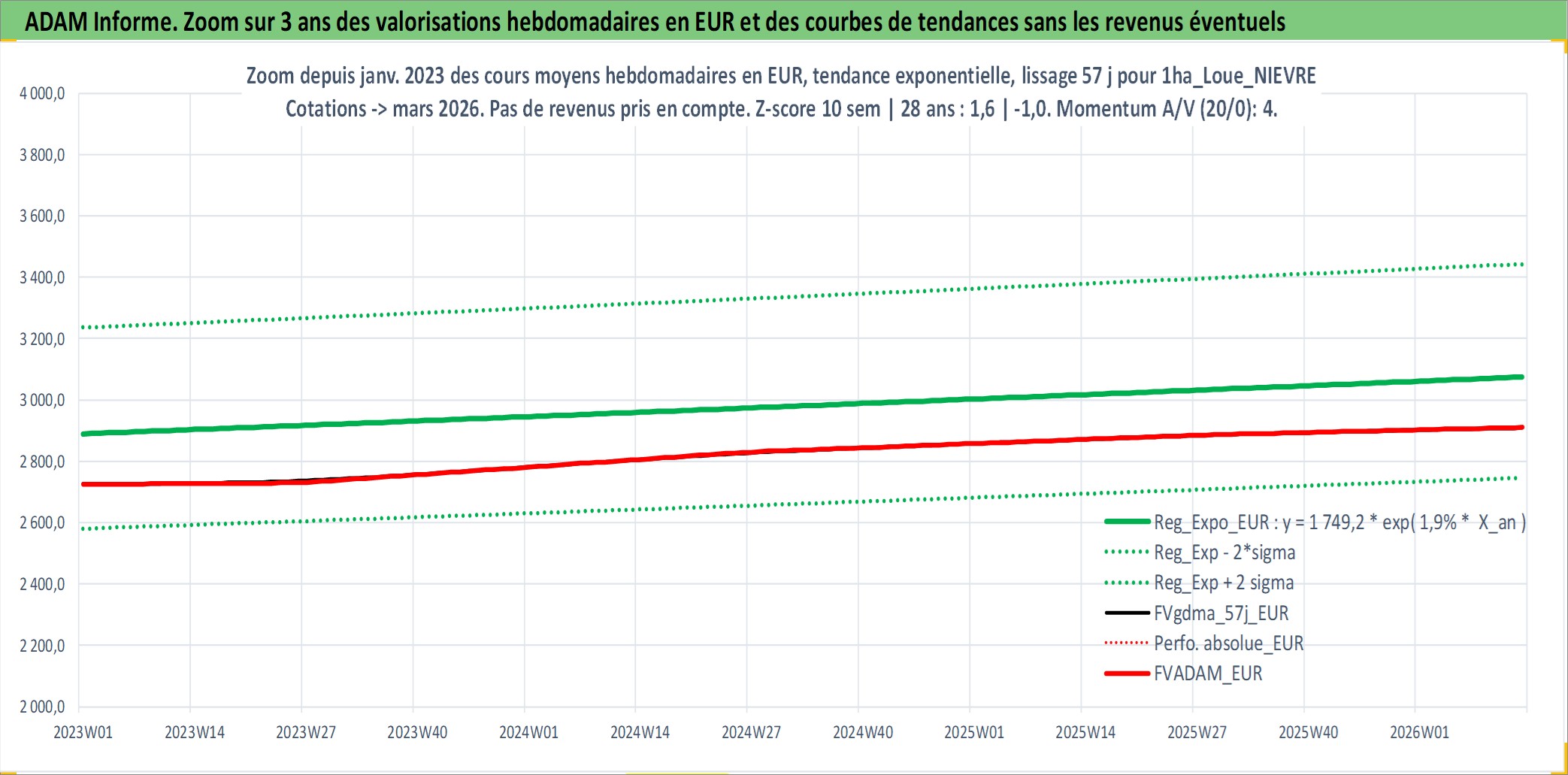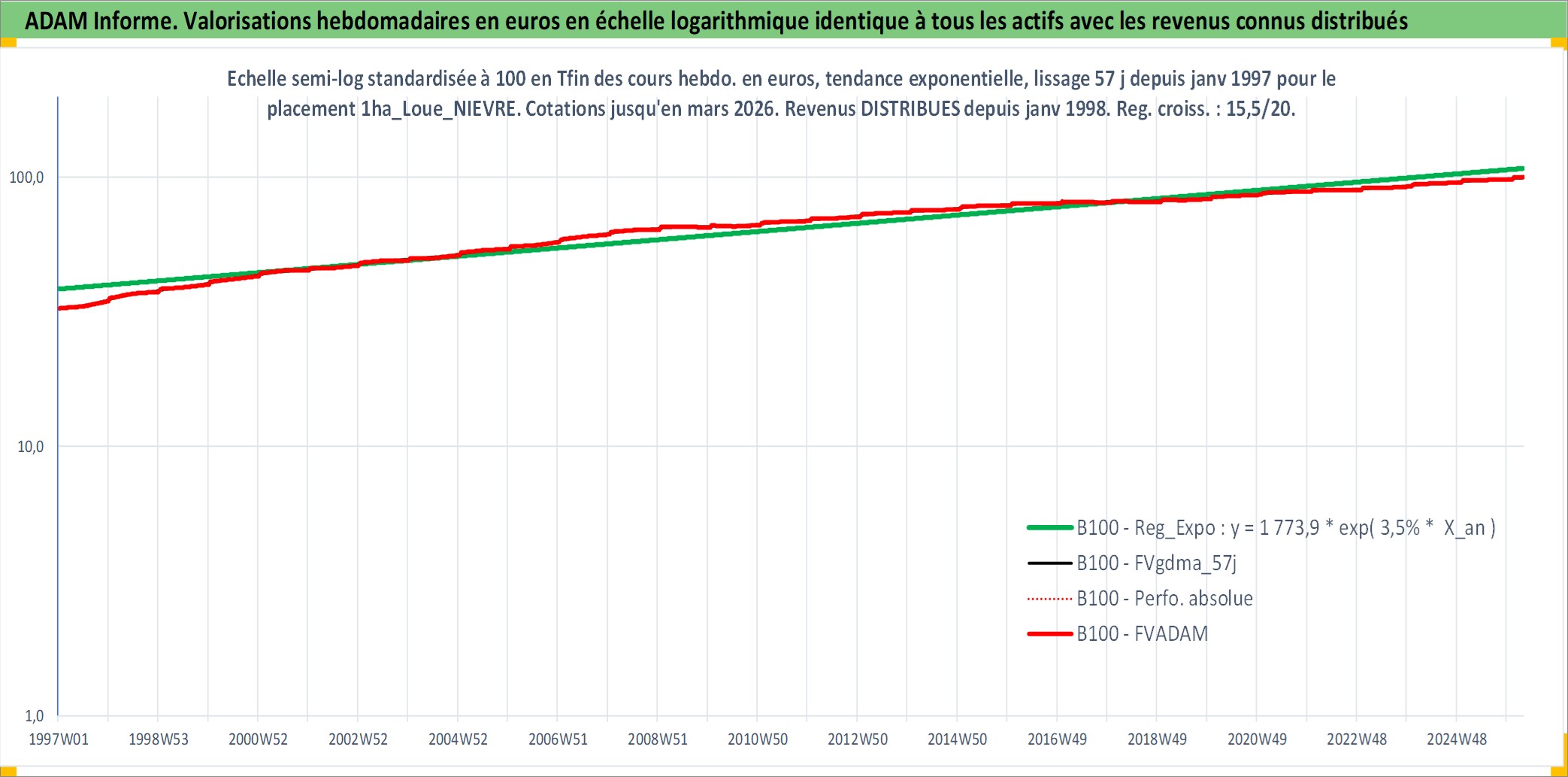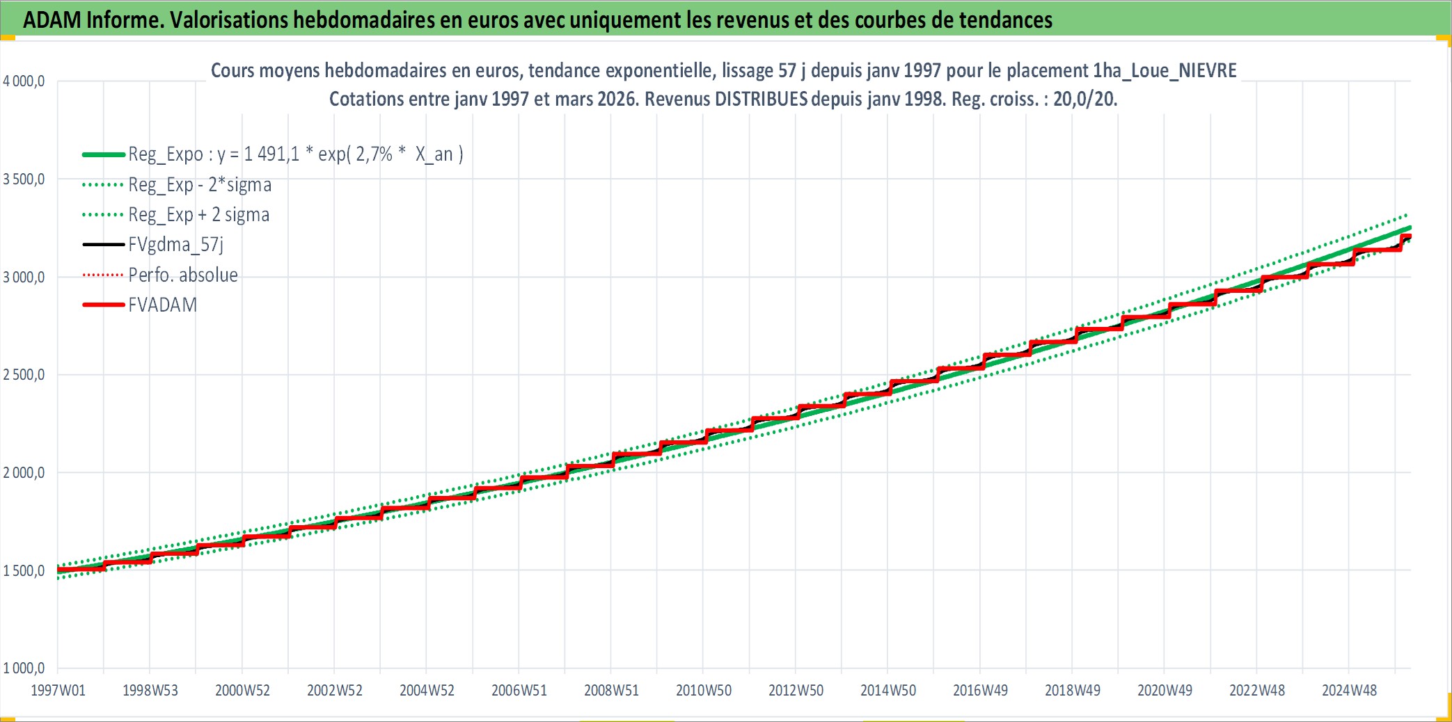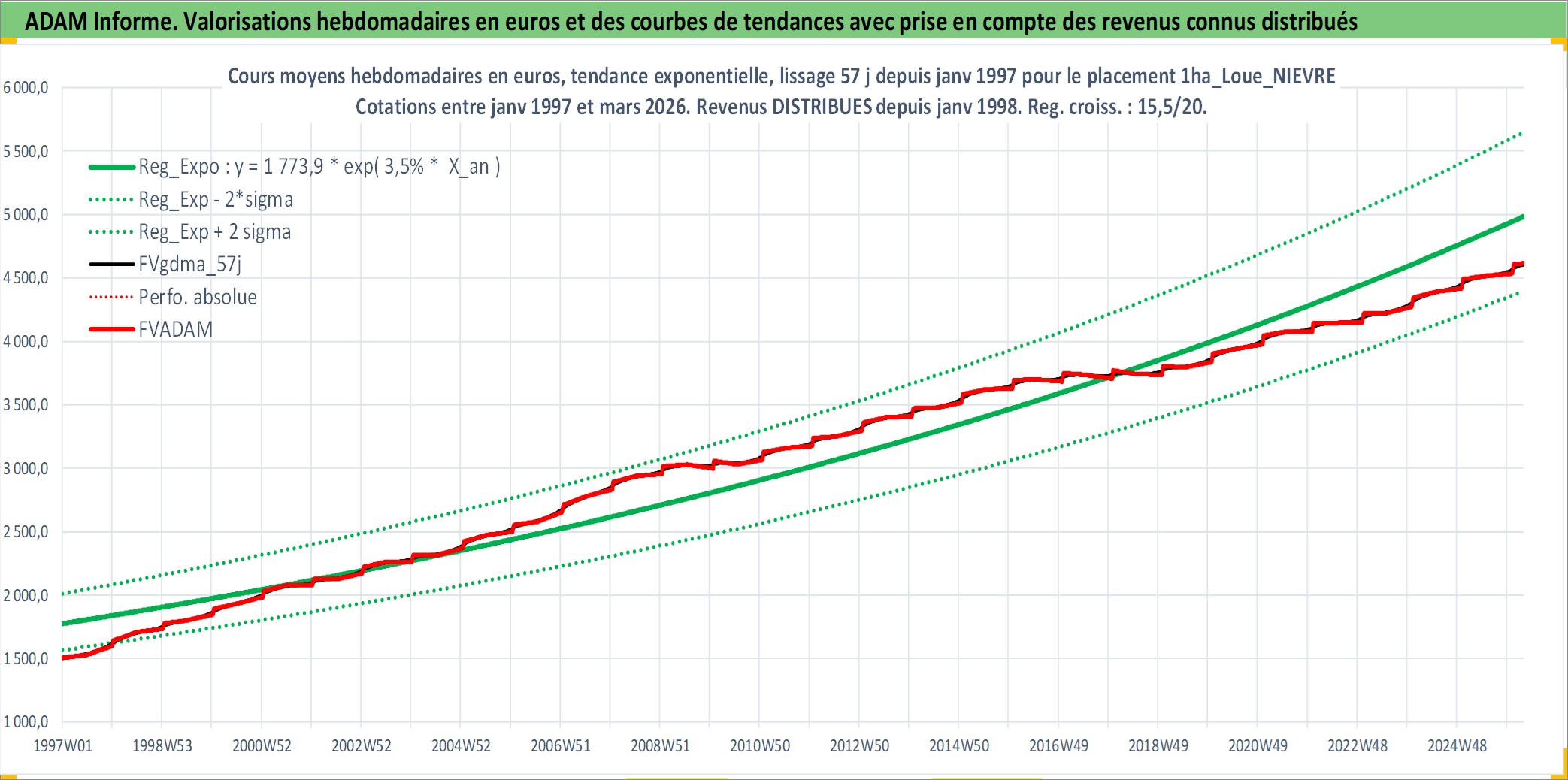 Site dédié aux investisseursPage dédiée sur site financeAnalyse des valorisations hebdomadaires de l'actif 1ha_Loue_NIEVRE. Cet actif est cote en EUR. Les valorisations couvrent les semaines 1997W01 a 2026W13. Les fermages de ce bien foncier sont pris egaux a 2,5% annuels de la valeur venale du bien.