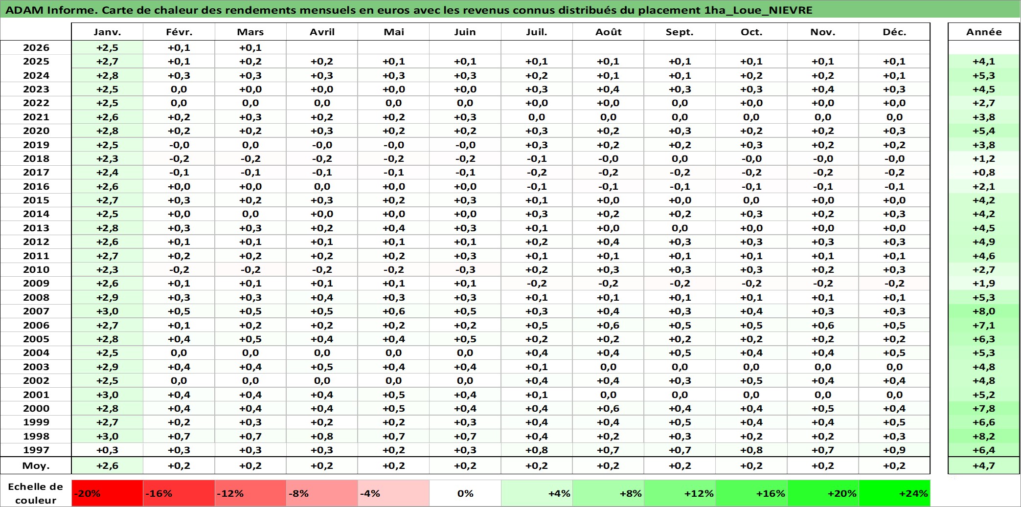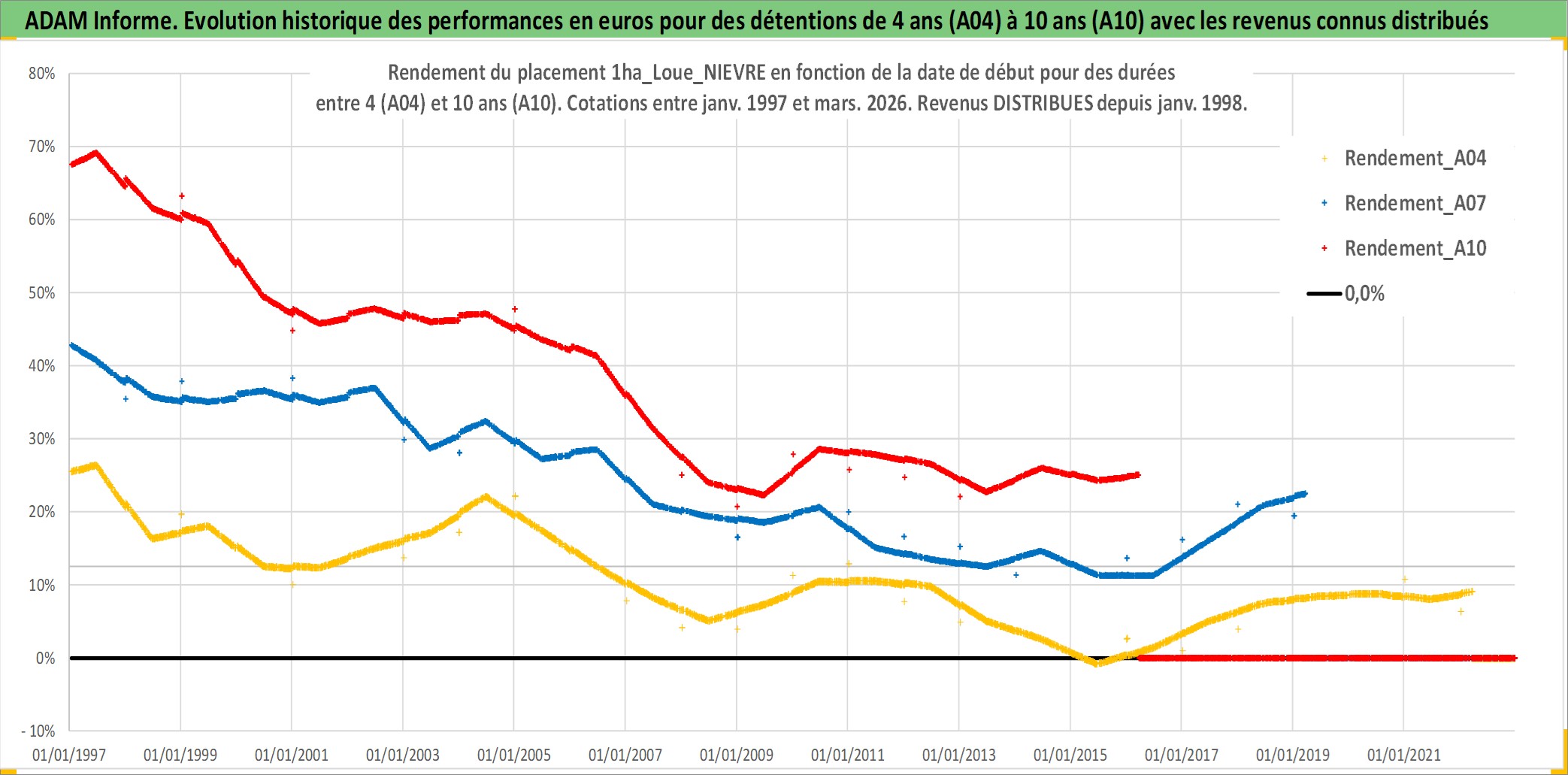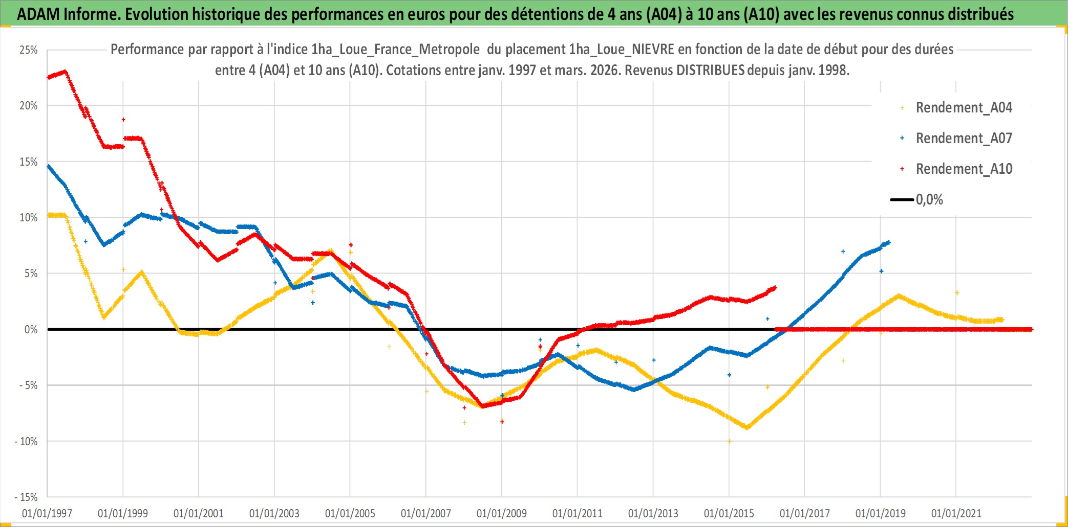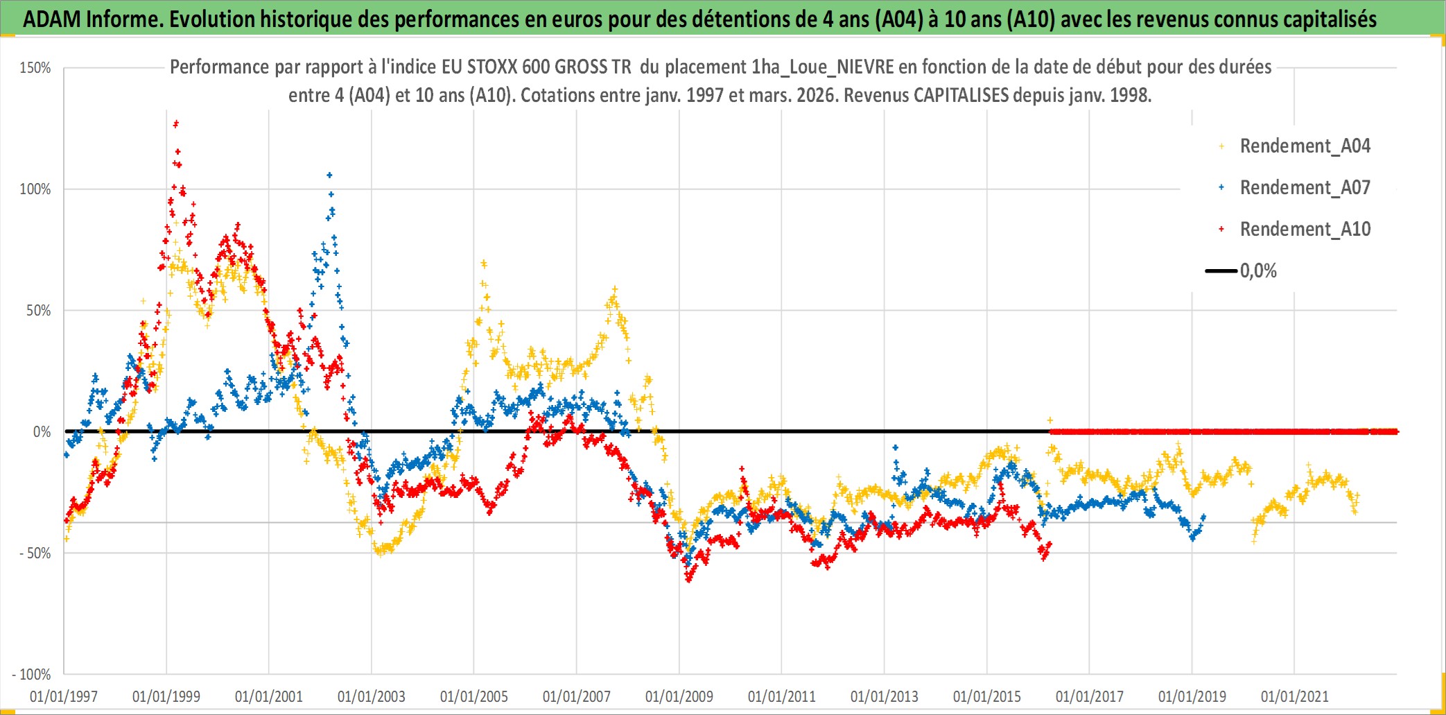 Site dédié aux investisseursPage dédiée sur site financeAnalyse des valorisations hebdomadaires de l'actif 1ha_Loue_NIEVRE. Cet actif est cote en EUR. Les valorisations couvrent les semaines 1997W01 a 2026W13. Les fermages de ce bien foncier sont pris egaux a 2,5% annuels de la valeur venale du bien.