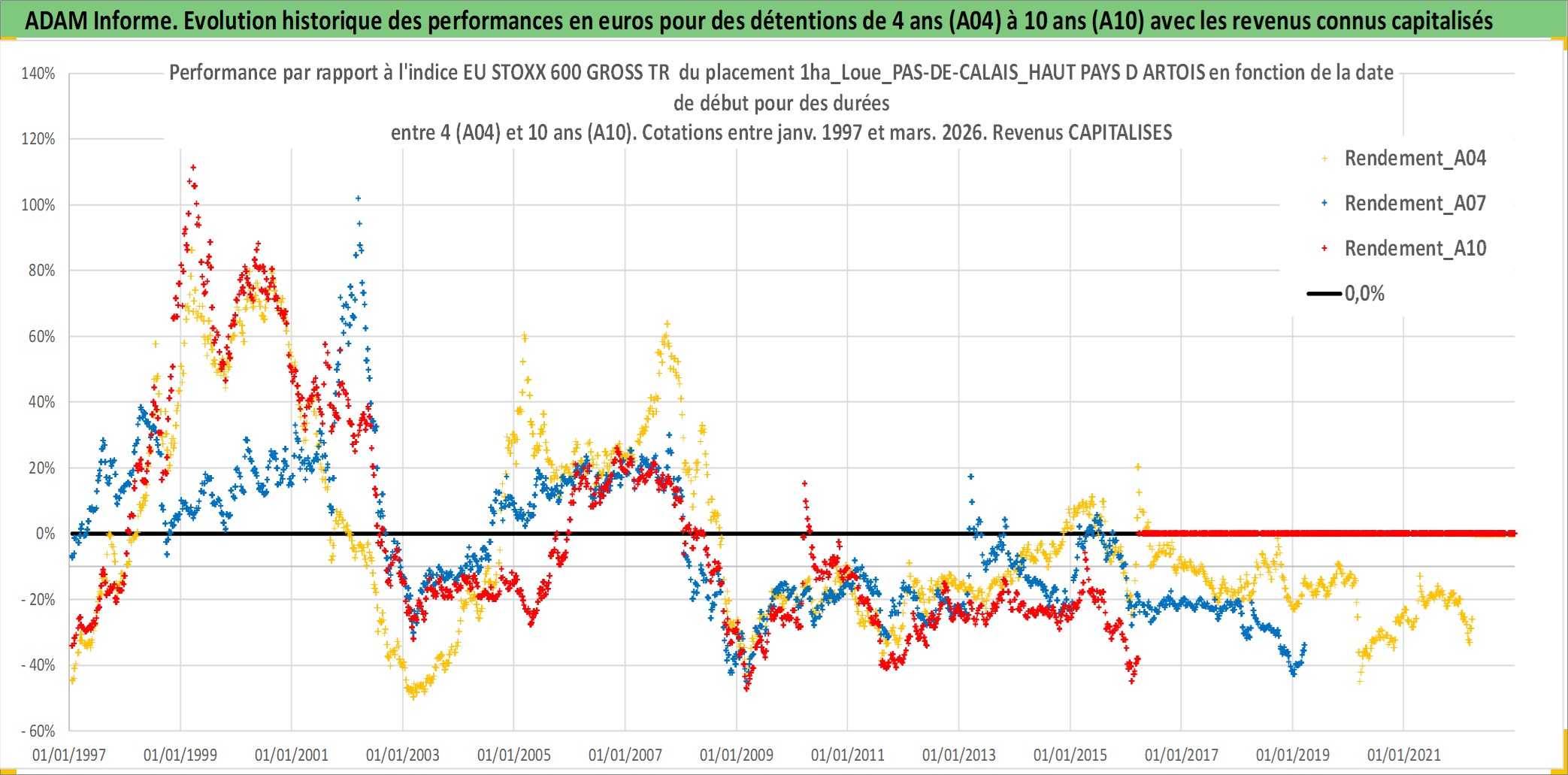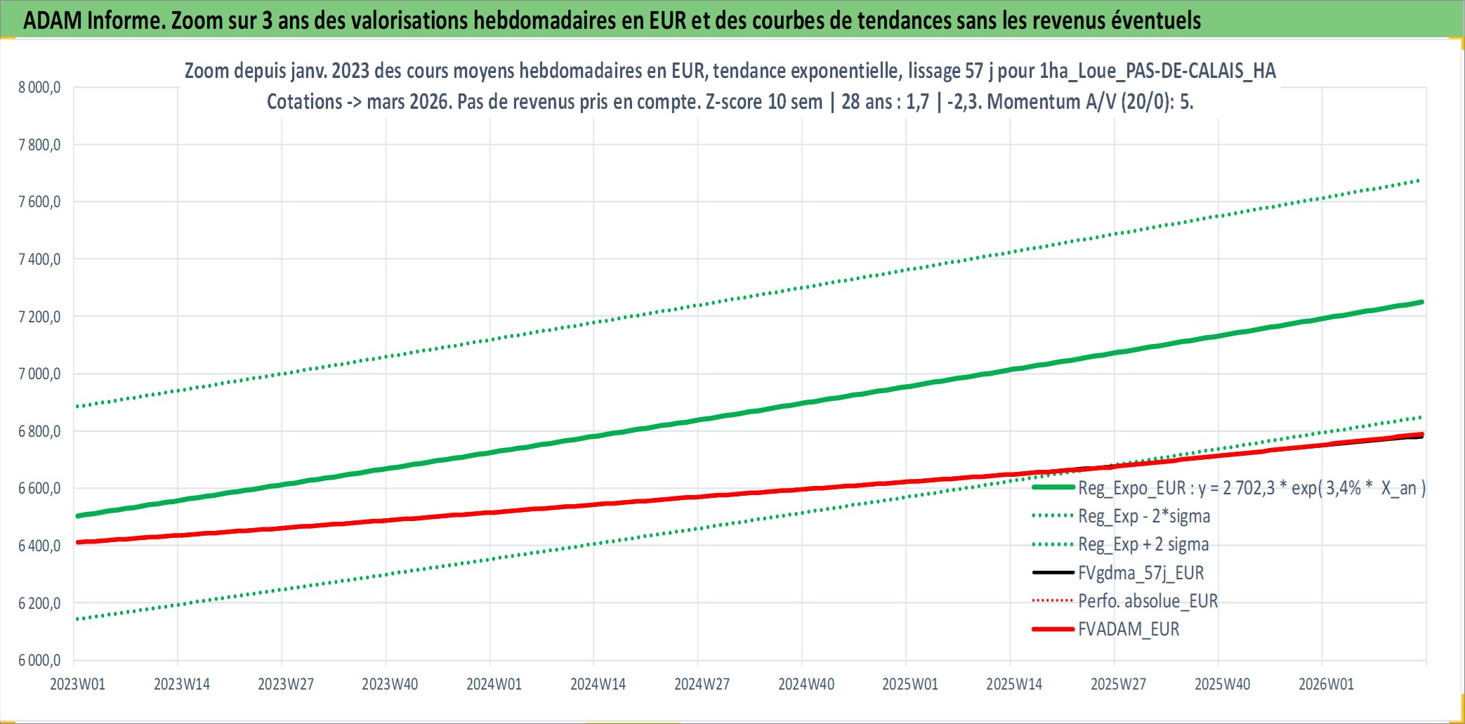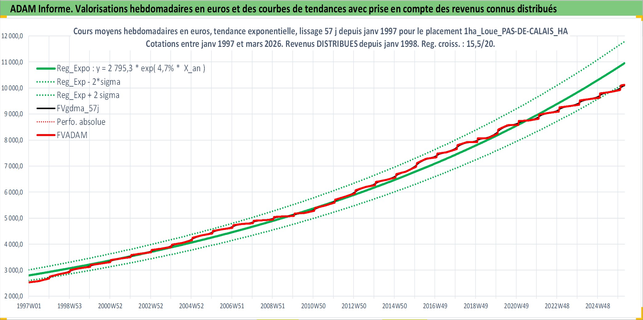 Site dédié aux investisseursPage dédiée sur site financeAnalyse des valorisations hebdomadaires de l'actif 1ha_Loue_PAS-DE-CALAIS_HAUT PAYS D ARTOIS. Cet actif est cote en EUR. Les valorisations couvrent les semaines 1997W01 a 2026W13. Les fermages de ce bien foncier sont pris egaux a 2,5% annuels de la valeur venale du bien.