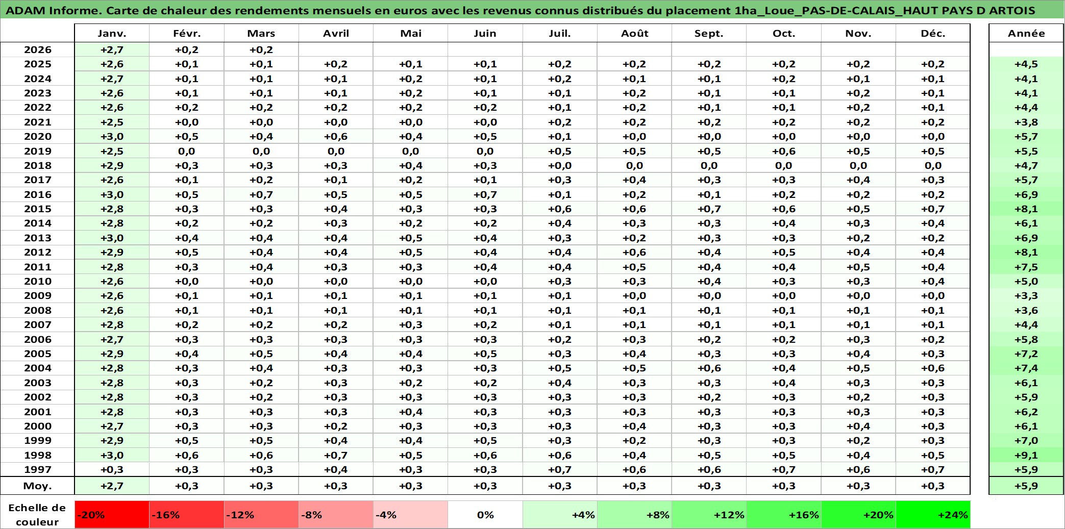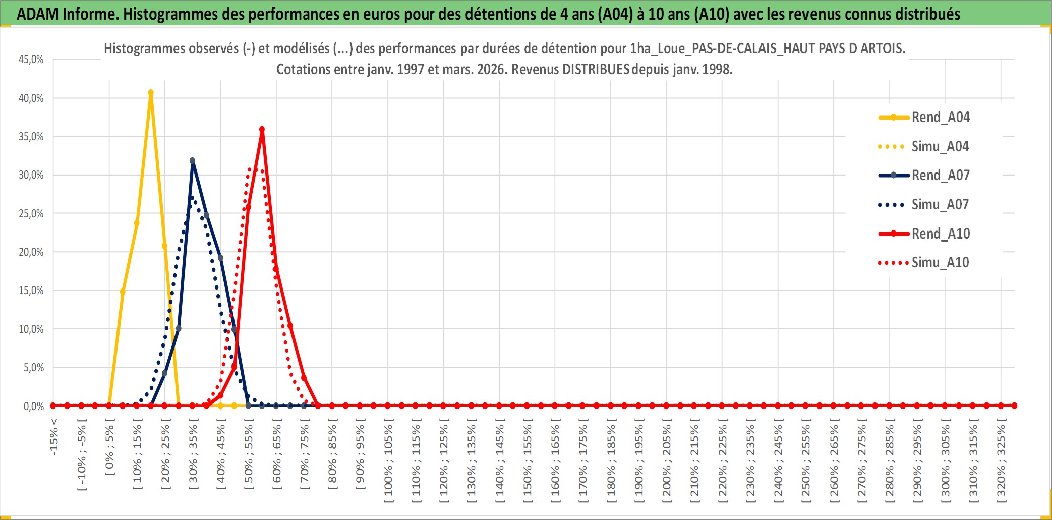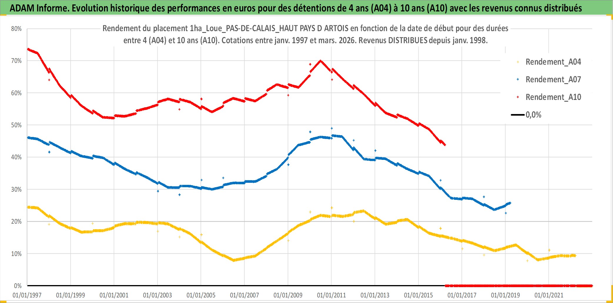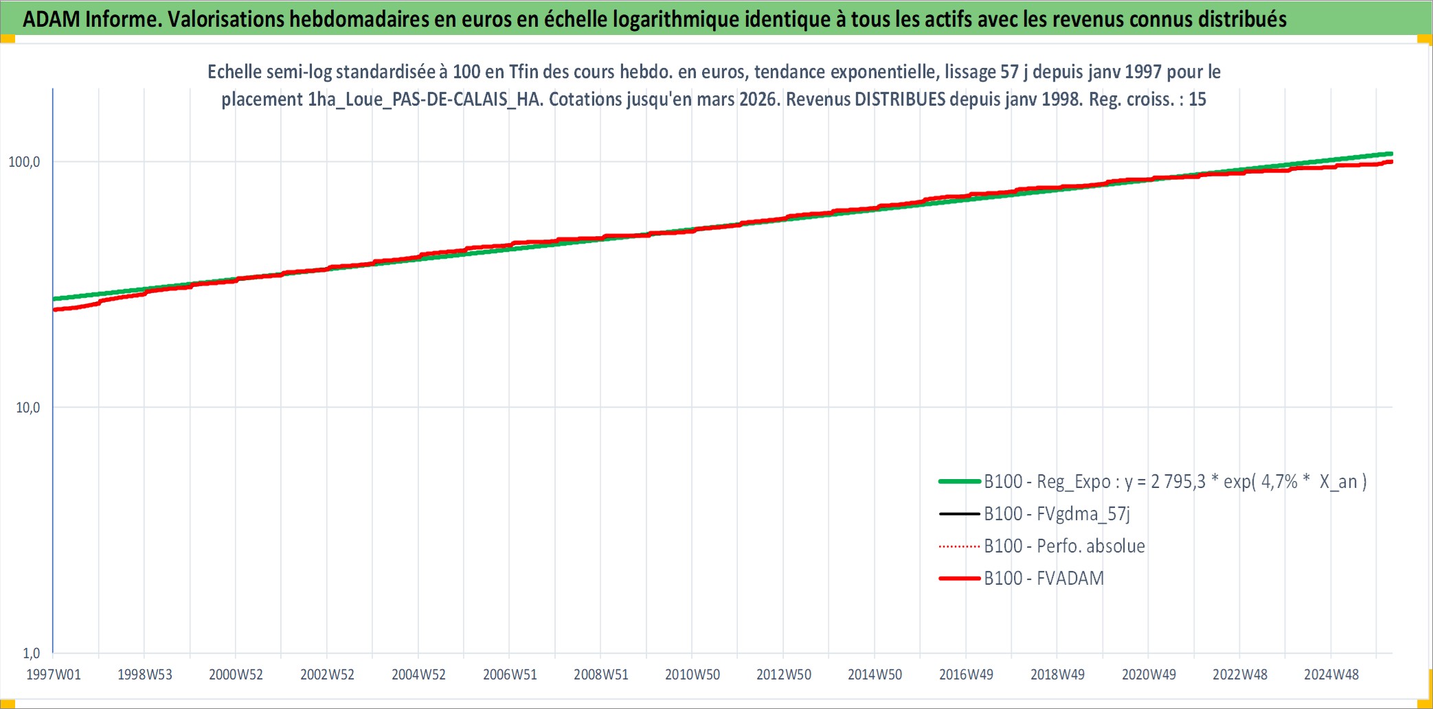 Site dédié aux investisseursPage dédiée sur site financeAnalyse des valorisations hebdomadaires de l'actif 1ha_Loue_PAS-DE-CALAIS_HAUT PAYS D ARTOIS. Cet actif est cote en EUR. Les valorisations couvrent les semaines 1997W01 a 2026W13. Les fermages de ce bien foncier sont pris egaux a 2,5% annuels de la valeur venale du bien.