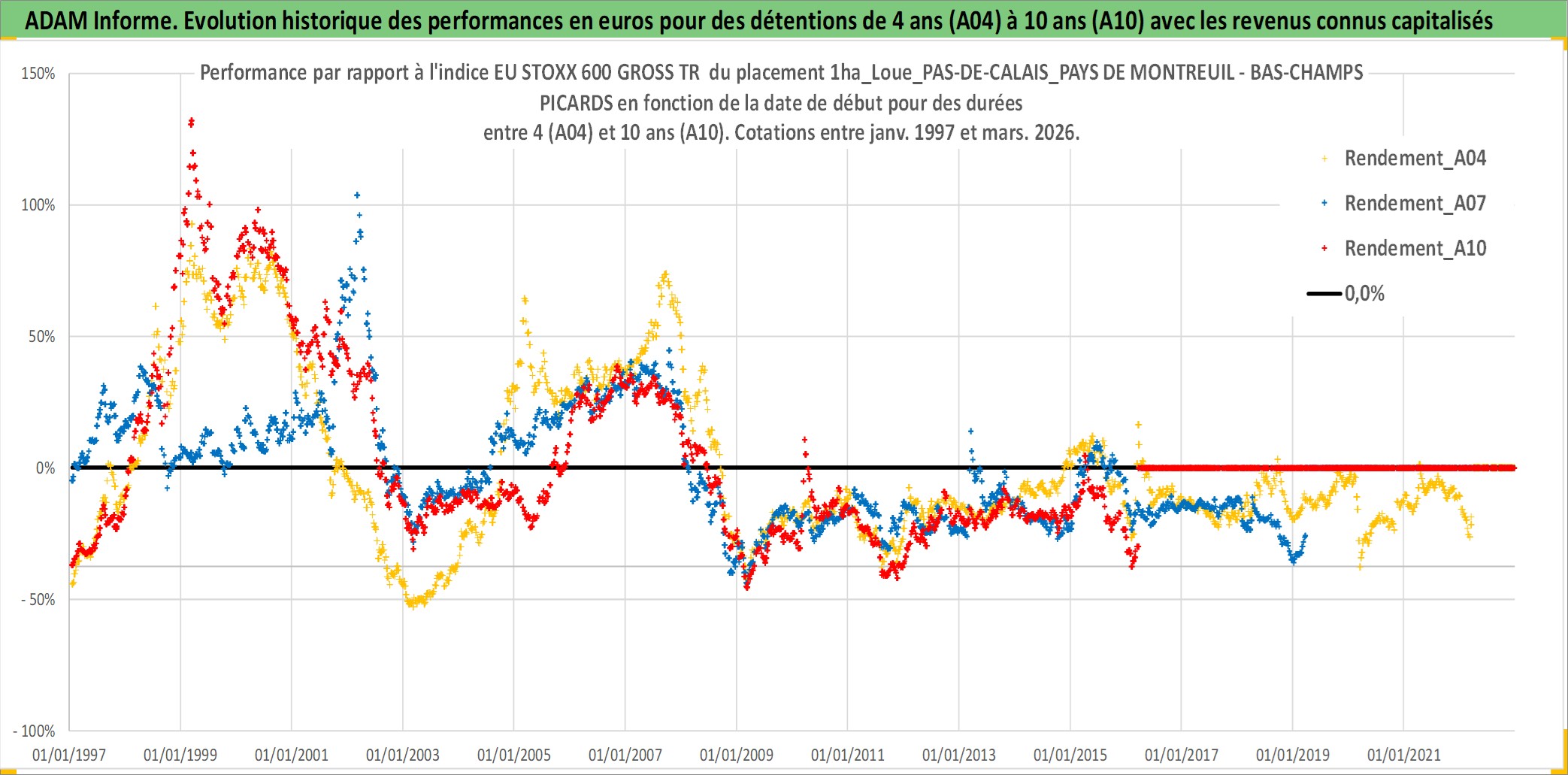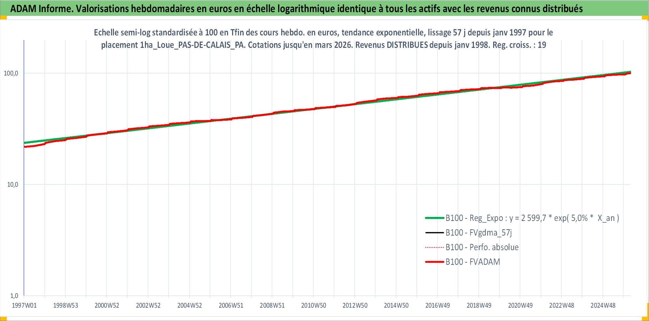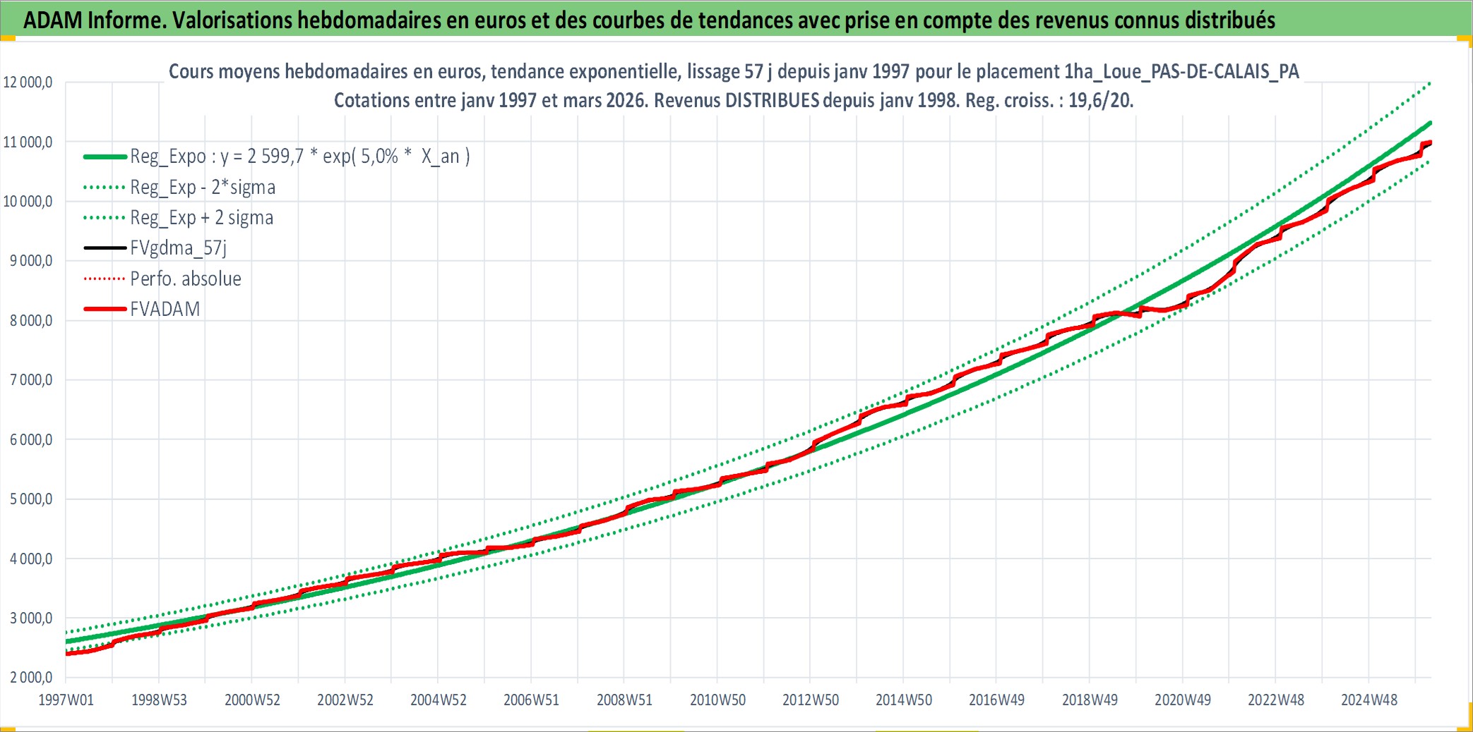 Site dédié aux investisseursPage dédiée sur site financeAnalyse des valorisations hebdomadaires de l'actif 1ha_Loue_PAS-DE-CALAIS_PAYS DE MONTREUIL - BAS-CHAMPS PICARDS. Cet actif est cote en EUR. Les valorisations couvrent les semaines 1997W01 a 2026W13. Les fermages de ce bien foncier sont pris egaux a 2,5% annuels de la valeur venale du bien.