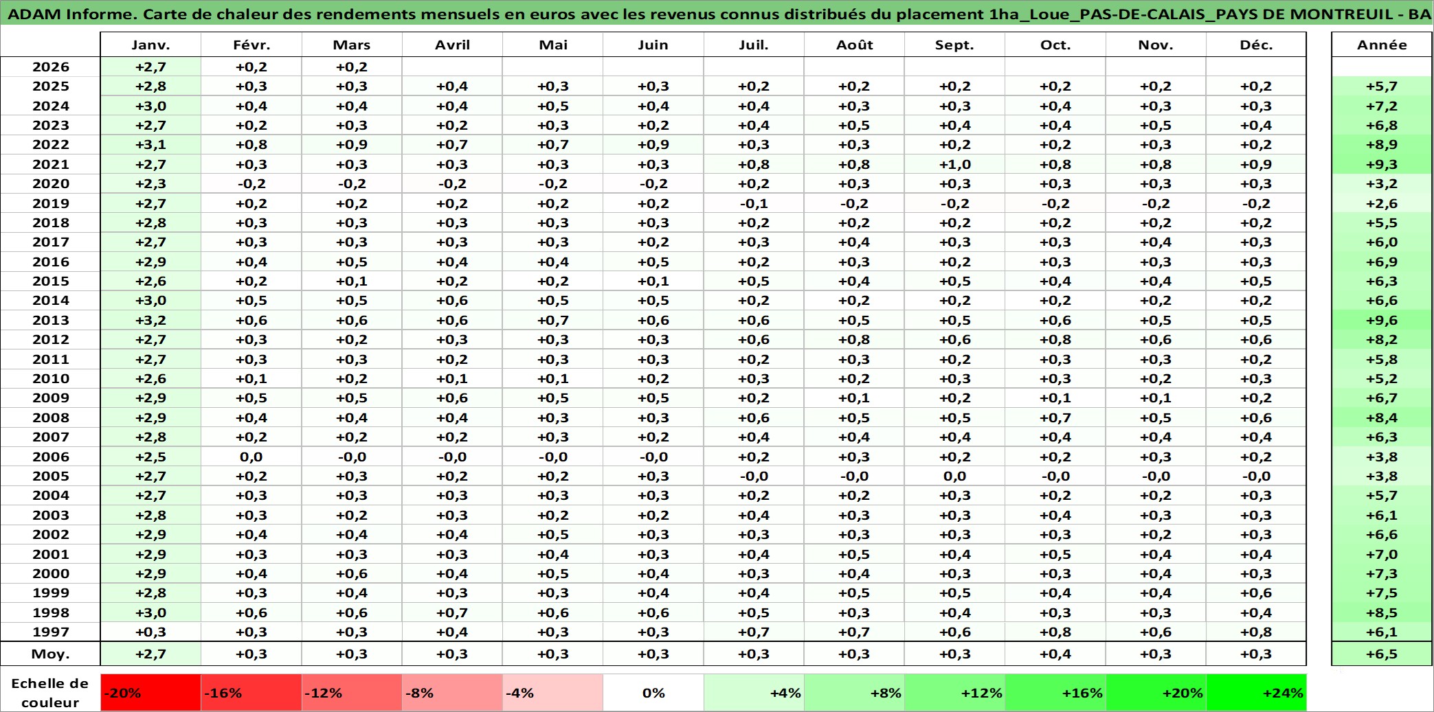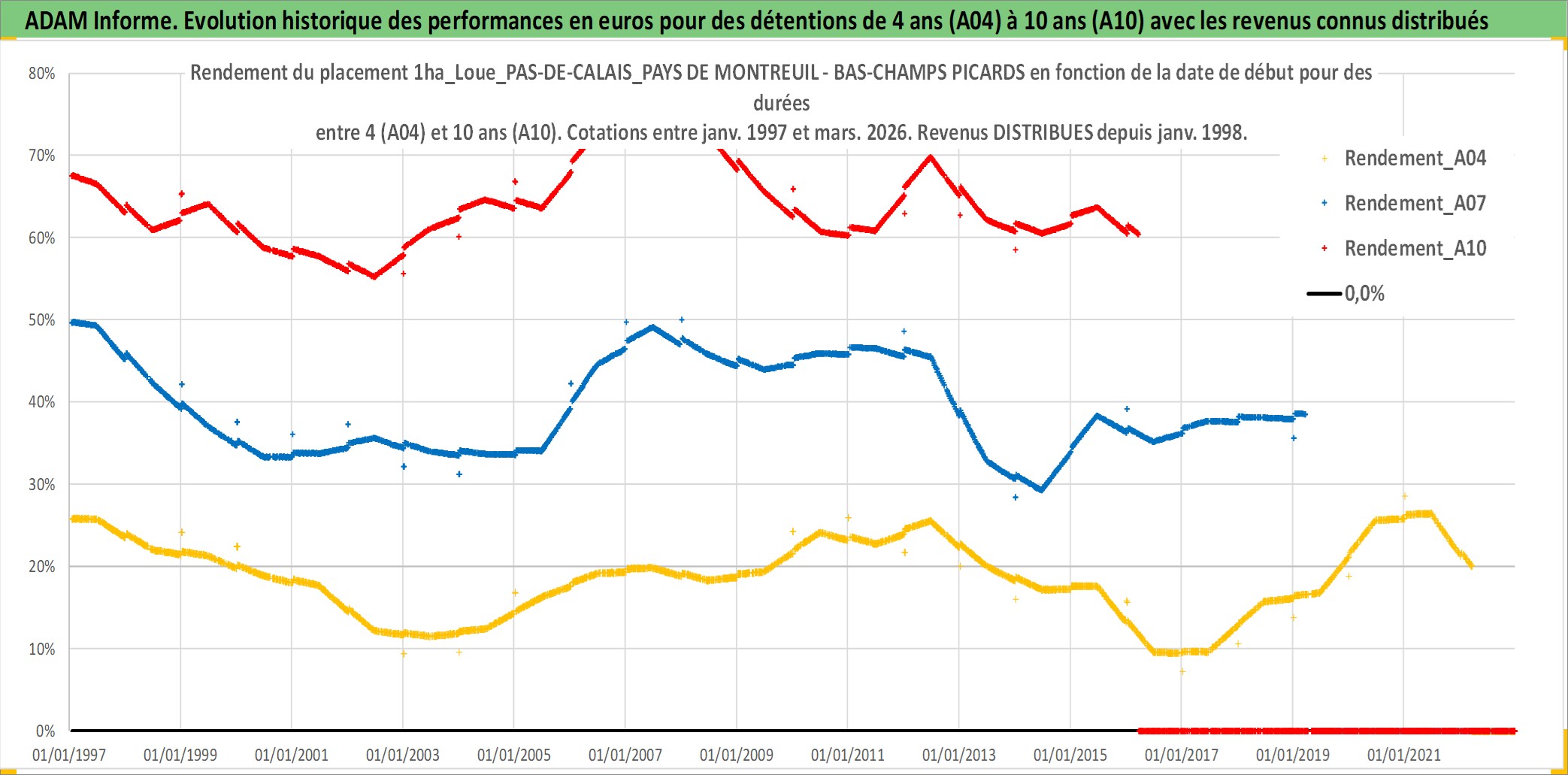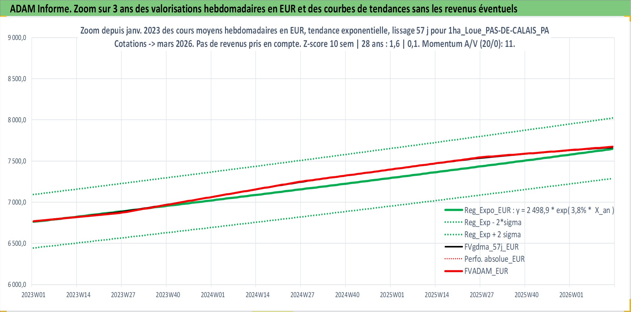 Site dédié aux investisseursPage dédiée sur site financeAnalyse des valorisations hebdomadaires de l'actif 1ha_Loue_PAS-DE-CALAIS_PAYS DE MONTREUIL - BAS-CHAMPS PICARDS. Cet actif est cote en EUR. Les valorisations couvrent les semaines 1997W01 a 2026W13. Les fermages de ce bien foncier sont pris egaux a 2,5% annuels de la valeur venale du bien.