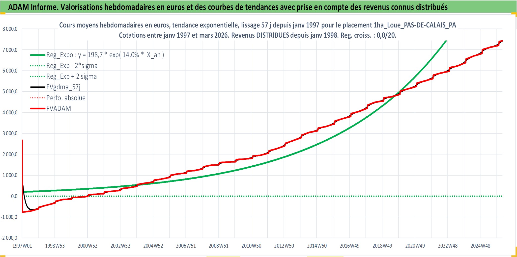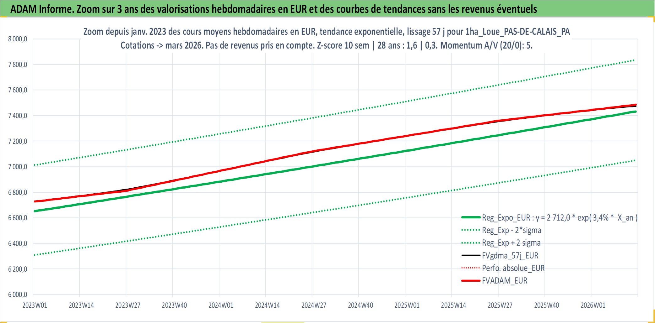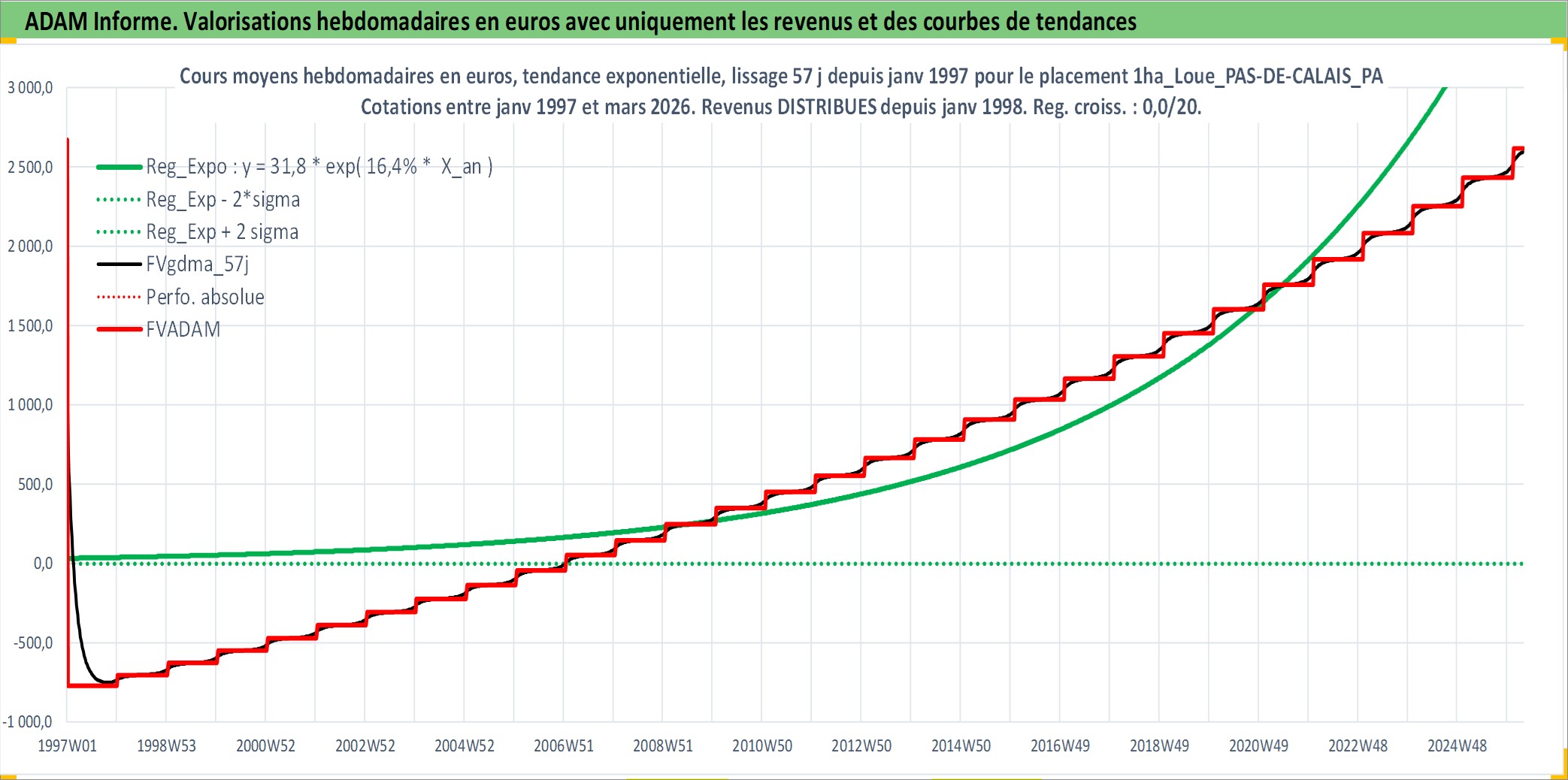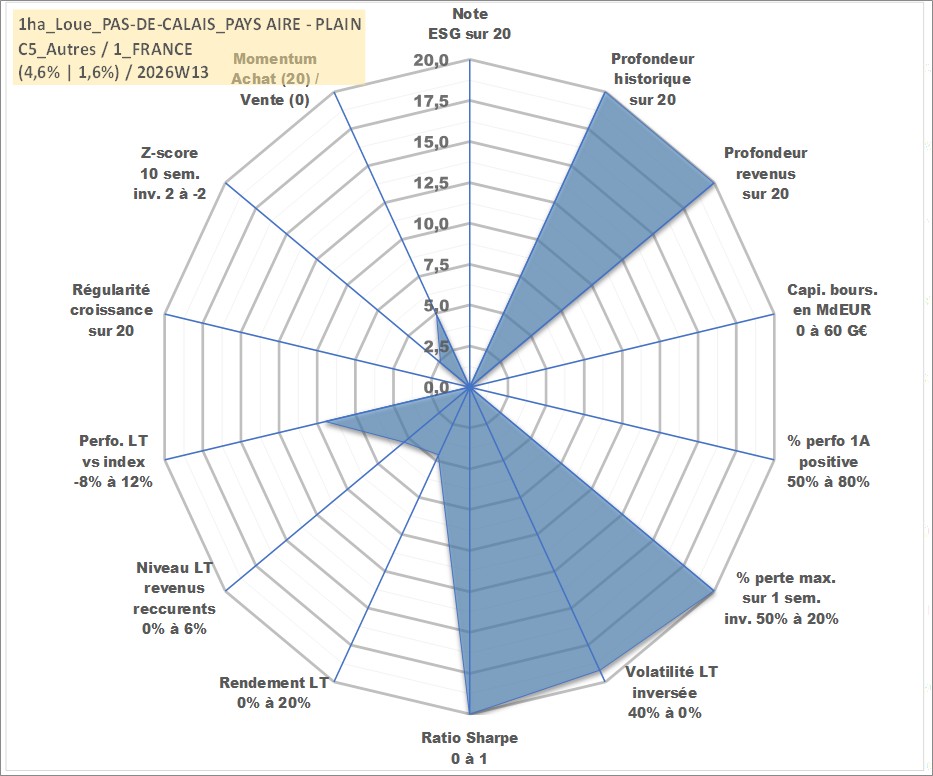 Site dédié aux investisseursPage dédiée sur site financeAnalyse des valorisations hebdomadaires de l'actif 1ha_Loue_PAS-DE-CALAIS_PAYS AIRE - PLAINE DE LA LYS - BETHUNOIS. Cet actif est cote en EUR. Les valorisations couvrent les semaines 1997W01 a 2026W13. Les fermages de ce bien foncier sont pris egaux a 2,5% annuels de la valeur venale du bien.