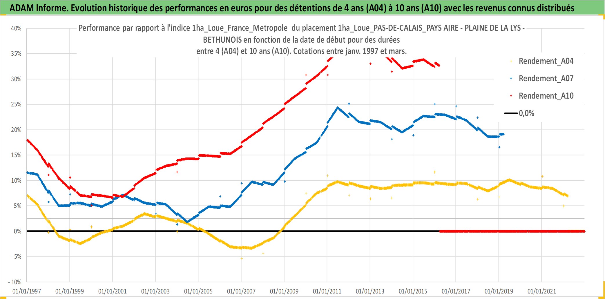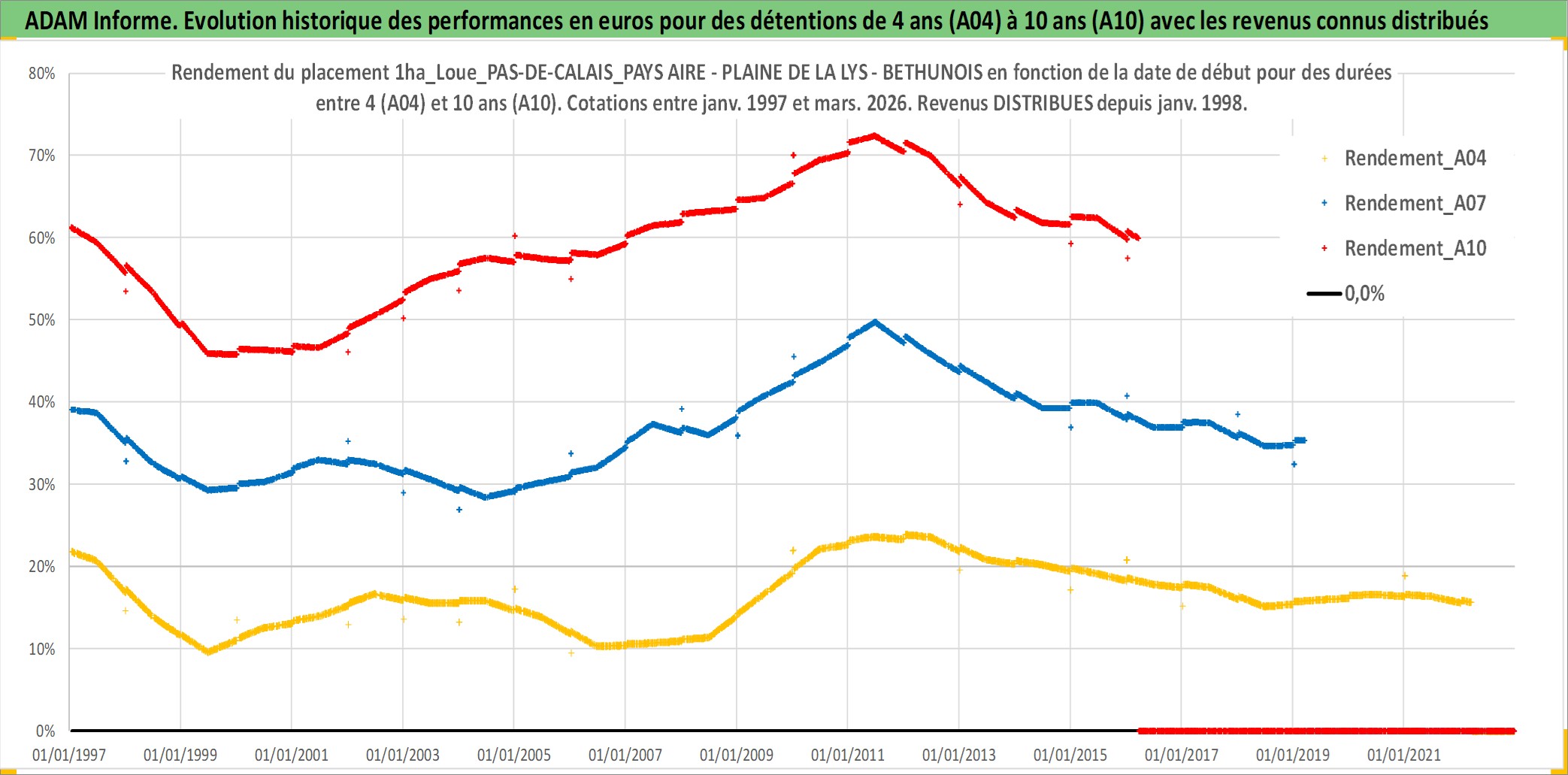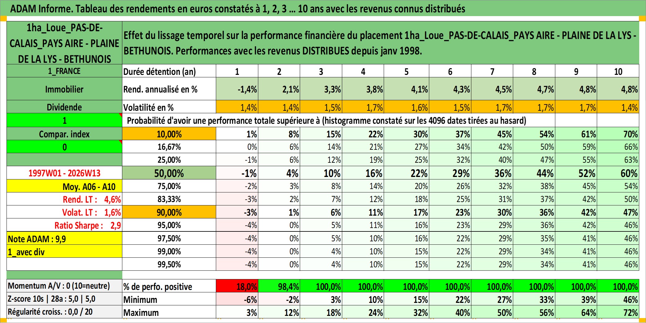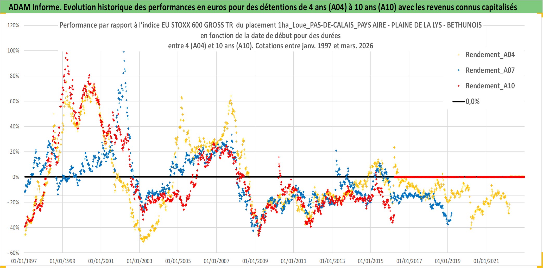 Site dédié aux investisseursPage dédiée sur site financeAnalyse des valorisations hebdomadaires de l'actif 1ha_Loue_PAS-DE-CALAIS_PAYS AIRE - PLAINE DE LA LYS - BETHUNOIS. Cet actif est cote en EUR. Les valorisations couvrent les semaines 1997W01 a 2026W13. Les fermages de ce bien foncier sont pris egaux a 2,5% annuels de la valeur venale du bien.