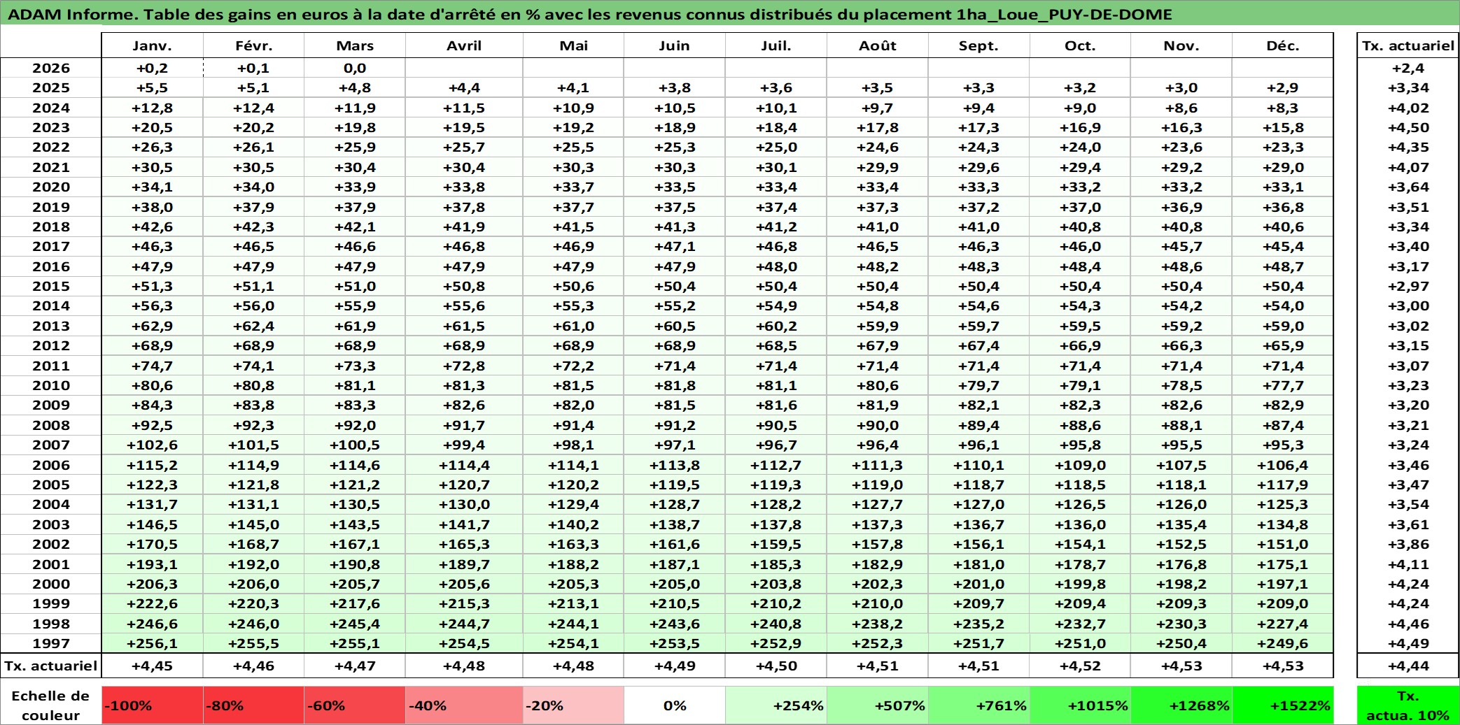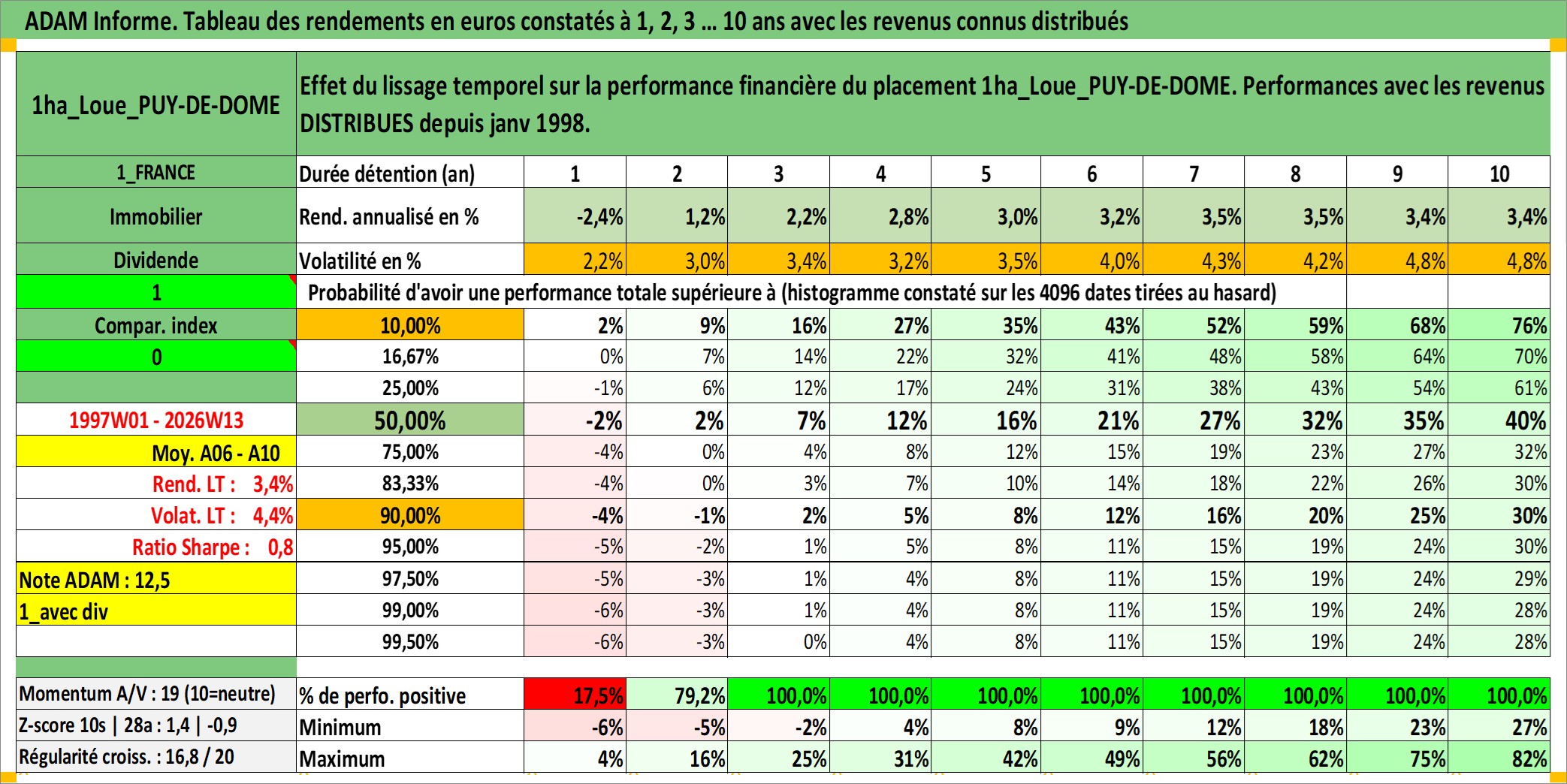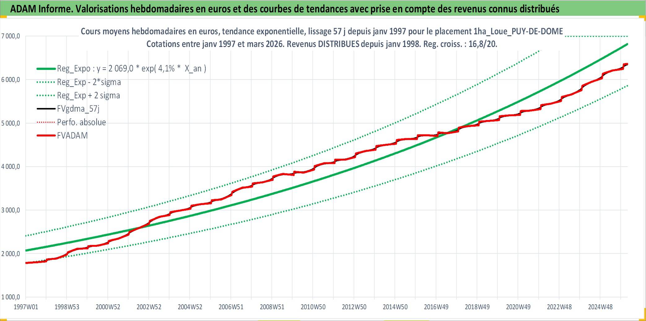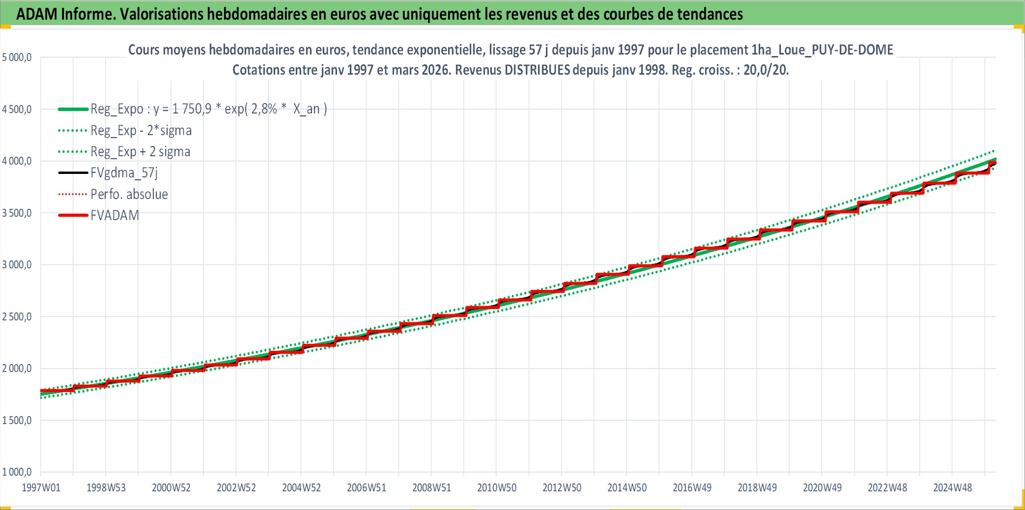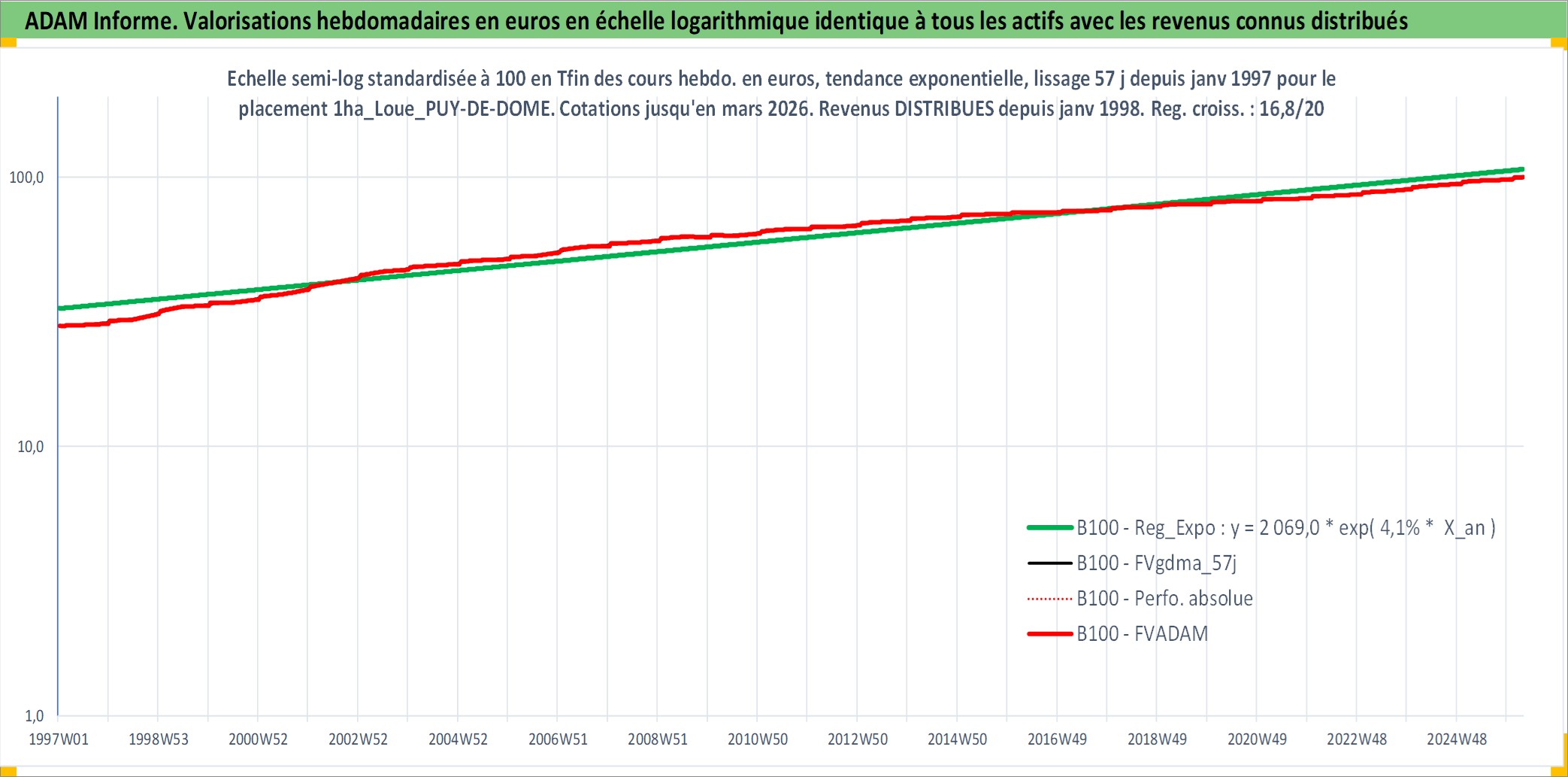 Site dédié aux investisseursPage dédiée sur site financeAnalyse des valorisations hebdomadaires de l'actif 1ha_Loue_PUY-DE-DOME. Cet actif est cote en EUR. Les valorisations couvrent les semaines 1997W01 a 2026W13. Les fermages de ce bien foncier sont pris egaux a 2,5% annuels de la valeur venale du bien.