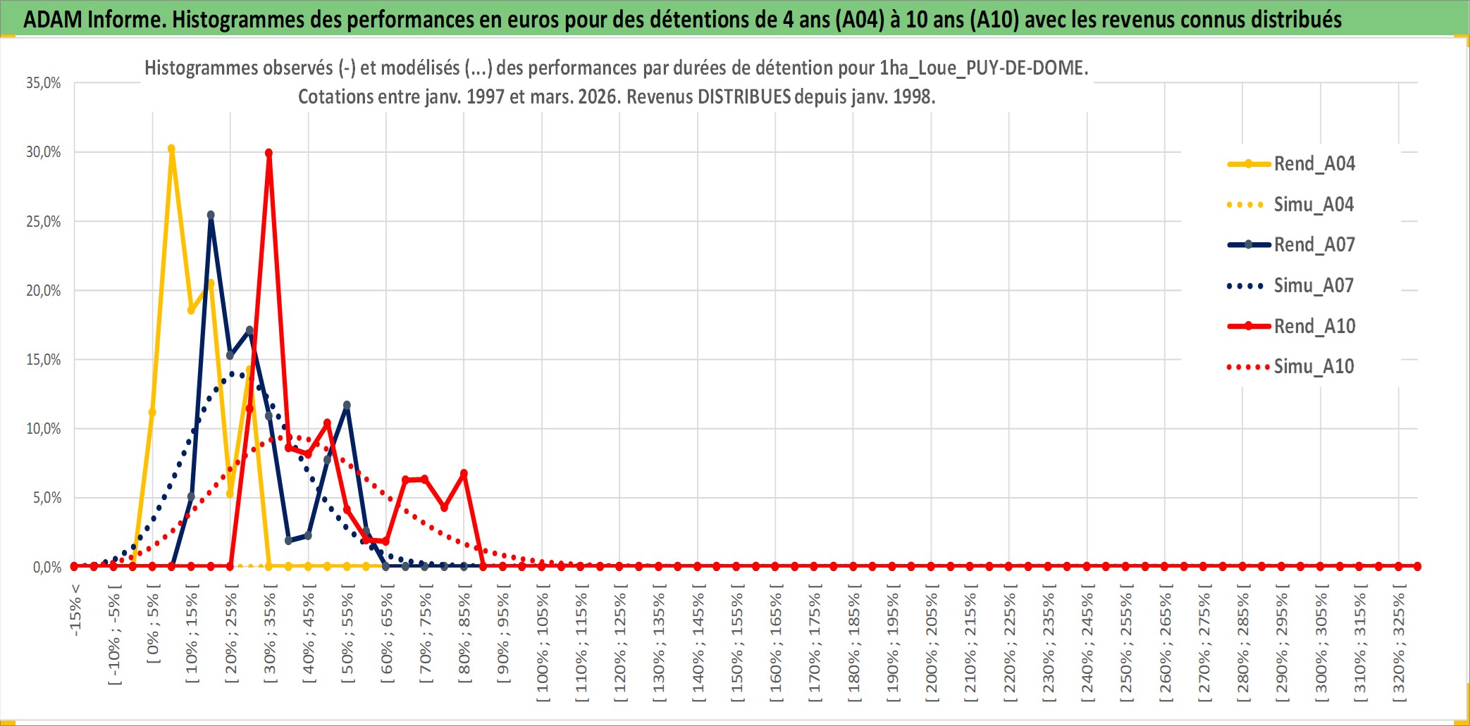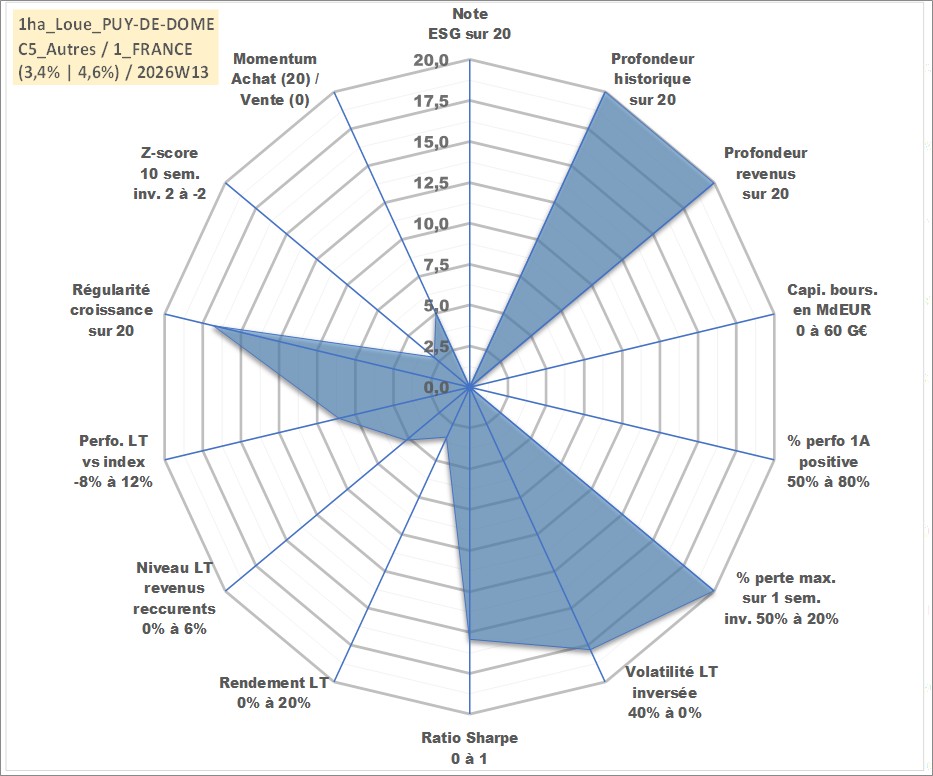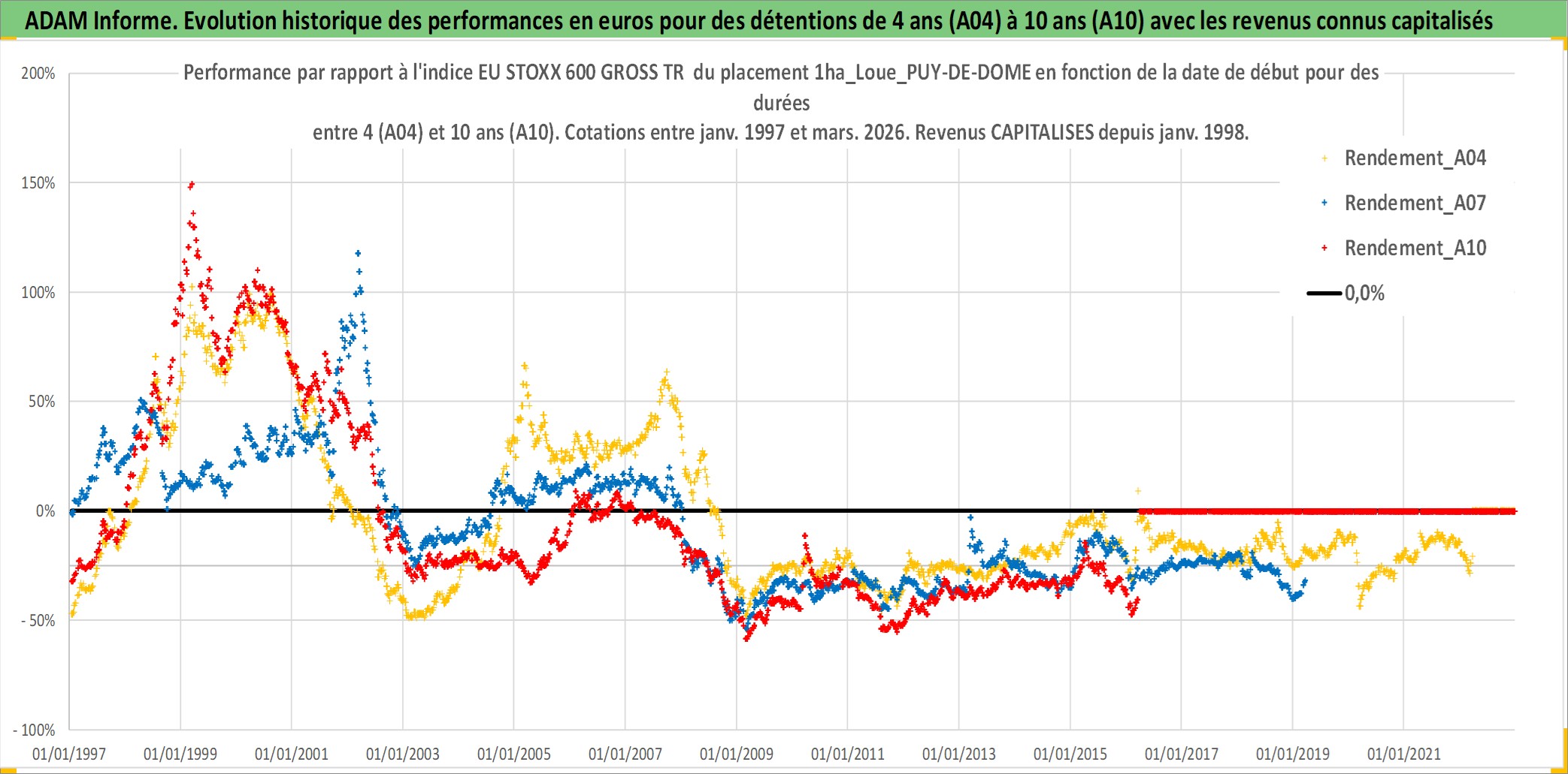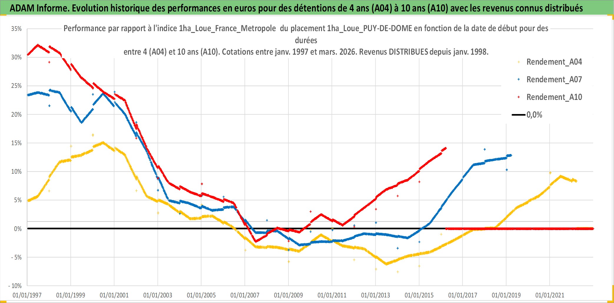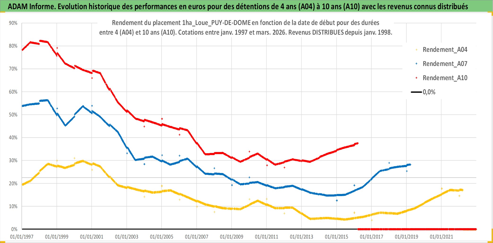 Site dédié aux investisseursPage dédiée sur site financeAnalyse des valorisations hebdomadaires de l'actif 1ha_Loue_PUY-DE-DOME. Cet actif est cote en EUR. Les valorisations couvrent les semaines 1997W01 a 2026W13. Les fermages de ce bien foncier sont pris egaux a 2,5% annuels de la valeur venale du bien.