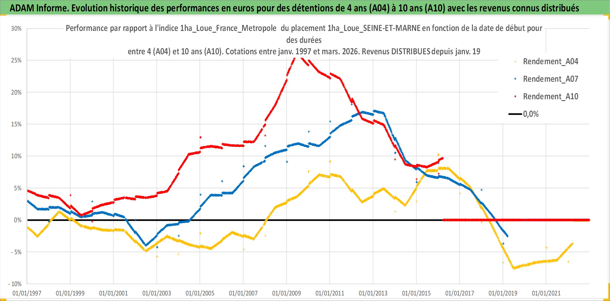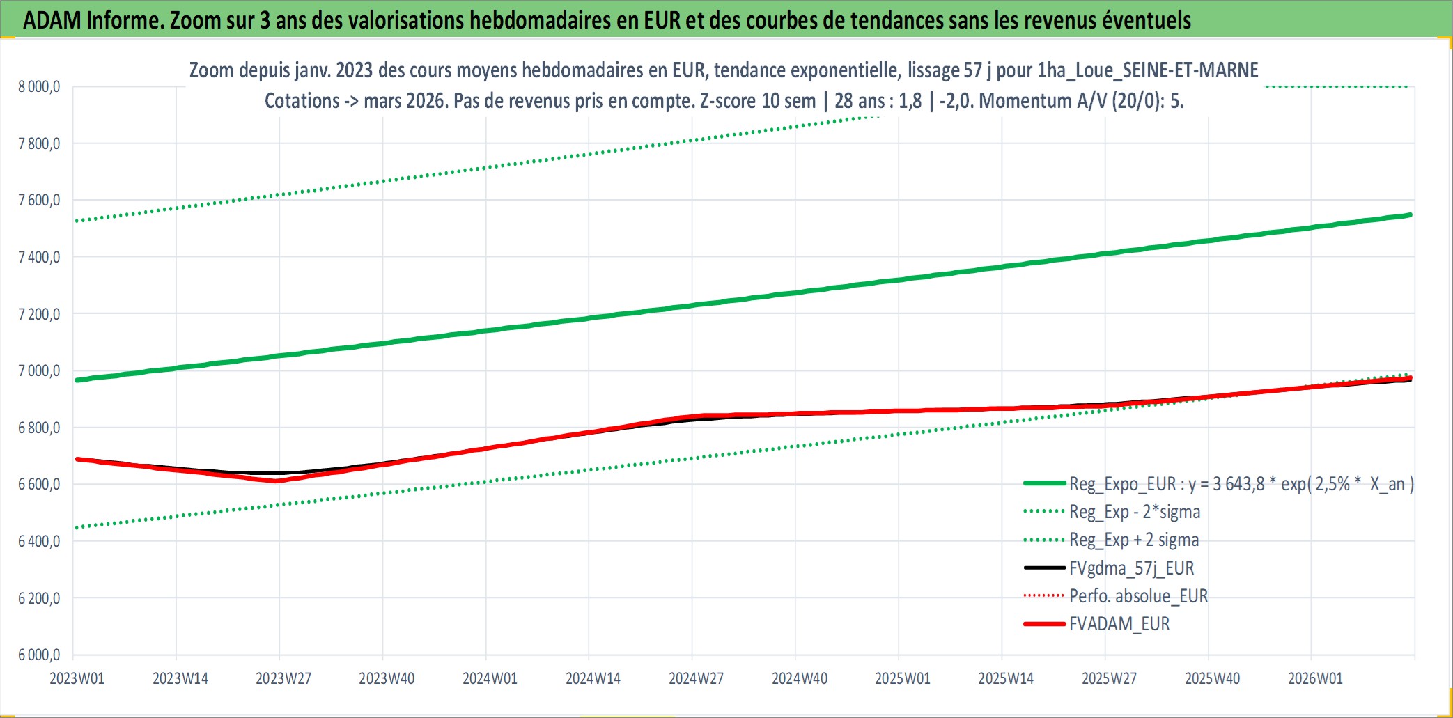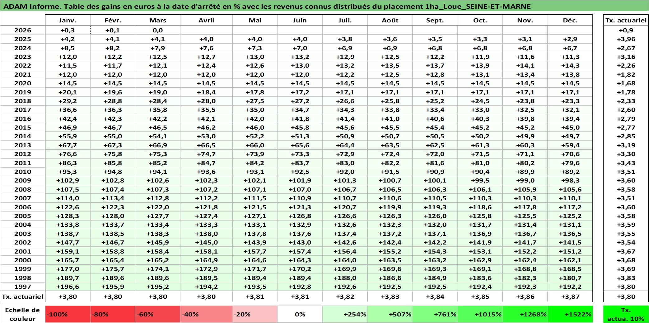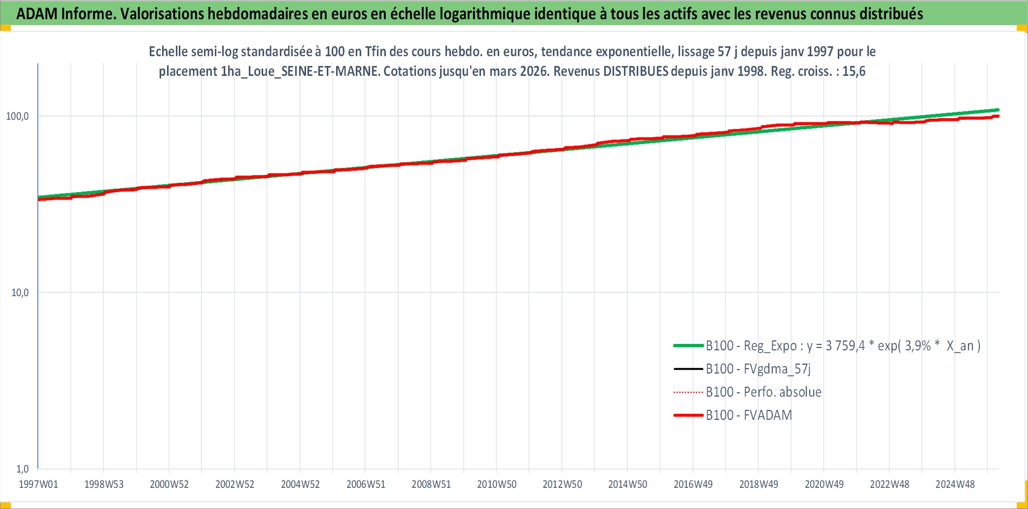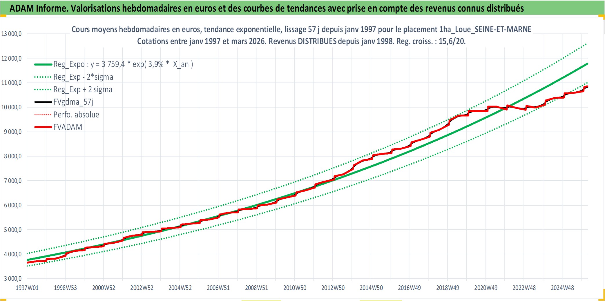 Site dédié aux investisseursPage dédiée sur site financeAnalyse des valorisations hebdomadaires de l'actif 1ha_Loue_SEINE-ET-MARNE. Cet actif est cote en EUR. Les valorisations couvrent les semaines 1997W01 a 2026W13. Les fermages de ce bien foncier sont pris egaux a 2,5% annuels de la valeur venale du bien.