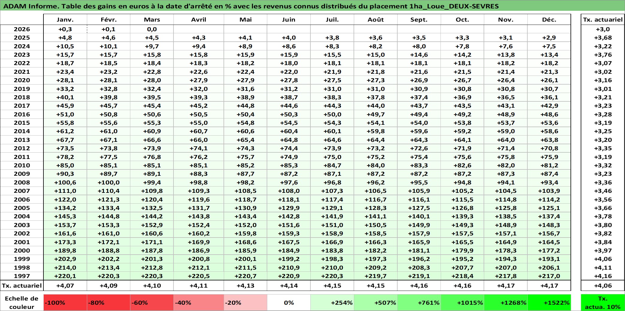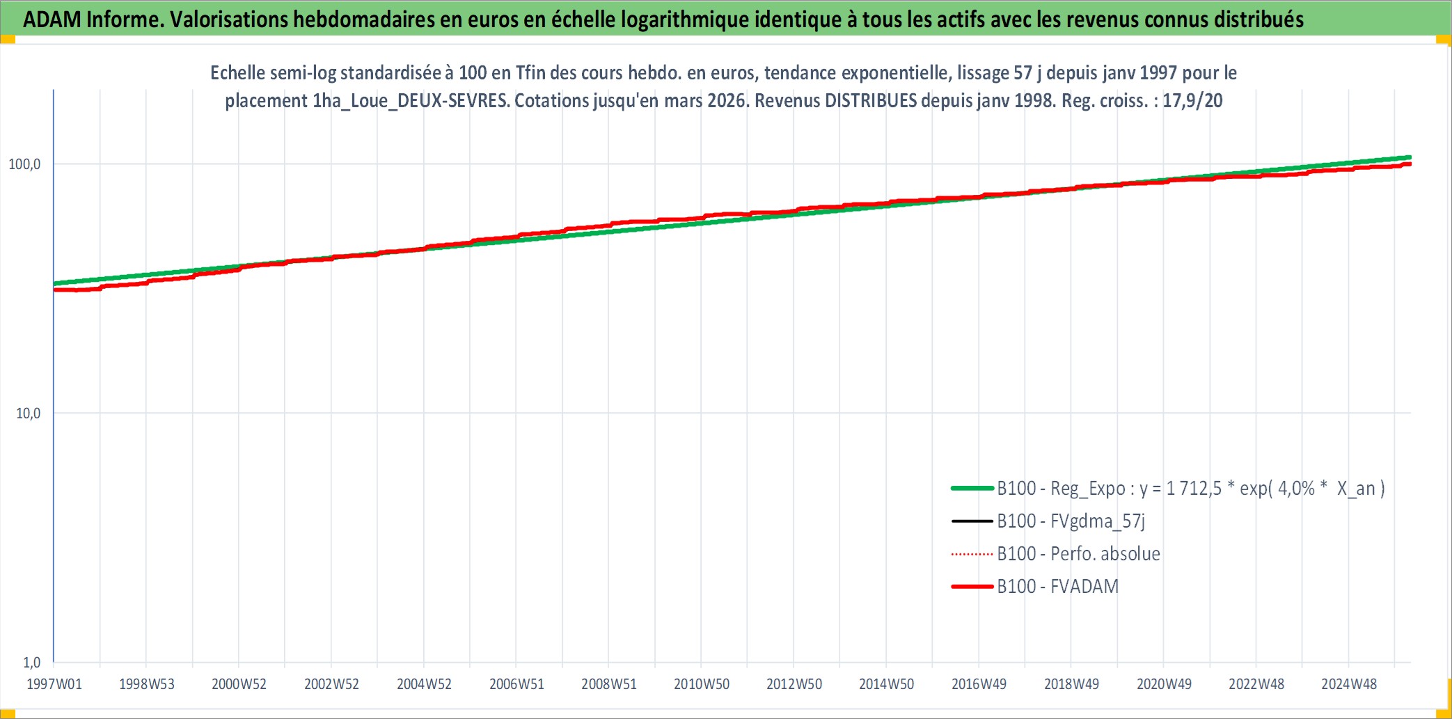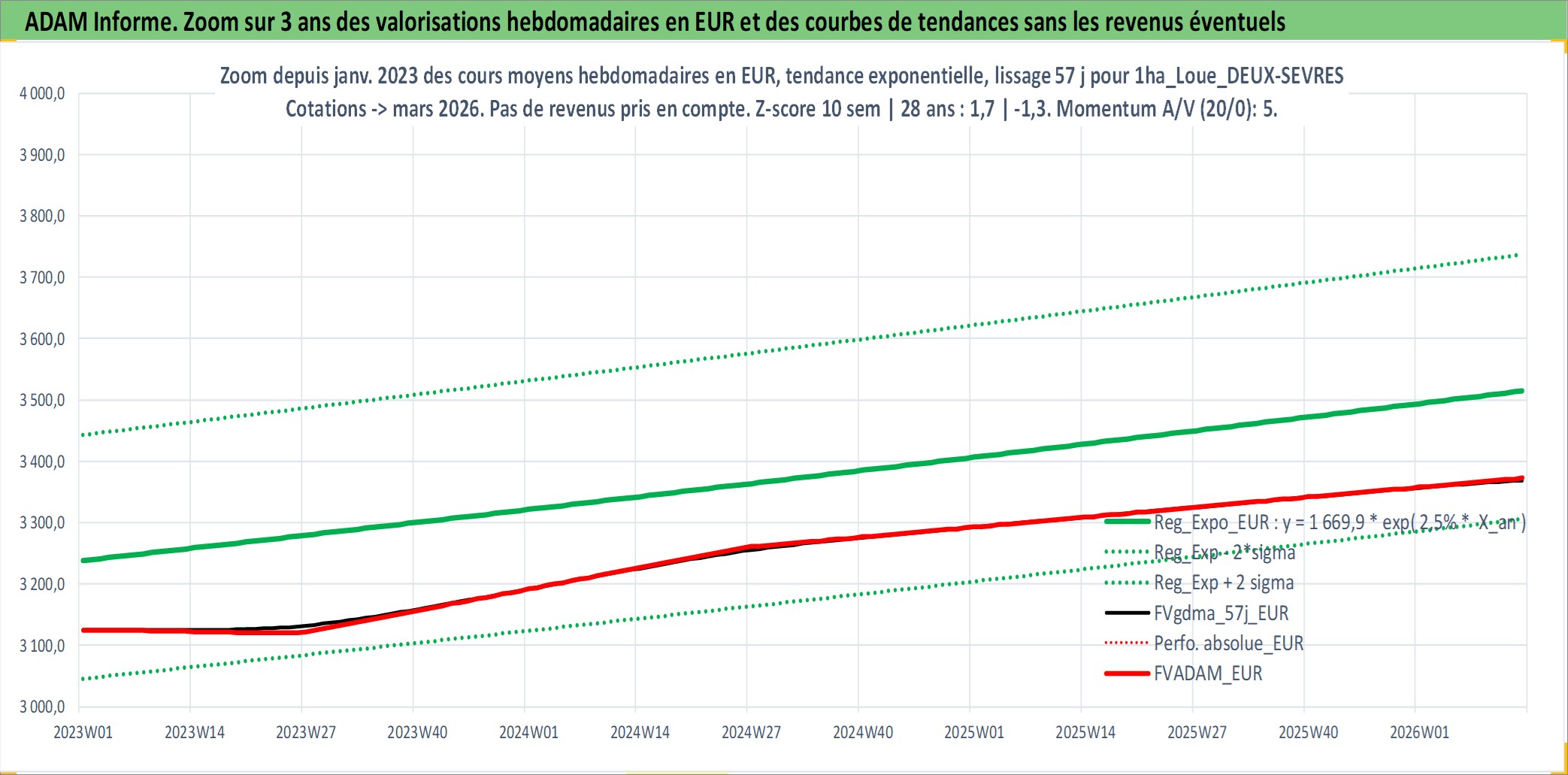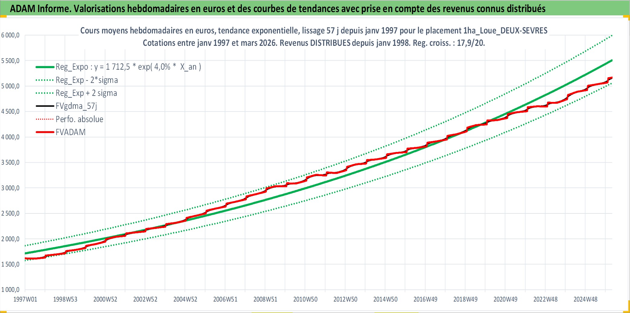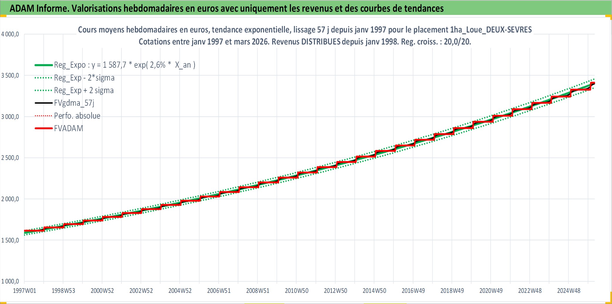 Site dédié aux investisseursPage dédiée sur site financeAnalyse des valorisations hebdomadaires de l'actif 1ha_Loue_DEUX-SEVRES. Cet actif est cote en EUR. Les valorisations couvrent les semaines 1997W01 a 2026W13. Les fermages de ce bien foncier sont pris egaux a 2,5% annuels de la valeur venale du bien.