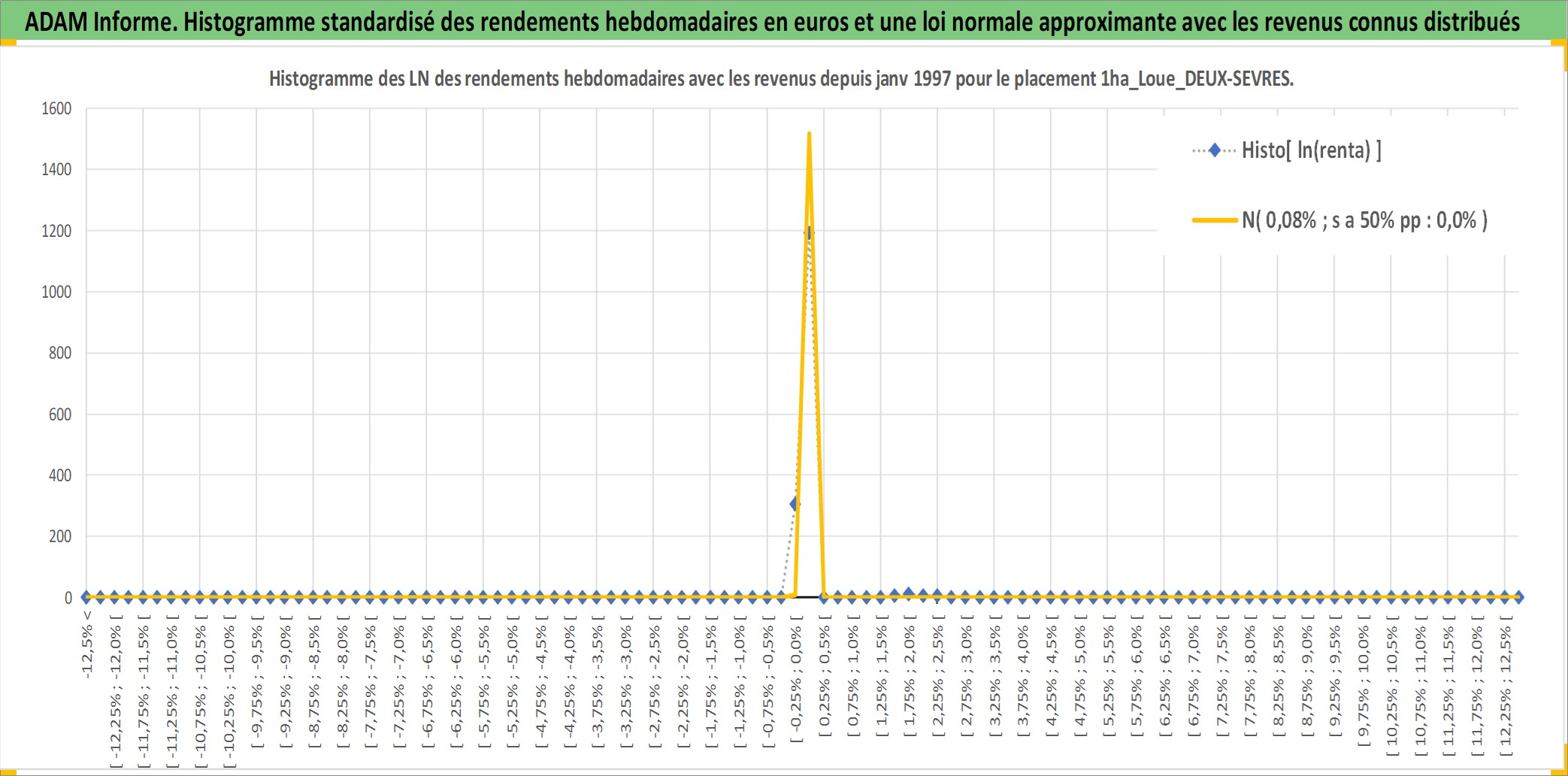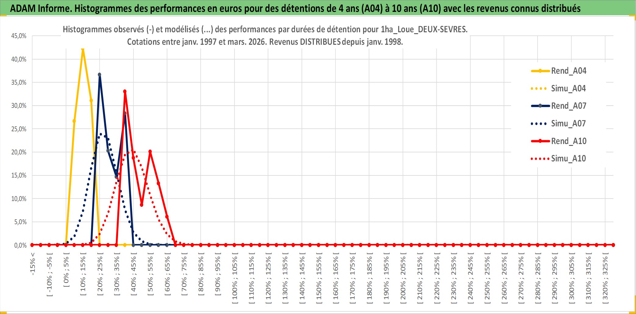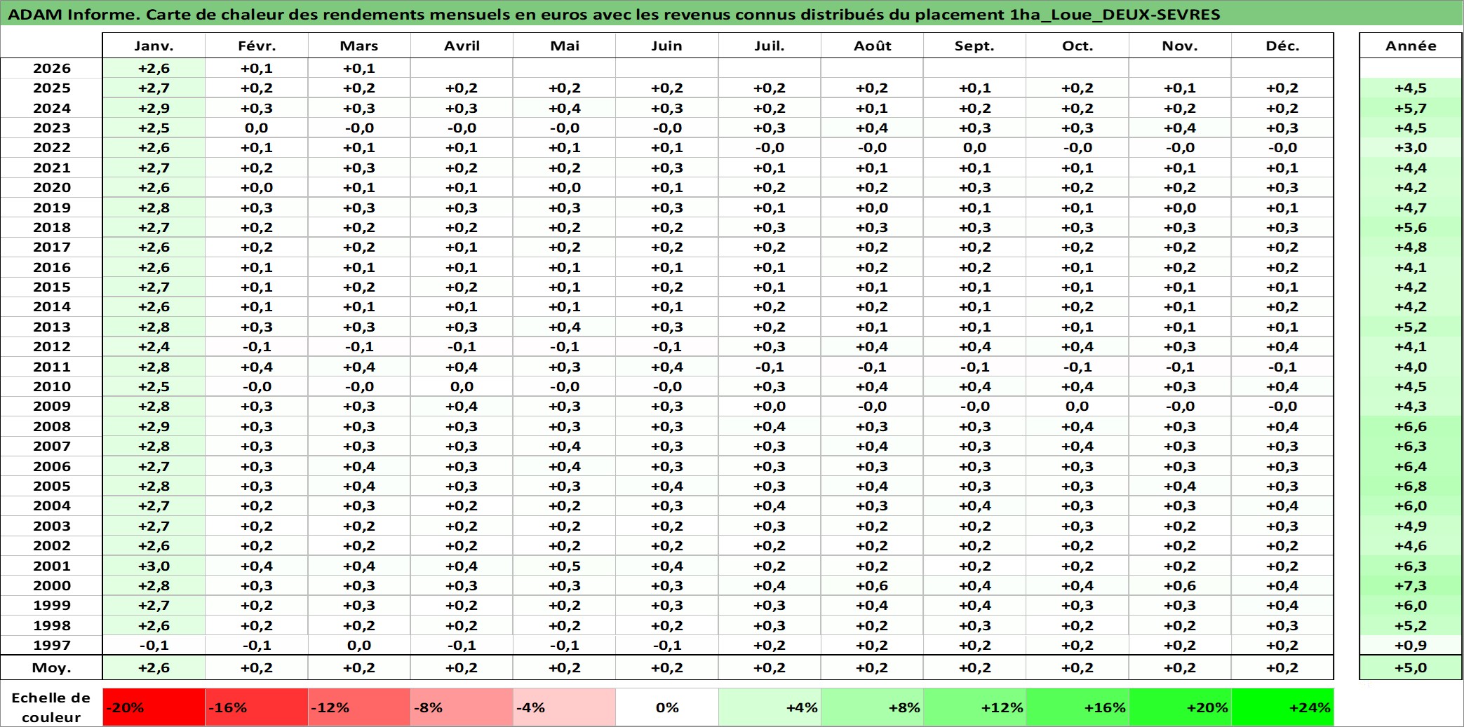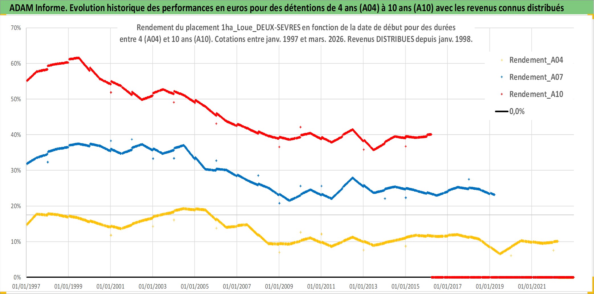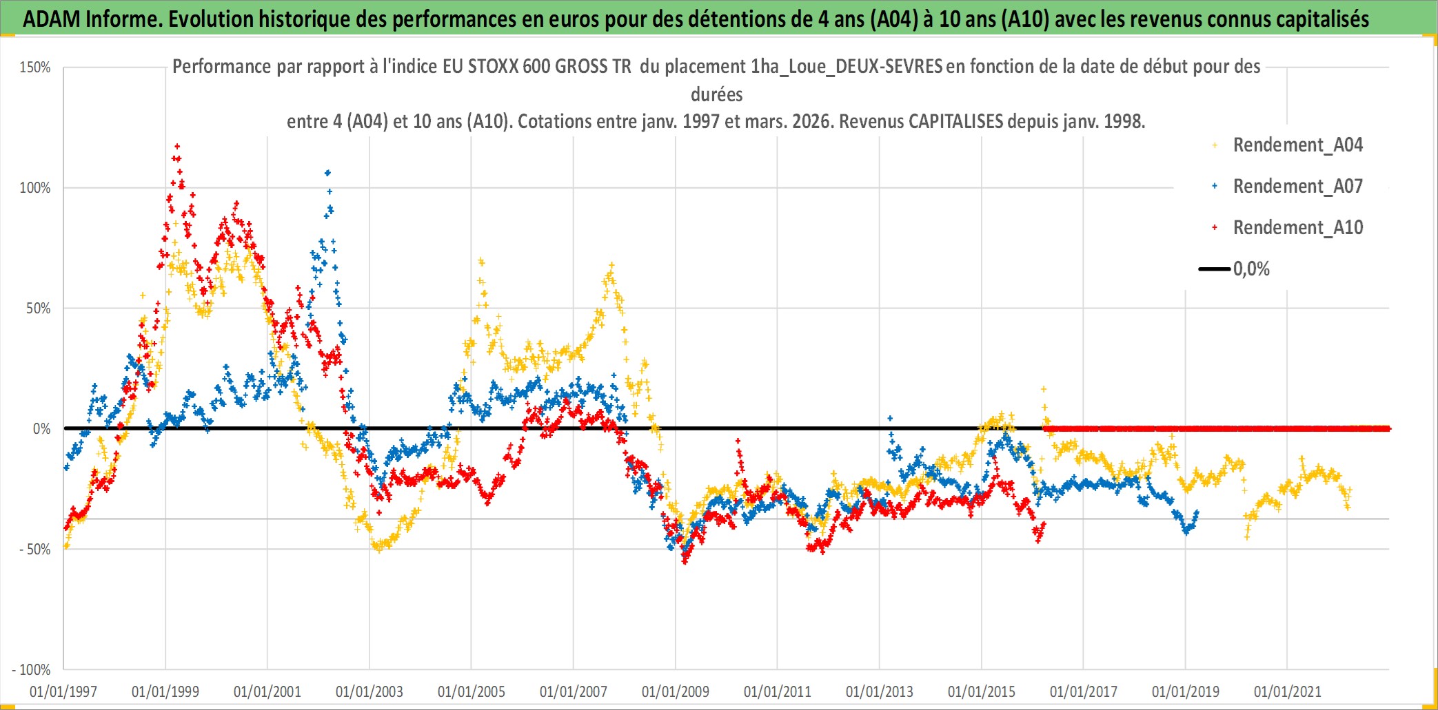 Site dédié aux investisseursPage dédiée sur site financeAnalyse des valorisations hebdomadaires de l'actif 1ha_Loue_DEUX-SEVRES. Cet actif est cote en EUR. Les valorisations couvrent les semaines 1997W01 a 2026W13. Les fermages de ce bien foncier sont pris egaux a 2,5% annuels de la valeur venale du bien.