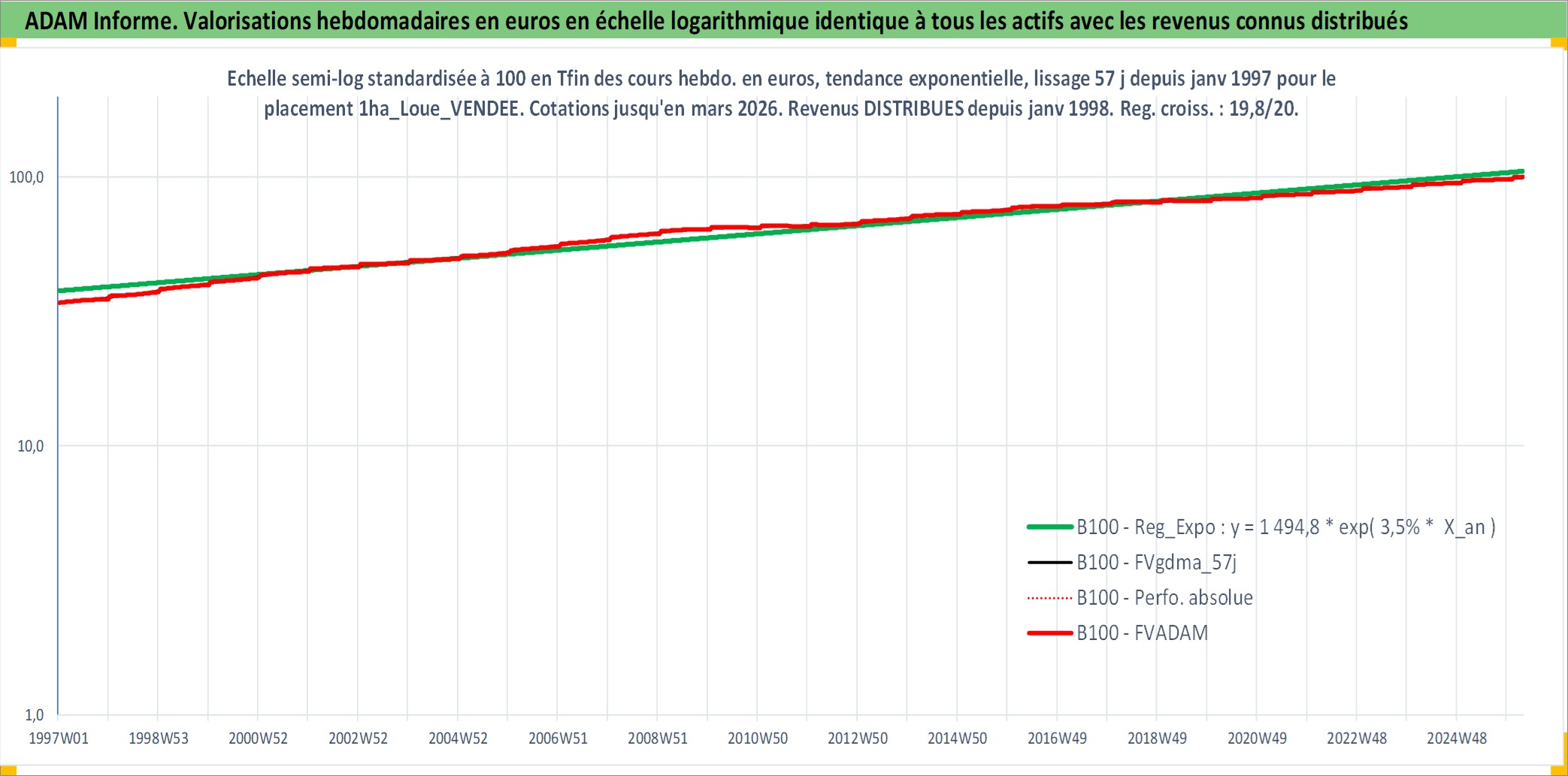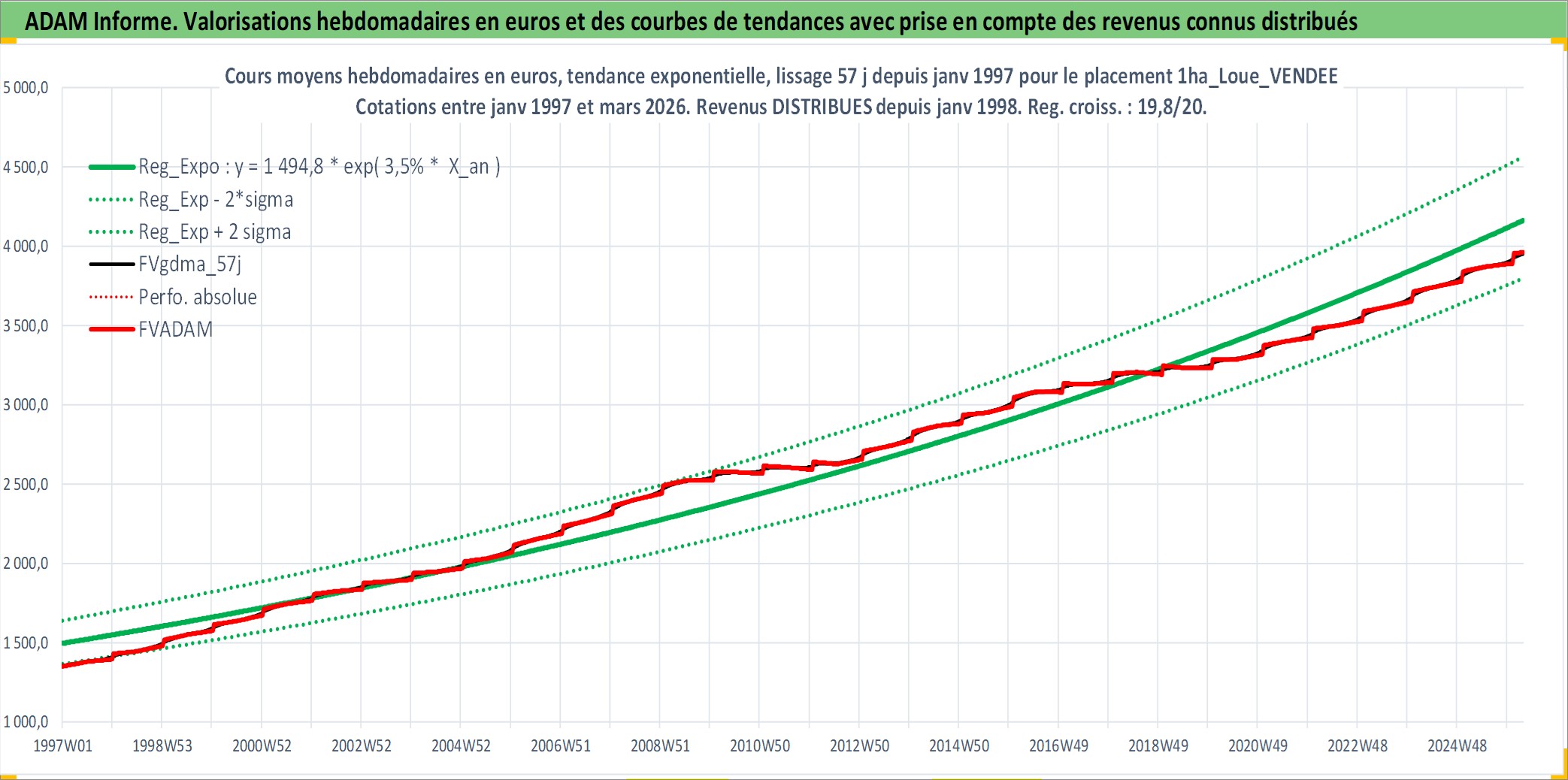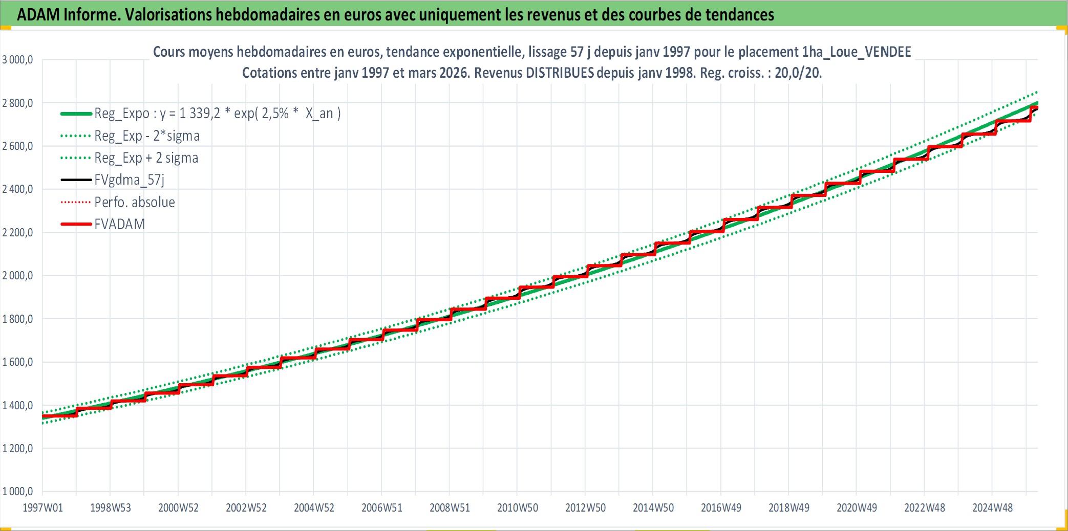 Site dédié aux investisseursPage dédiée sur site financeAnalyse des valorisations hebdomadaires de l'actif 1ha_Loue_VENDEE. Cet actif est cote en EUR. Les valorisations couvrent les semaines 1997W01 a 2026W13. Les fermages de ce bien foncier sont pris egaux a 2,5% annuels de la valeur venale du bien.