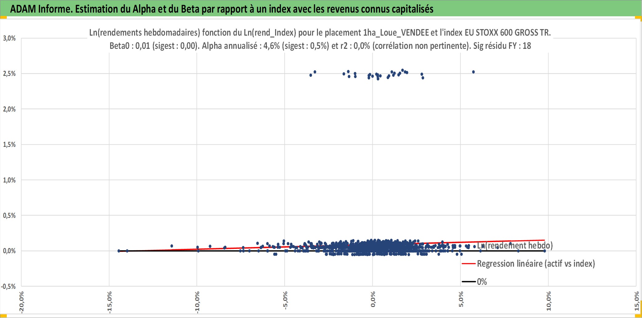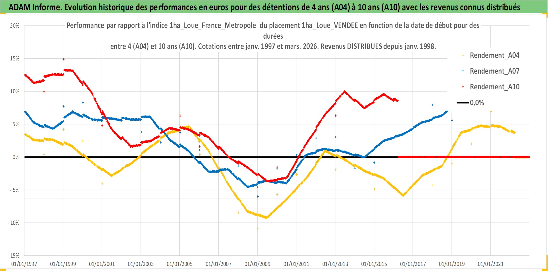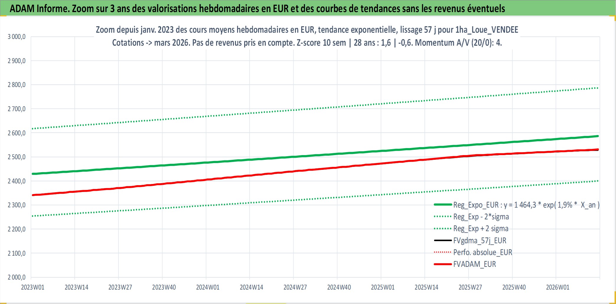 Site dédié aux investisseursPage dédiée sur site financeAnalyse des valorisations hebdomadaires de l'actif 1ha_Loue_VENDEE. Cet actif est cote en EUR. Les valorisations couvrent les semaines 1997W01 a 2026W13. Les fermages de ce bien foncier sont pris egaux a 2,5% annuels de la valeur venale du bien.