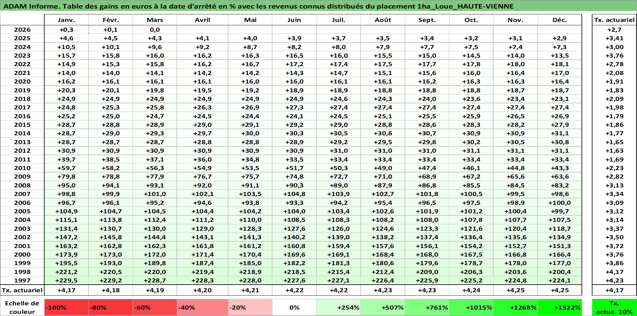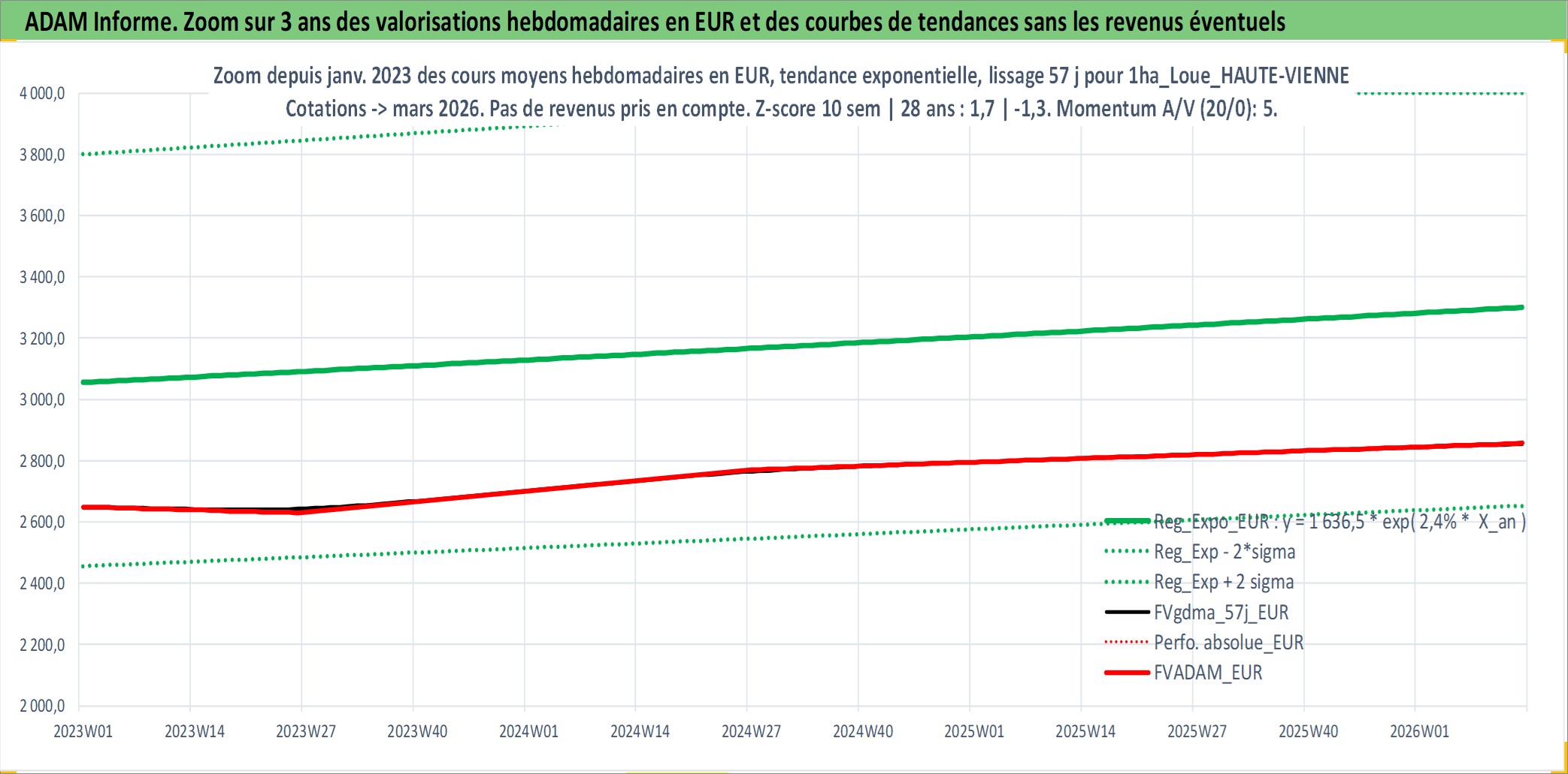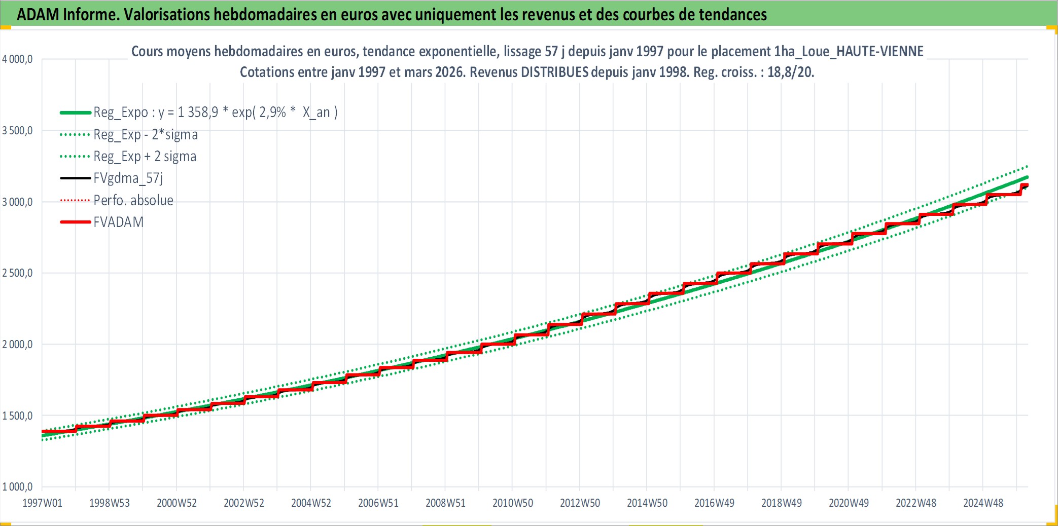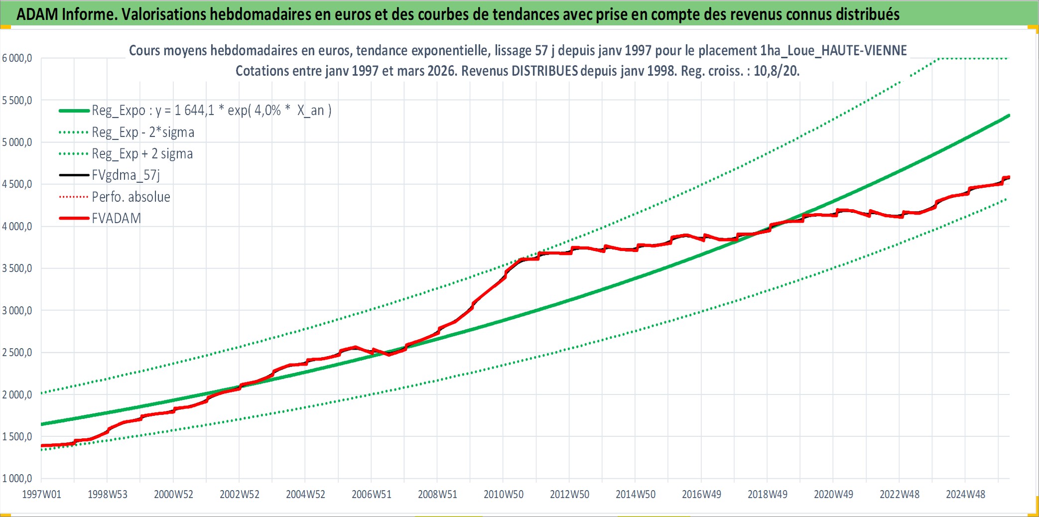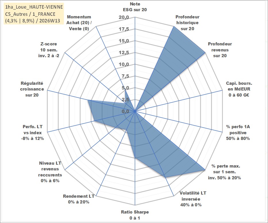 Site dédié aux investisseursPage dédiée sur site financeAnalyse des valorisations hebdomadaires de l'actif 1ha_Loue_HAUTE-VIENNE. Cet actif est cote en EUR. Les valorisations couvrent les semaines 1997W01 a 2026W13. Les fermages de ce bien foncier sont pris egaux a 2,5% annuels de la valeur venale du bien.