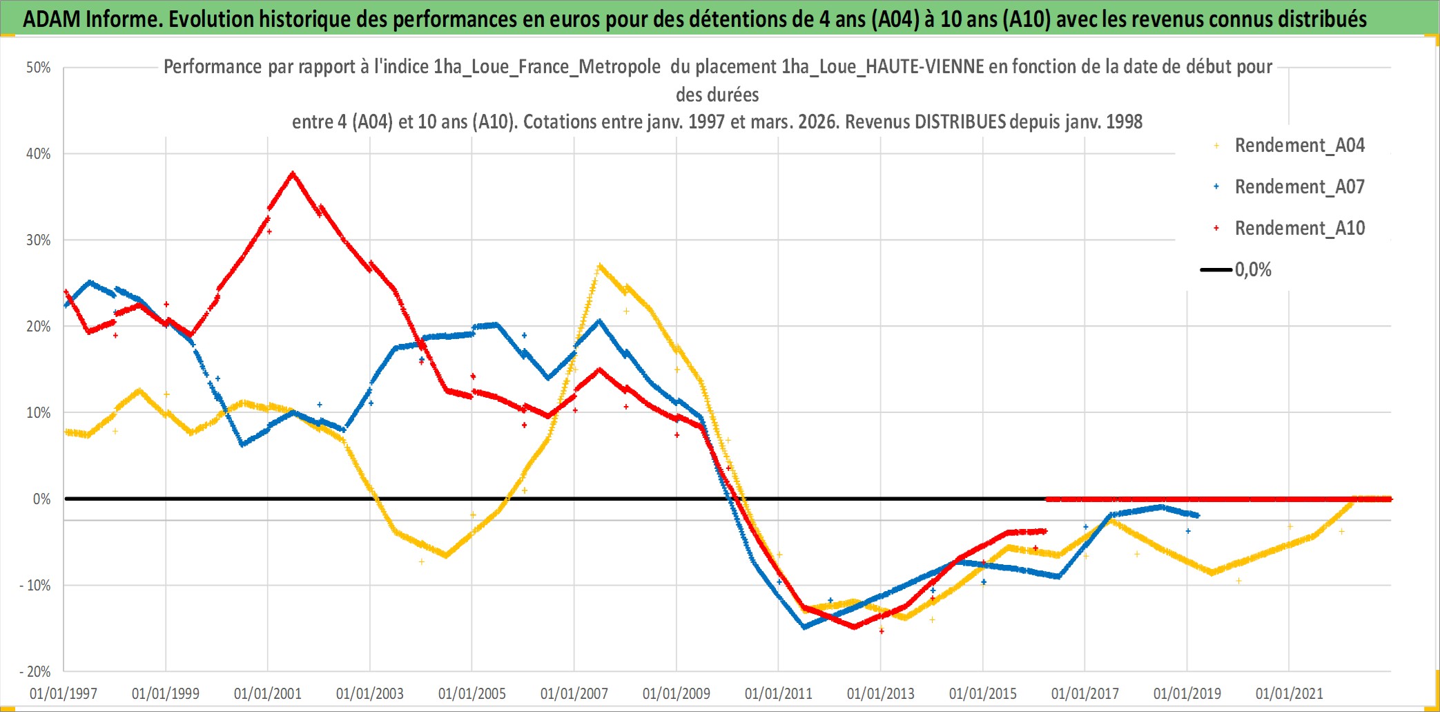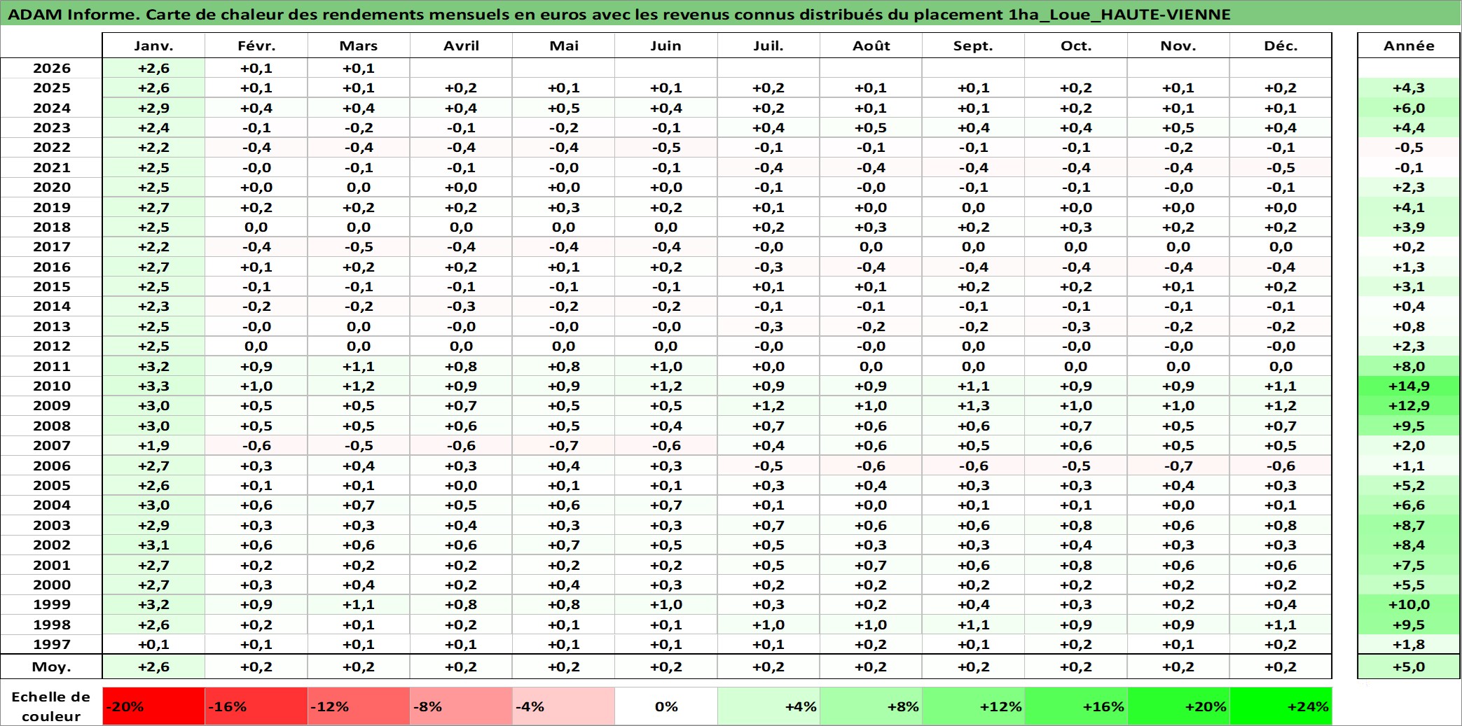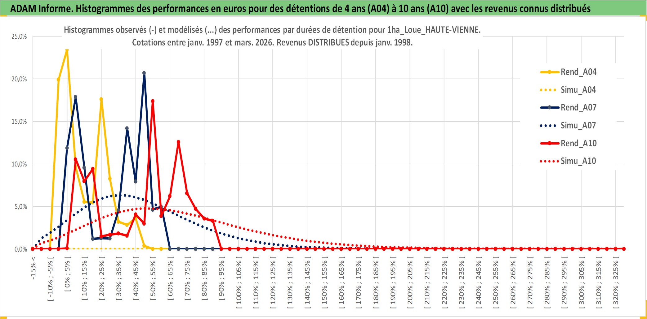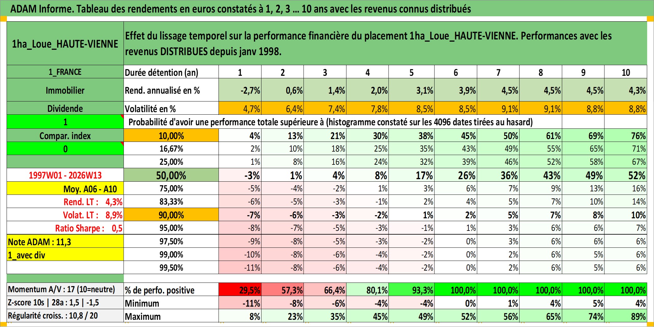 Site dédié aux investisseursPage dédiée sur site financeAnalyse des valorisations hebdomadaires de l'actif 1ha_Loue_HAUTE-VIENNE. Cet actif est cote en EUR. Les valorisations couvrent les semaines 1997W01 a 2026W13. Les fermages de ce bien foncier sont pris egaux a 2,5% annuels de la valeur venale du bien.