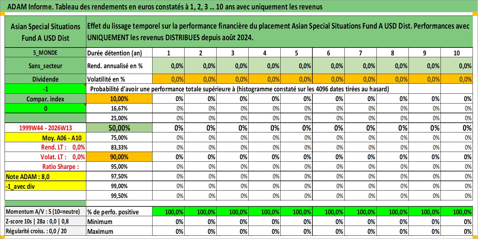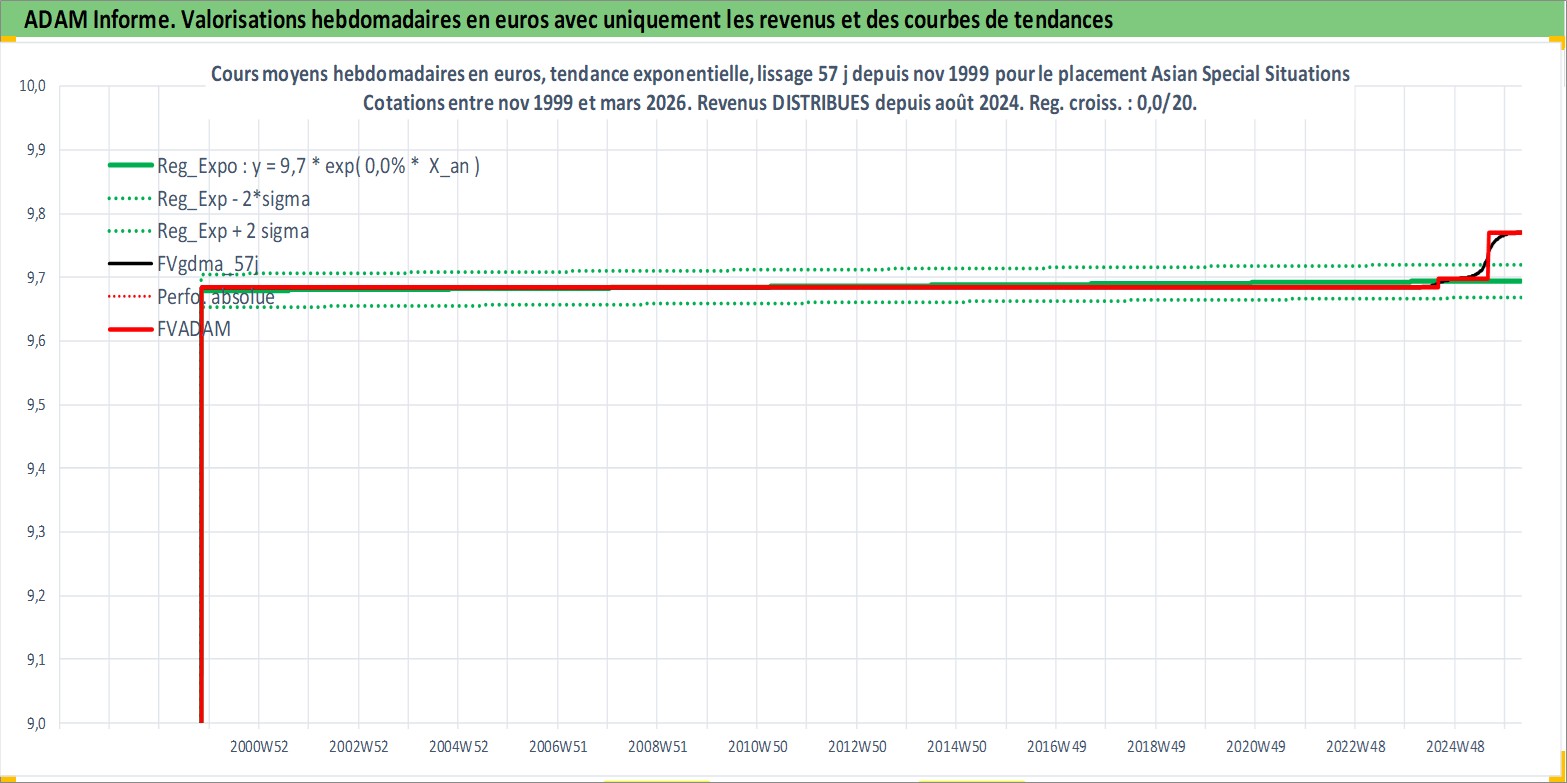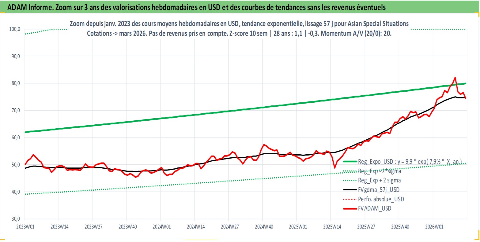 Site dédié aux investisseursPage dédiée sur site financeAnalyse des valorisations hebdomadaires du fonds Asian Special Situations Fund A USD Dist. Cet actif est cote en USD. Les valorisations sont en contrevaleur EURO et couvrent les semaines 1999W44 a 2026W13. Les revenus de cet actif financier sont pris en compte depuis la semaine 2024W31. La note globale ESG de cet actif est estimee a 3.0 (apres rebasage entre 0 et 20).