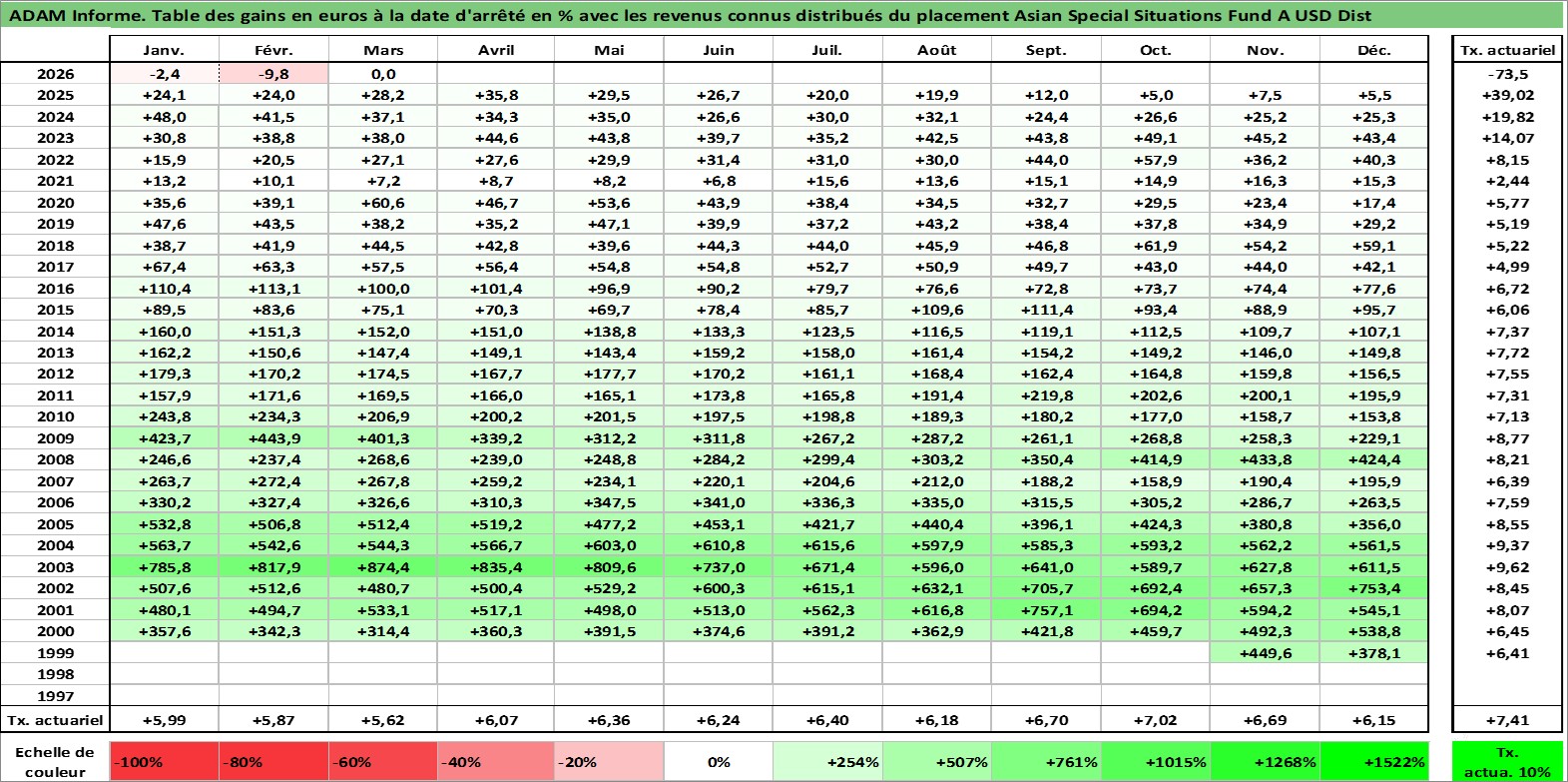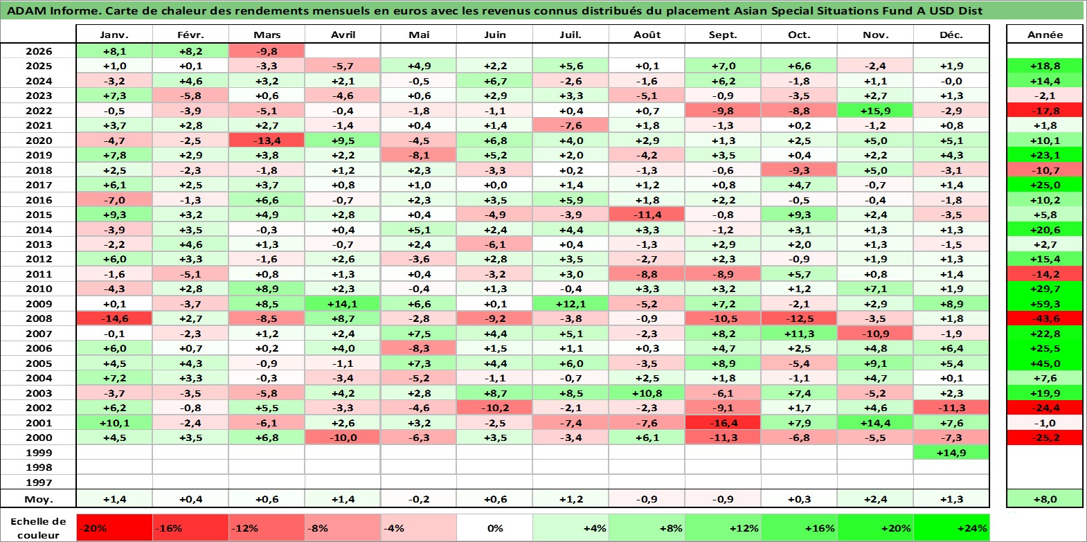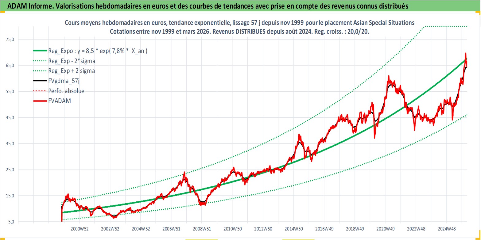 Site dédié aux investisseursPage dédiée sur site financeAnalyse des valorisations hebdomadaires du fonds Asian Special Situations Fund A USD Dist. Cet actif est cote en USD. Les valorisations sont en contrevaleur EURO et couvrent les semaines 1999W44 a 2026W13. Les revenus de cet actif financier sont pris en compte depuis la semaine 2024W31. La note globale ESG de cet actif est estimee a 3.0 (apres rebasage entre 0 et 20).