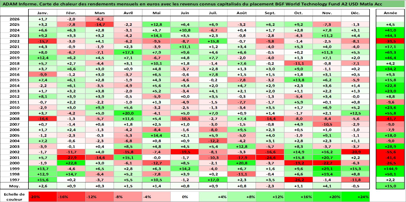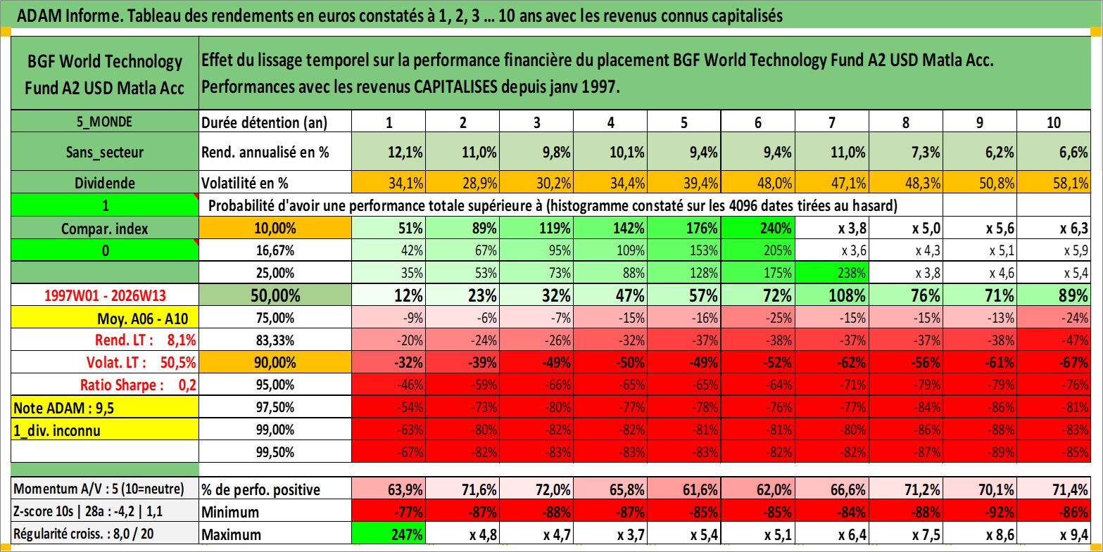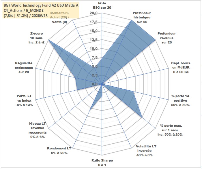 Site dédié aux investisseursPage dédiée sur site financeAnalyse des valorisations hebdomadaires du fonds BGF World Technology Fund A2 USD Matla Acc. Cet actif est cote en USD. Les valorisations sont en contrevaleur EURO et couvrent les semaines 1997W01 a 2026W13. Les revenus de cet actif financier sont pris en compte depuis la semaine 1997W01. La note globale ESG de cet actif est estimee a 7.2 (apres rebasage entre 0 et 20).