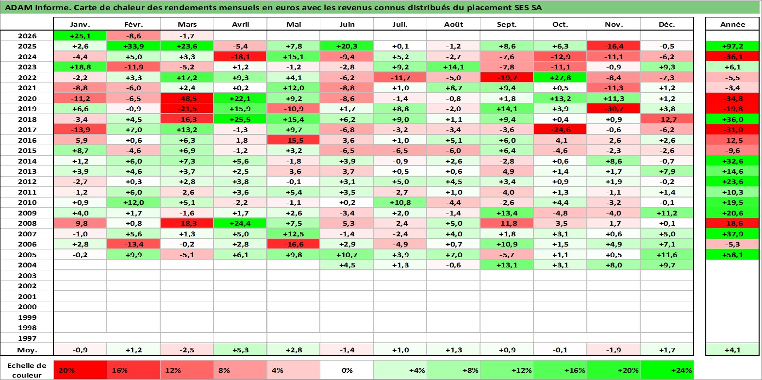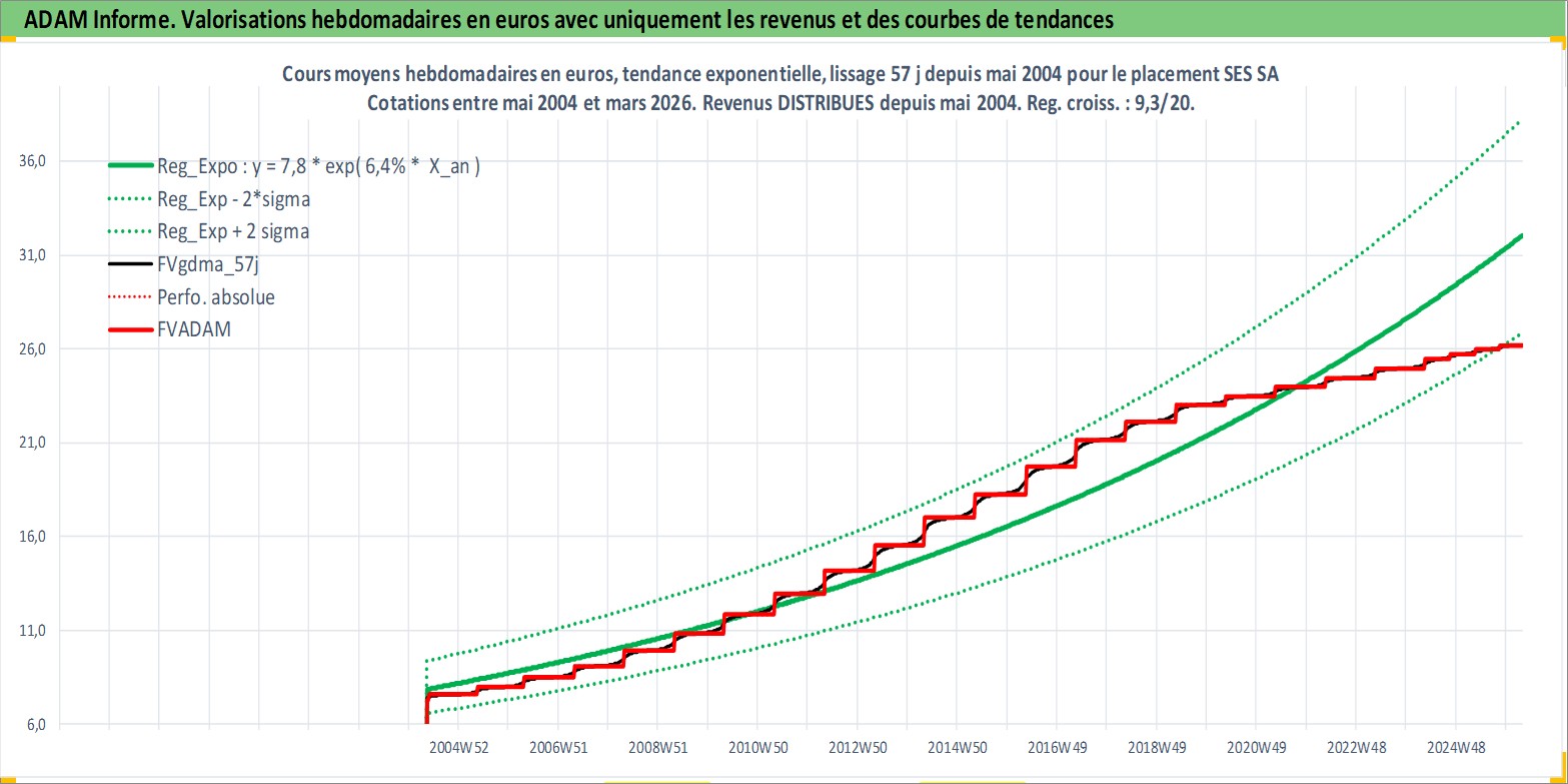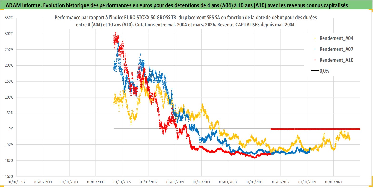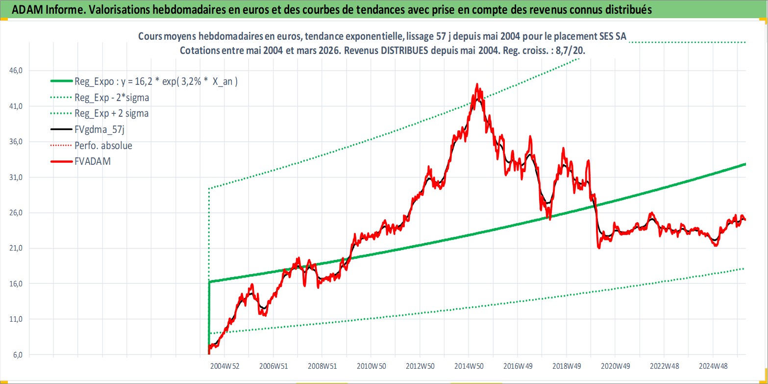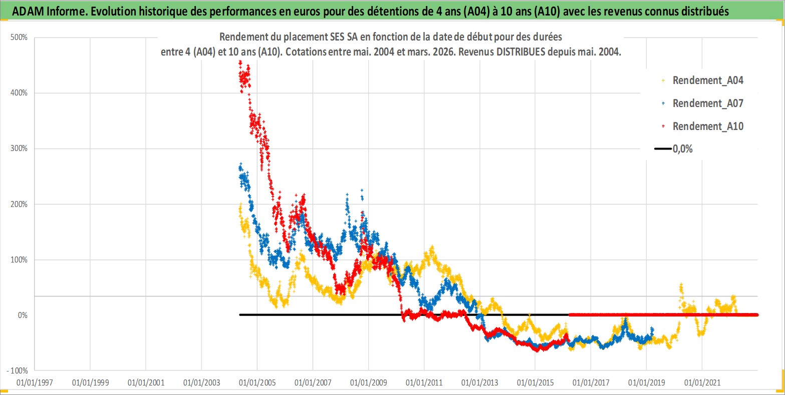 Site dédié aux investisseursPage dédiée sur site financeAnalyse des valorisations hebdomadaires de l'action SES SA. Cet actif est cote en EUR. Les valorisations couvrent les semaines 2004W19 a 2026W13. Les revenus de cet actif financier sont pris en compte depuis la semaine 2004W21. La note globale ESG de cet actif est estimee a 12.0 (apres rebasage entre 0 et 20).