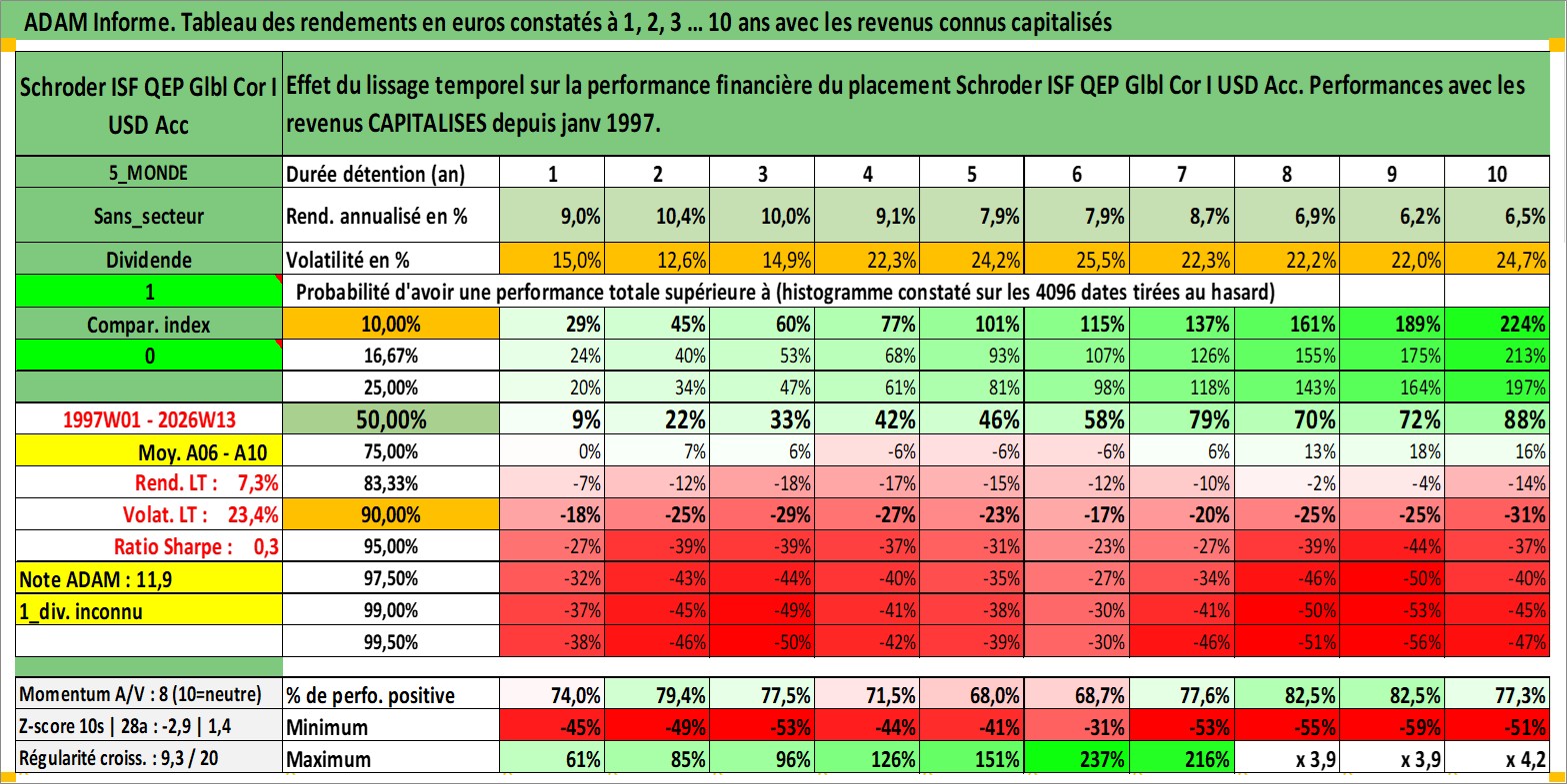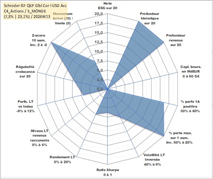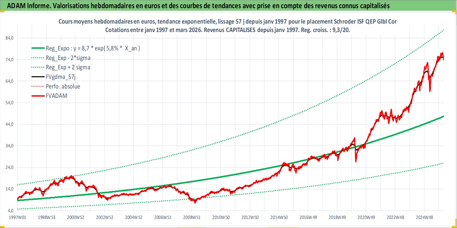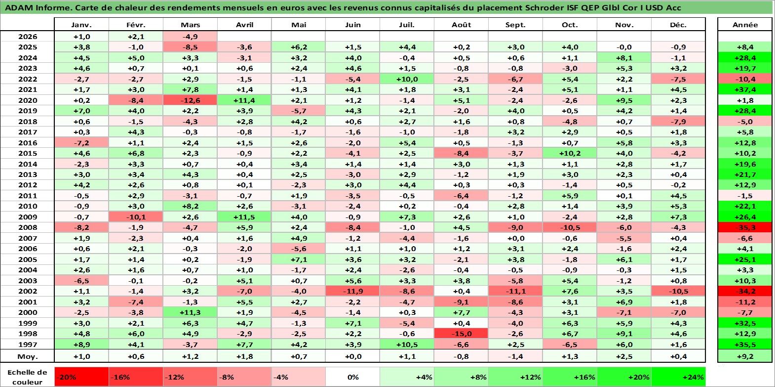 Site dédié aux investisseursPage dédiée sur site financeAnalyse des valorisations hebdomadaires du fonds Schroder ISF QEP Glbl Cor I USD Acc. Cet actif est cote en USD. Les valorisations sont en contrevaleur EURO et couvrent les semaines 1997W01 a 2026W13. Les revenus de cet actif financier sont pris en compte depuis la semaine 1997W01. La note ESG de cet actif n'est pas connue.