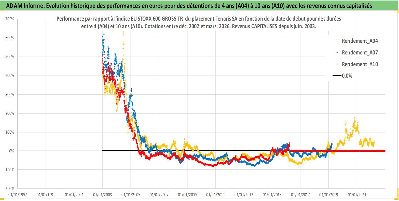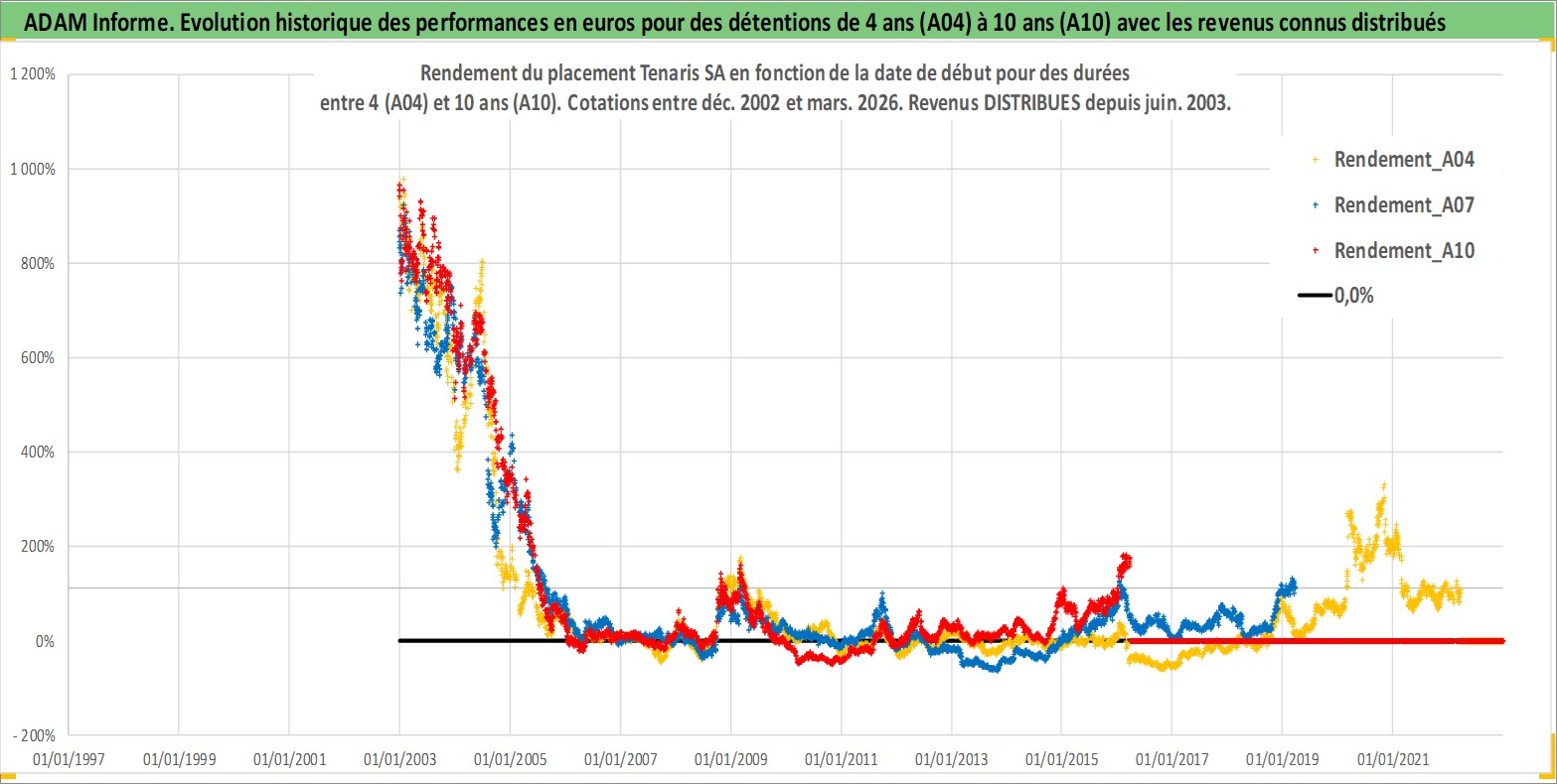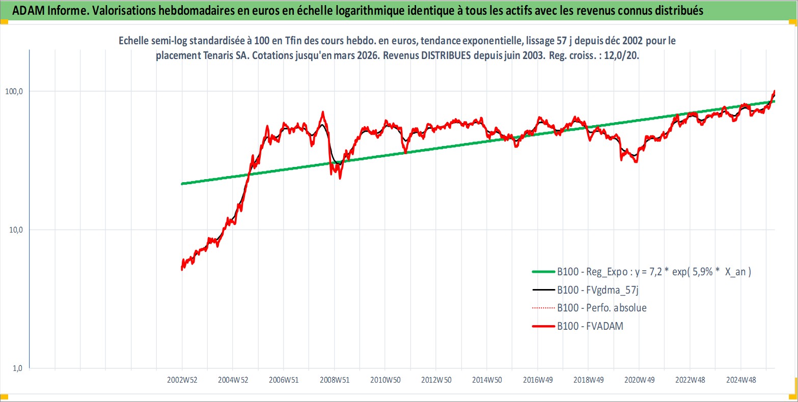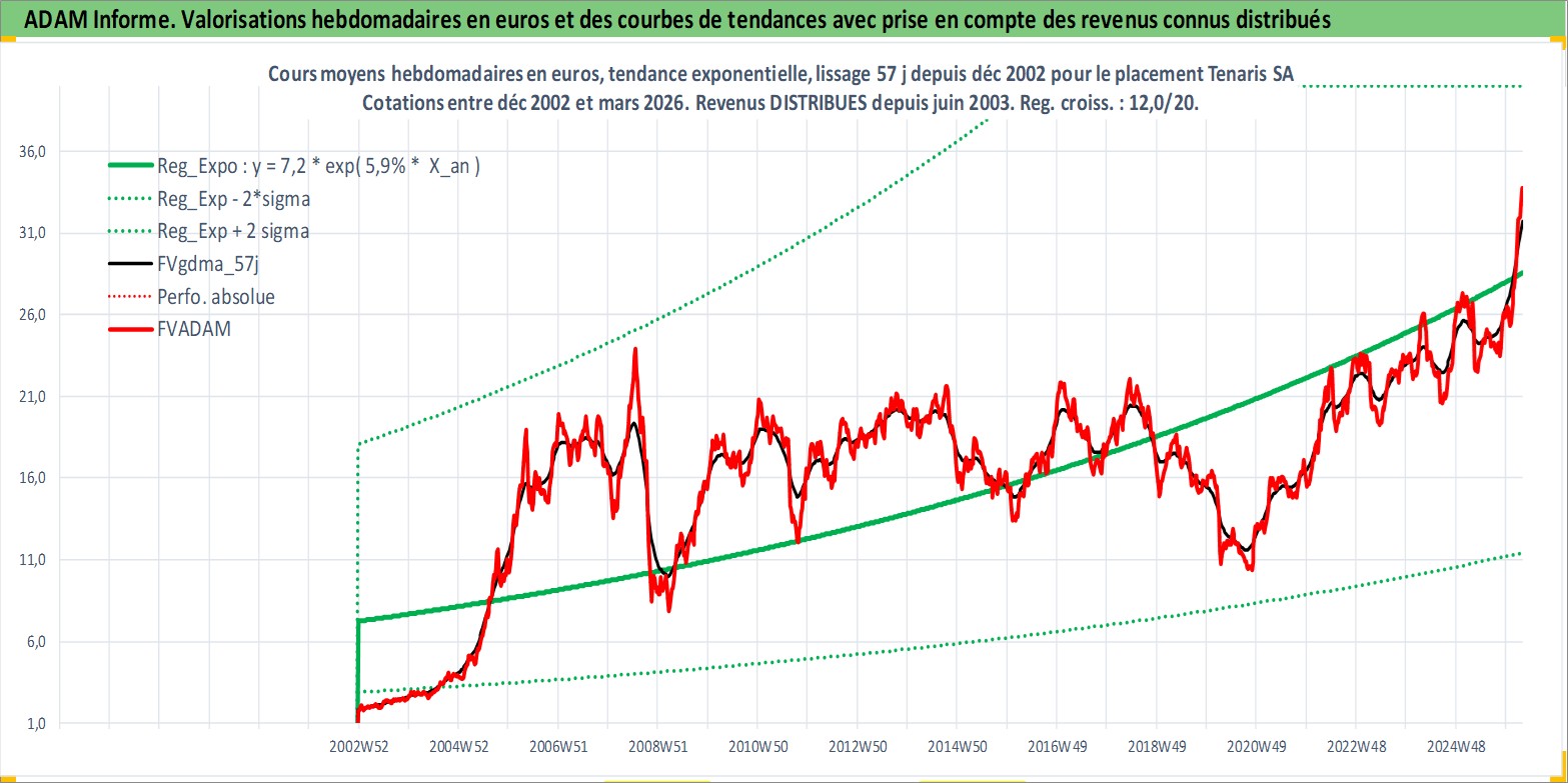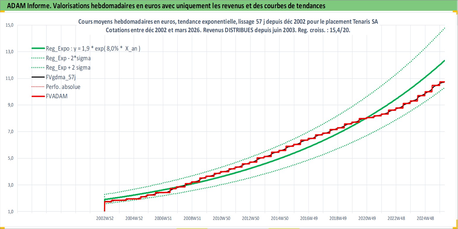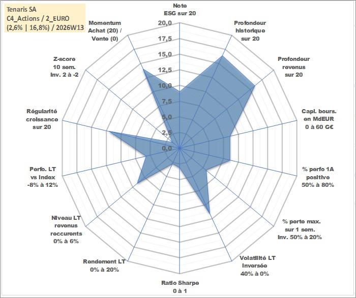 Site dédié aux investisseursPage dédiée sur site financeAnalyse des valorisations hebdomadaires de l'action Tenaris SA. Cet actif est cote en EUR. Les valorisations couvrent les semaines 2002W51 a 2026W13. Les revenus de cet actif financier sont pris en compte depuis la semaine 2003W25. La note globale ESG de cet actif est estimee a 9.0 (apres rebasage entre 0 et 20).