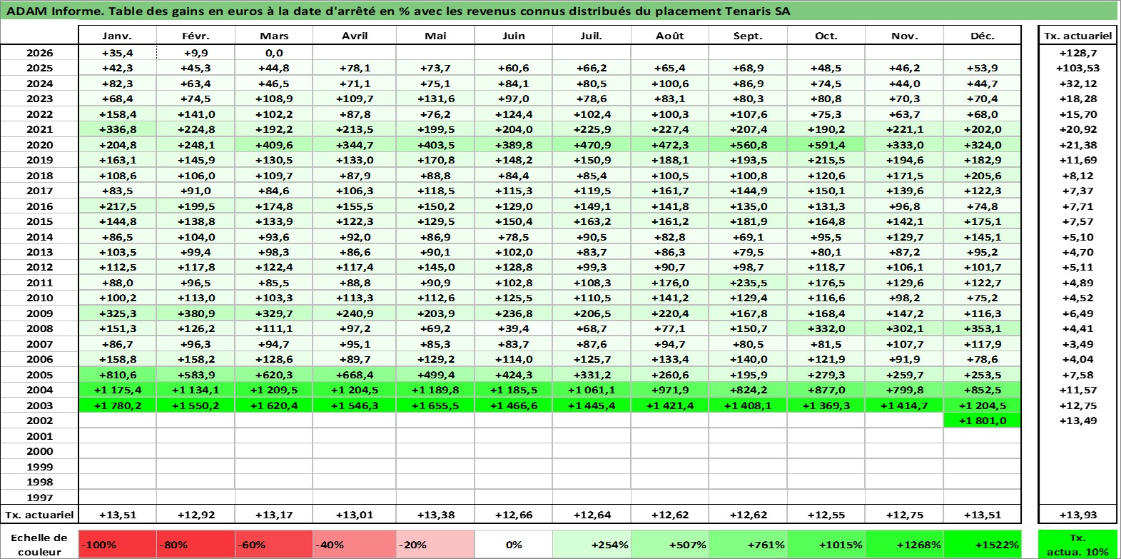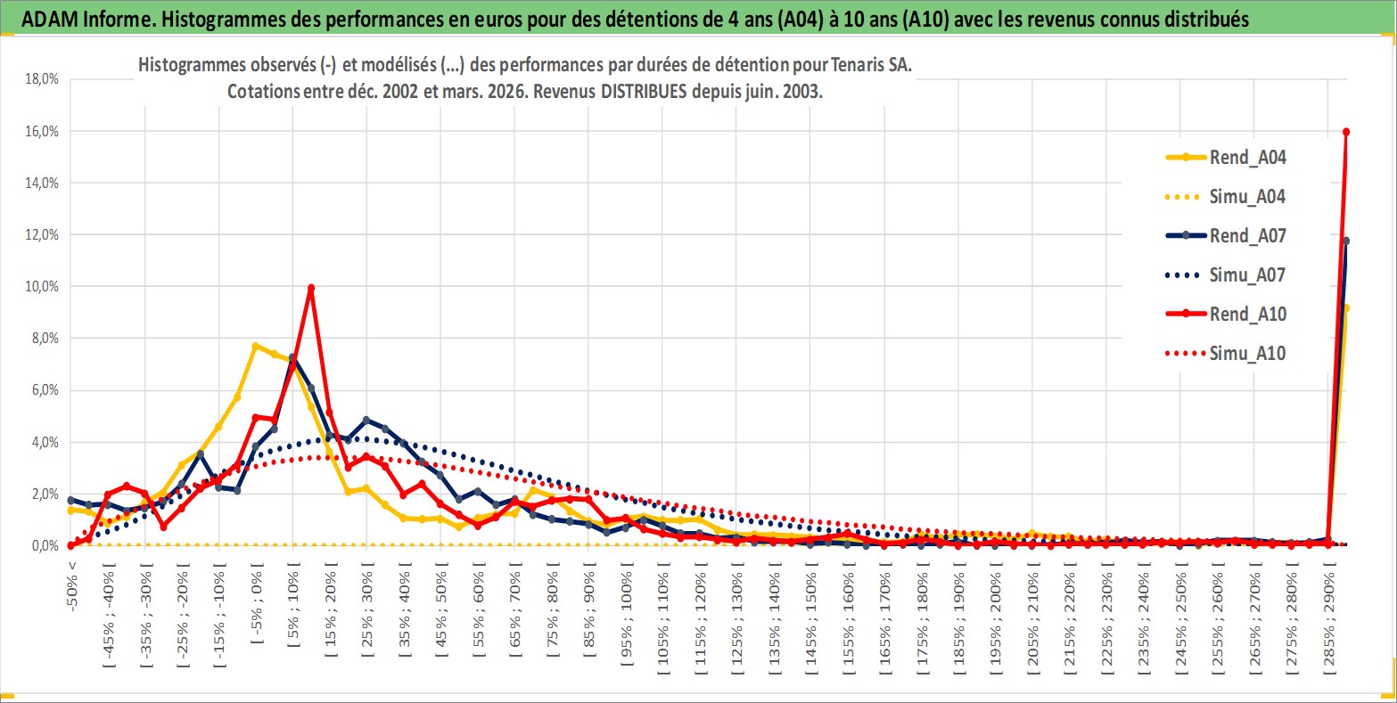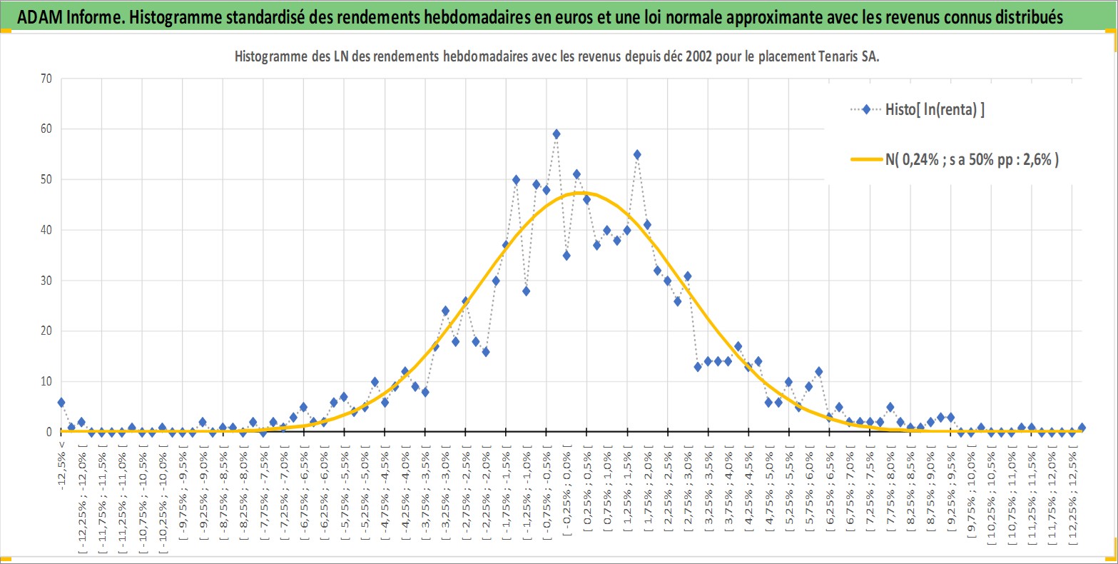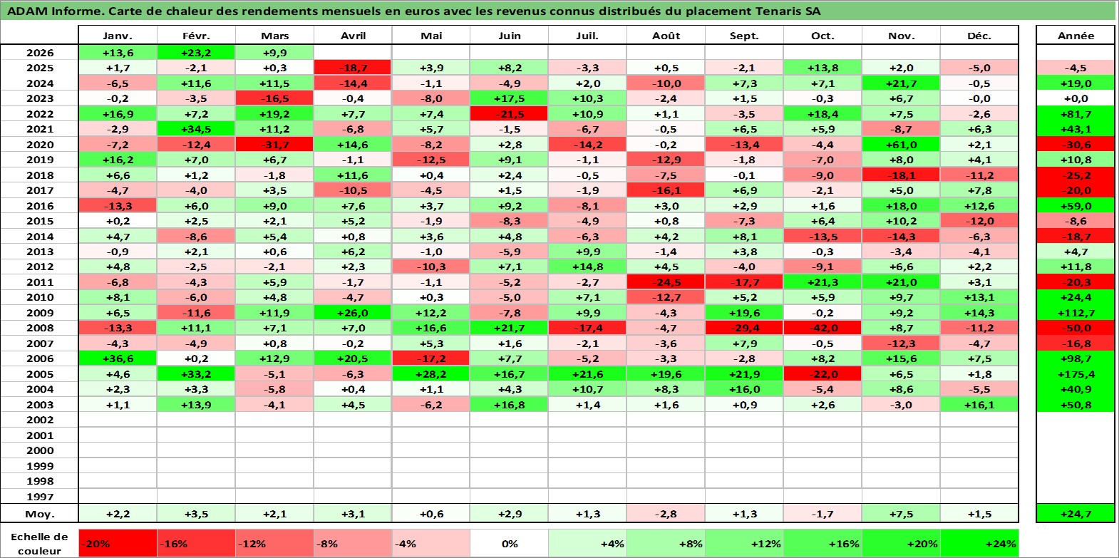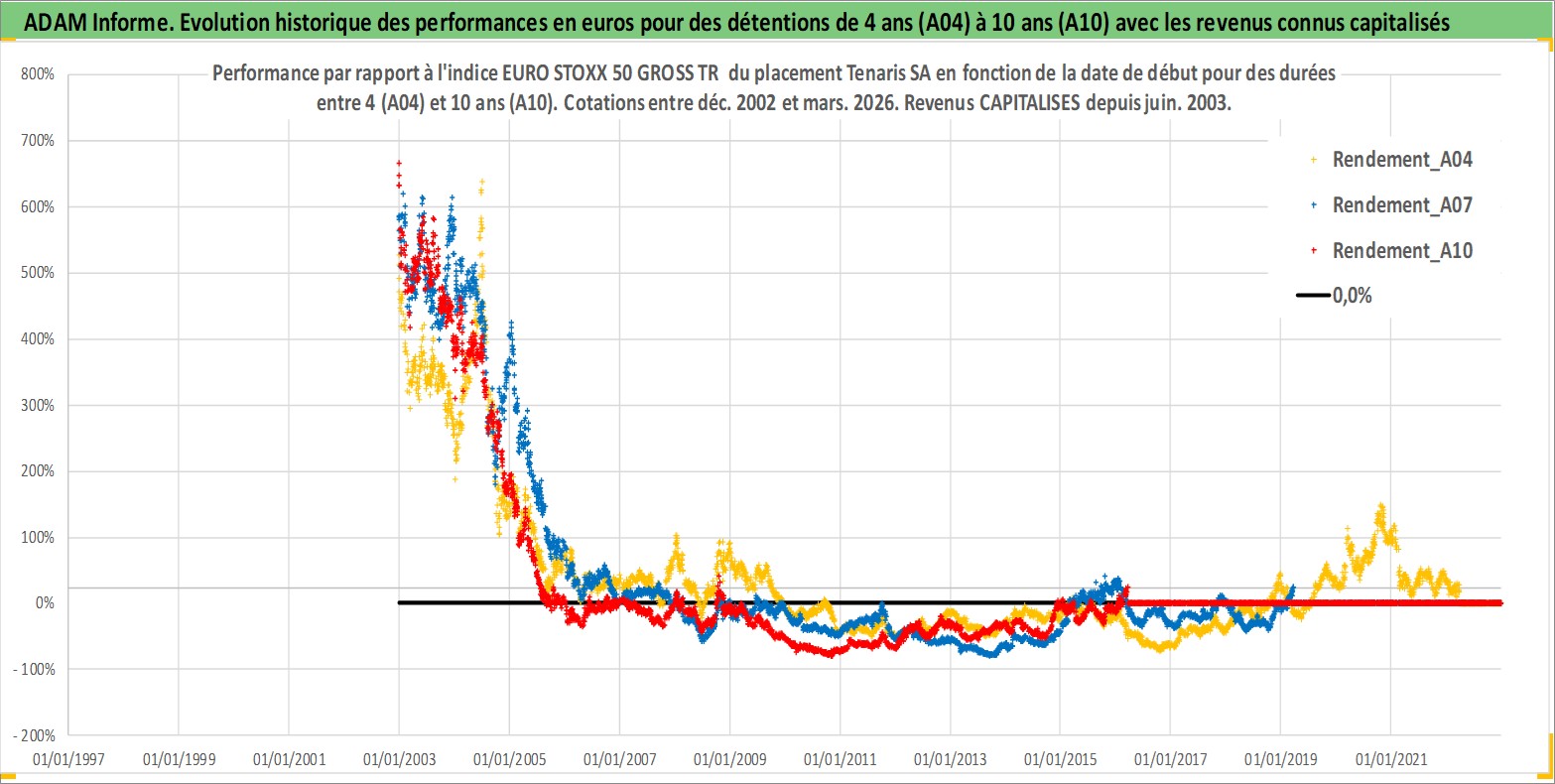 Site dédié aux investisseursPage dédiée sur site financeAnalyse des valorisations hebdomadaires de l'action Tenaris SA. Cet actif est cote en EUR. Les valorisations couvrent les semaines 2002W51 a 2026W13. Les revenus de cet actif financier sont pris en compte depuis la semaine 2003W25. La note globale ESG de cet actif est estimee a 9.0 (apres rebasage entre 0 et 20).