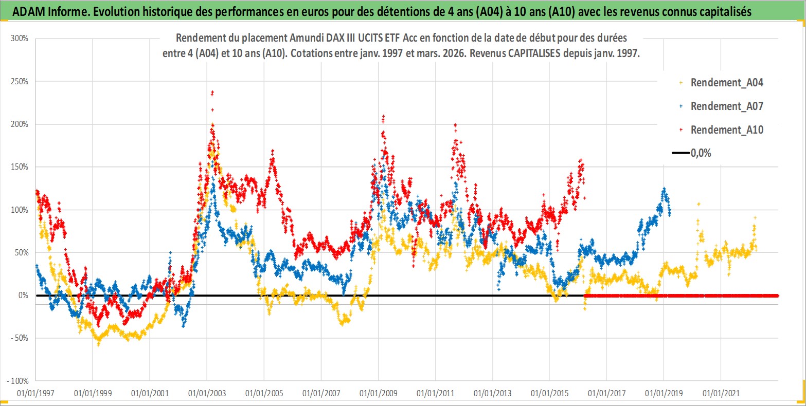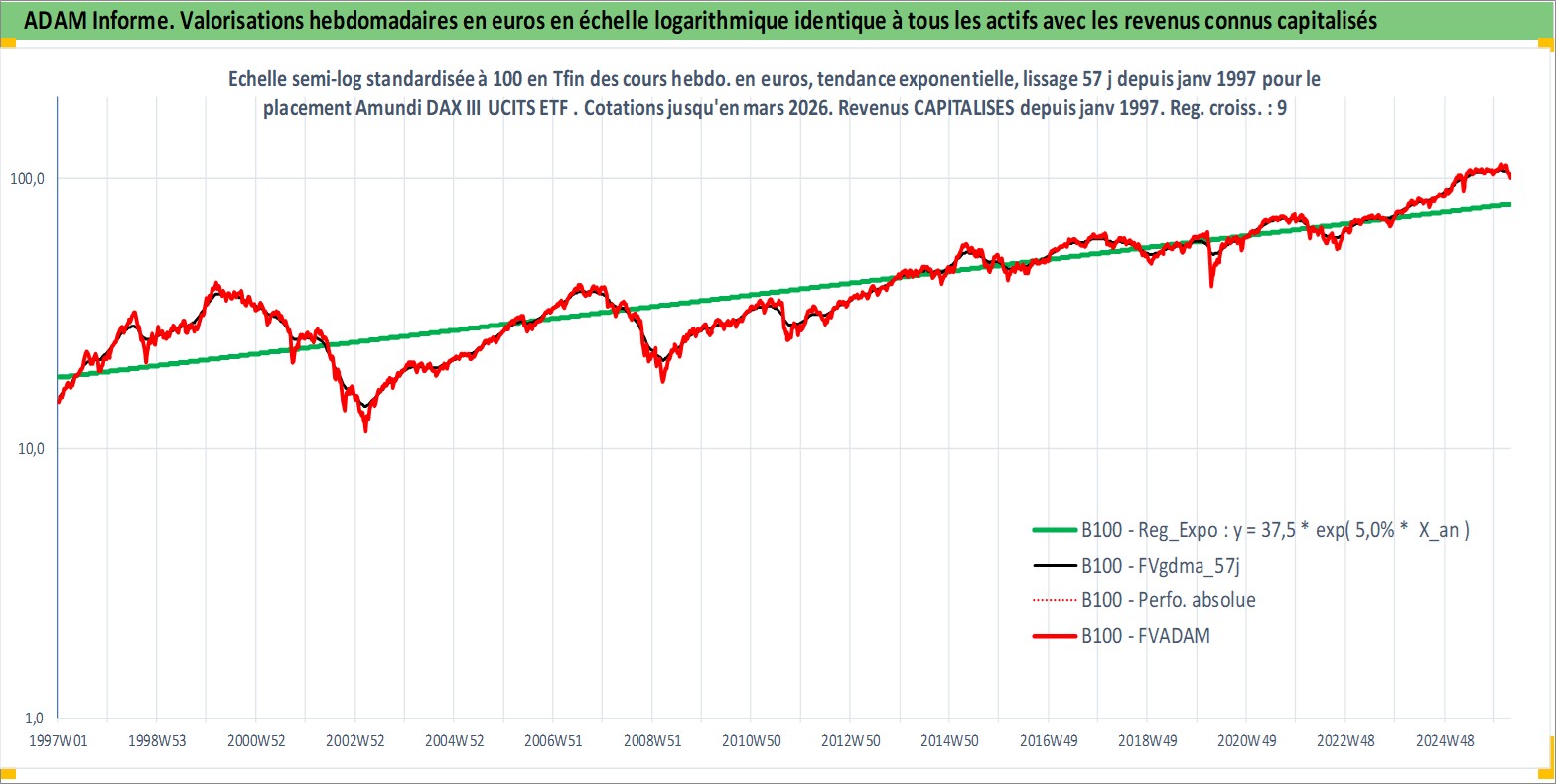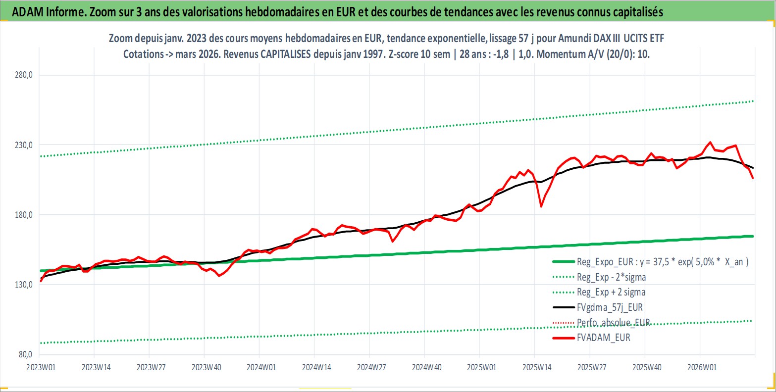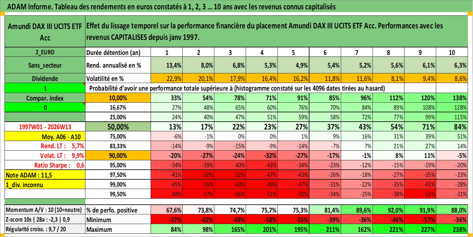 Site dédié aux investisseursPage dédiée sur site financeAnalyse des valorisations hebdomadaires du fonds Amundi DAX III UCITS ETF Acc. Cet actif est cote en EUR. Les valorisations couvrent les semaines 1997W01 a 2026W13. Les revenus de cet actif financier sont pris en compte depuis la semaine 1997W01. La note ESG de cet actif n'est pas connue.