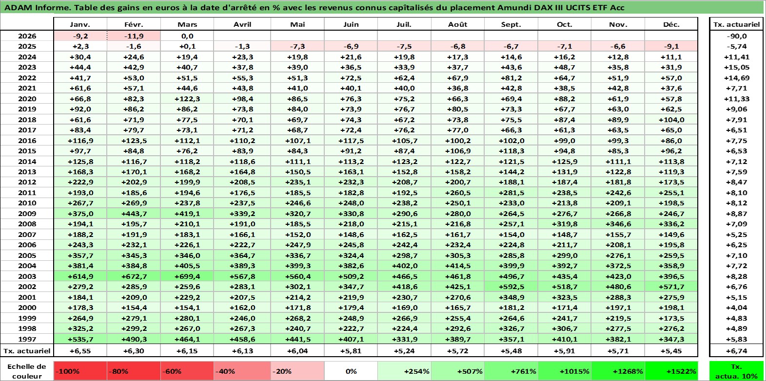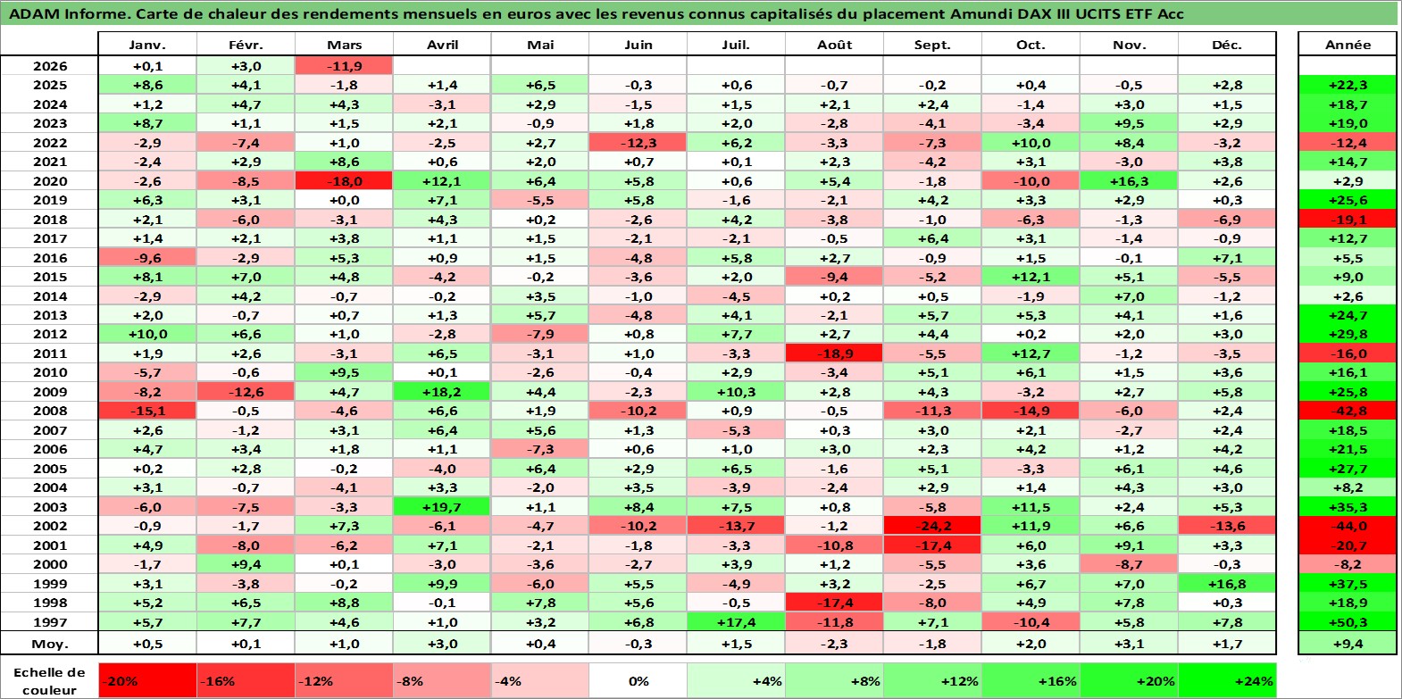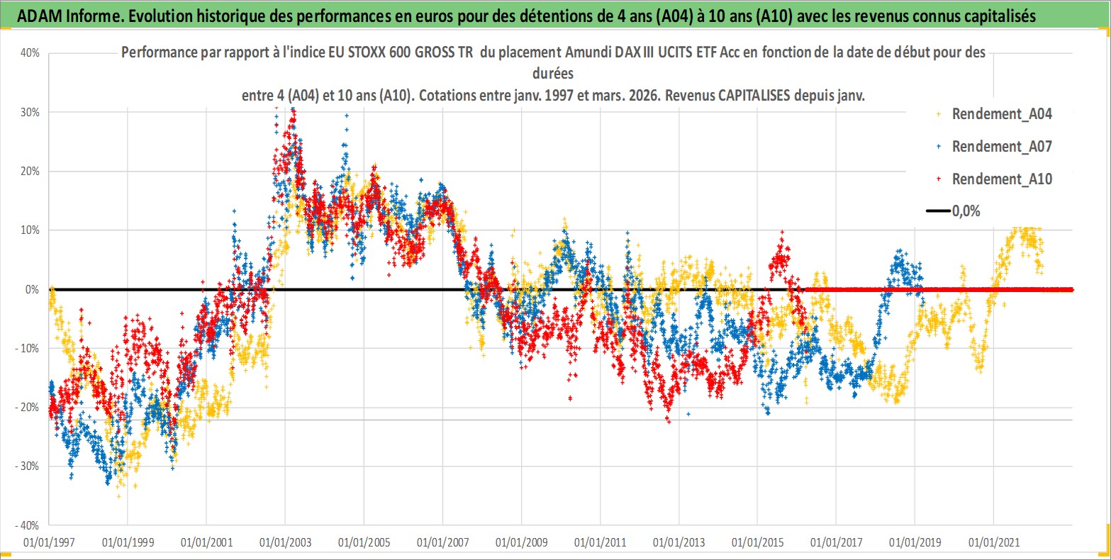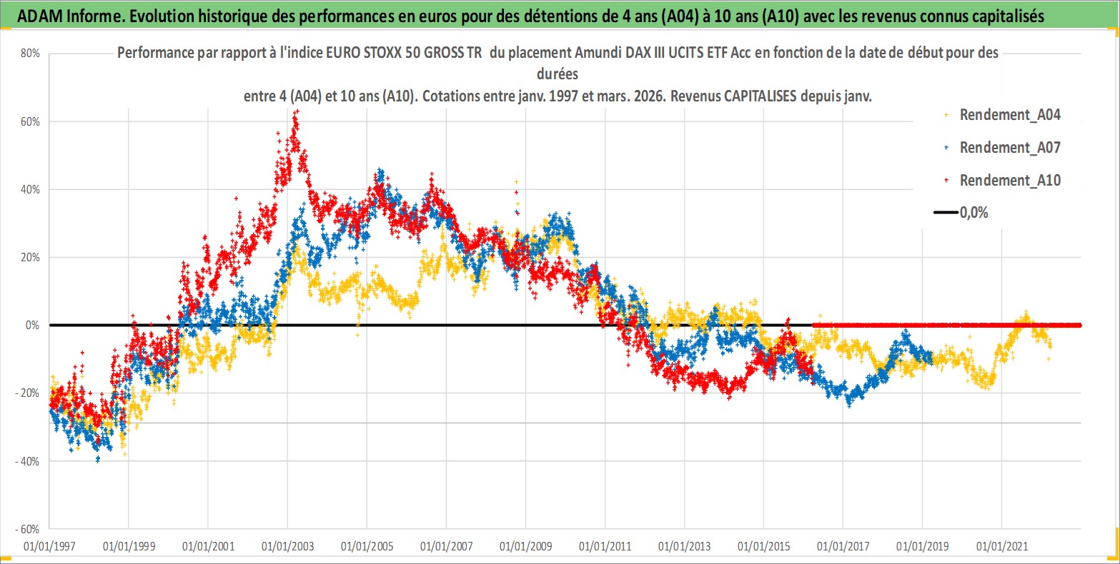 Site dédié aux investisseursPage dédiée sur site financeAnalyse des valorisations hebdomadaires du fonds Amundi DAX III UCITS ETF Acc. Cet actif est cote en EUR. Les valorisations couvrent les semaines 1997W01 a 2026W13. Les revenus de cet actif financier sont pris en compte depuis la semaine 1997W01. La note ESG de cet actif n'est pas connue.