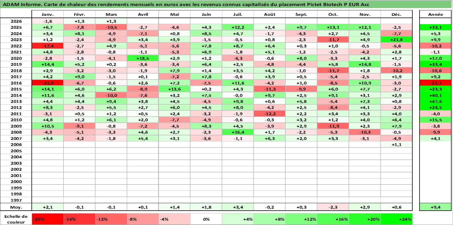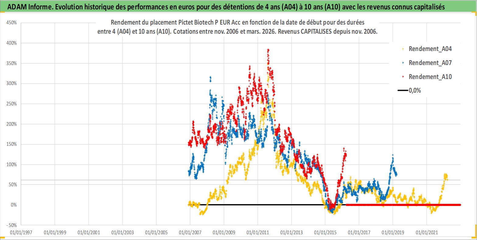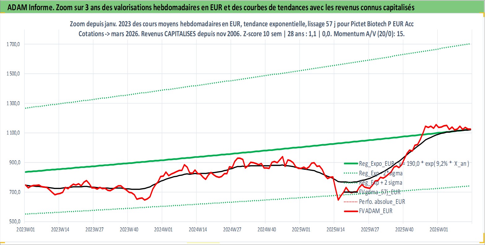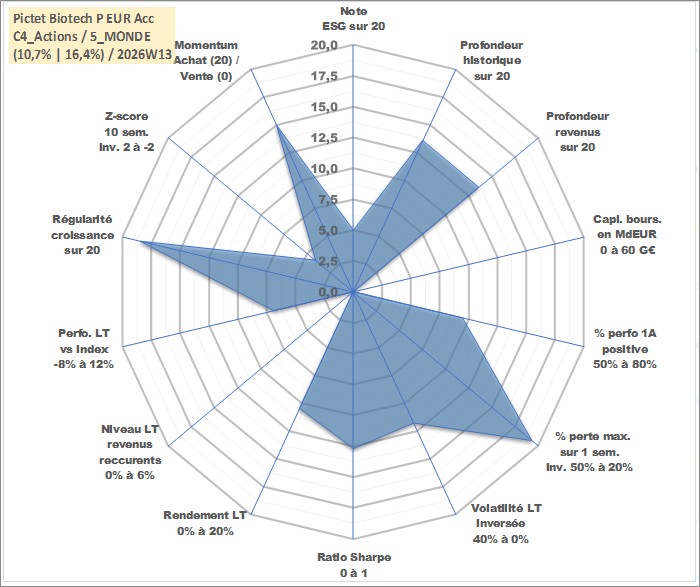 Site dédié aux investisseursPage dédiée sur site financeAnalyse des valorisations hebdomadaires du fonds Pictet Biotech P EUR Acc. Cet actif est cote en EUR. Les valorisations couvrent les semaines 2006W47 a 2026W13. Les revenus de cet actif financier sont pris en compte depuis la semaine 2006W47. La note globale ESG de cet actif est estimee a 5.0 (apres rebasage entre 0 et 20).